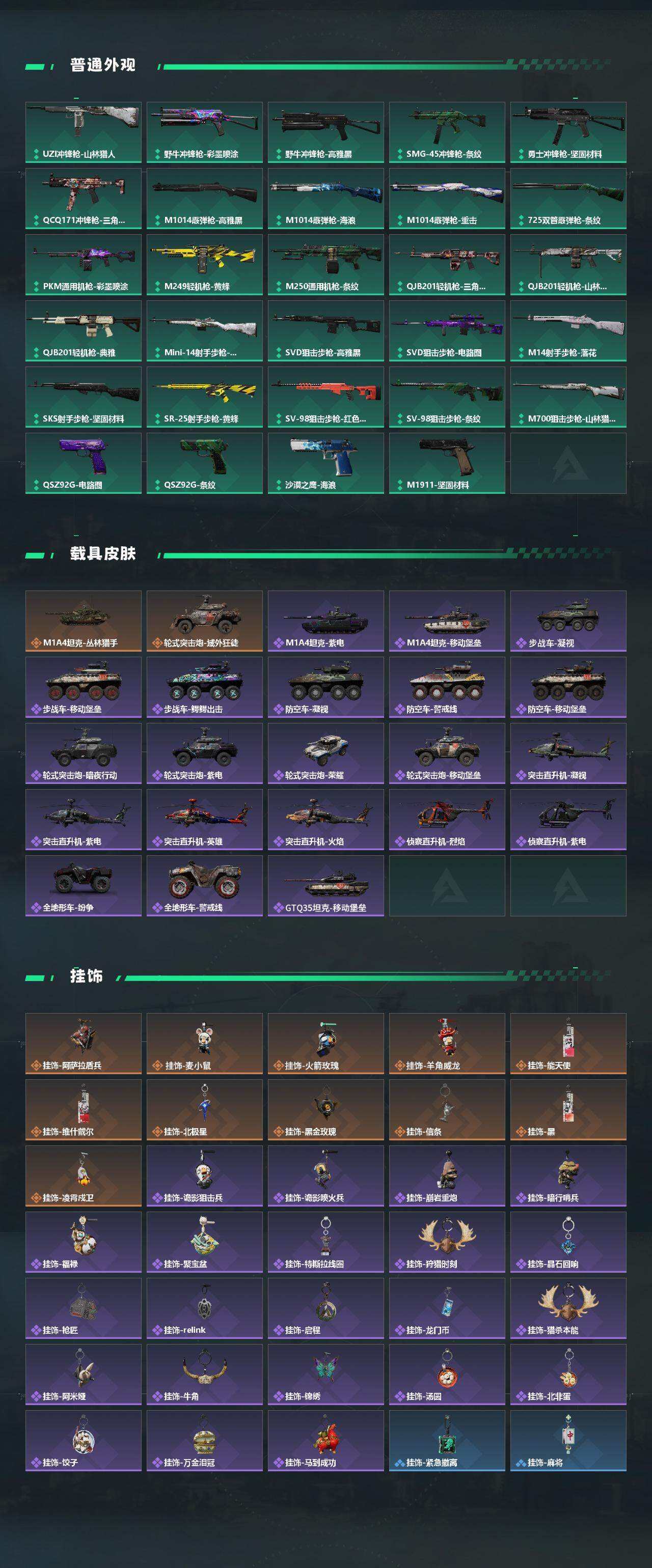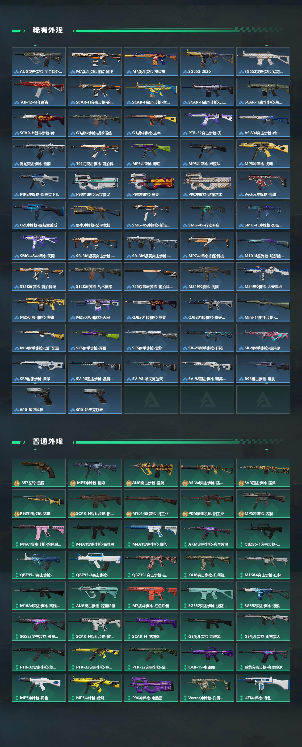 【传说外观】:M4A1突击步枪-蚀金玫瑰,M4A1突击步枪-阿米娅,AKM突击步枪-锦绣,QBZ95-1突击步枪-凌霄戍卫,M16A4突击步枪-狩猎时刻,M7战斗步枪-小肥柴,AK-12突击步枪-夜鹰,AK-12突击步枪-特斯拉线圈,SCAR-H战斗步枪-水墨云图,SCAR-H战斗步枪-启航,G3战斗步枪-狩猎时刻,G3战斗步枪-无机神经元,G3战斗步枪-骑士,CAR-15突击步枪-阿米娅,AS Val突击步枪-死神玫瑰,腾龙突击步枪-死神玫瑰,腾龙突击步枪-马年祥瑞,腾龙突击步枪-万金泪冠,K437突击步枪-北极星,K437突击步枪-锦绣,P90冲锋枪-信条,Vector冲锋枪-狩猎时刻,Vector冲锋枪-能天使-午夜邮差,UZI冲锋枪-特斯拉线圈,SMG-45冲锋枪-锦绣,SR-3M紧凑突击步枪-特斯拉线圈,勇士冲锋枪-能天使-午夜邮差,勇士冲锋枪-万金泪冠,QCQ171冲锋枪-北极星,S12K霰弹枪-电锯惊魂,S12K霰弹枪-无机神经元,S12K霰弹枪-死神玫瑰,725双管霰弹枪-送葬人-无题密令,M250通用机枪-骑士之心,SR-25射手步枪-水墨云图,SR-25射手步枪-信条,R93狙击步枪-维什戴尔,AWM狙击步枪-万金泪冠,G18-马年祥瑞,复合弓-黑·天际线