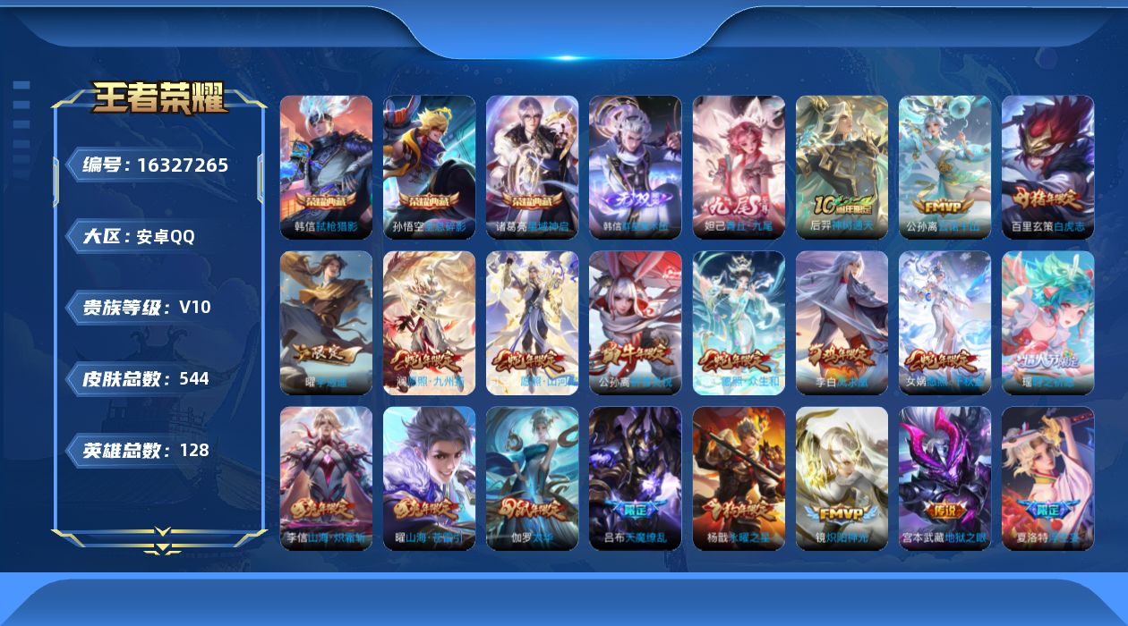 [16327265]安卓Q-V10-128英雄-544皮肤-3典藏皮肤-2无双-61传说-192史诗