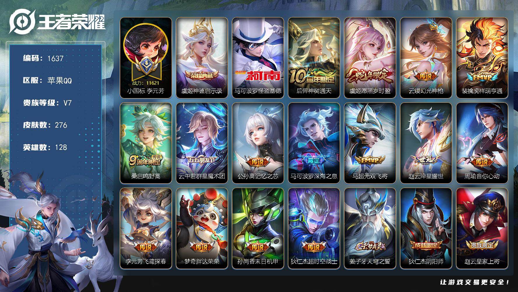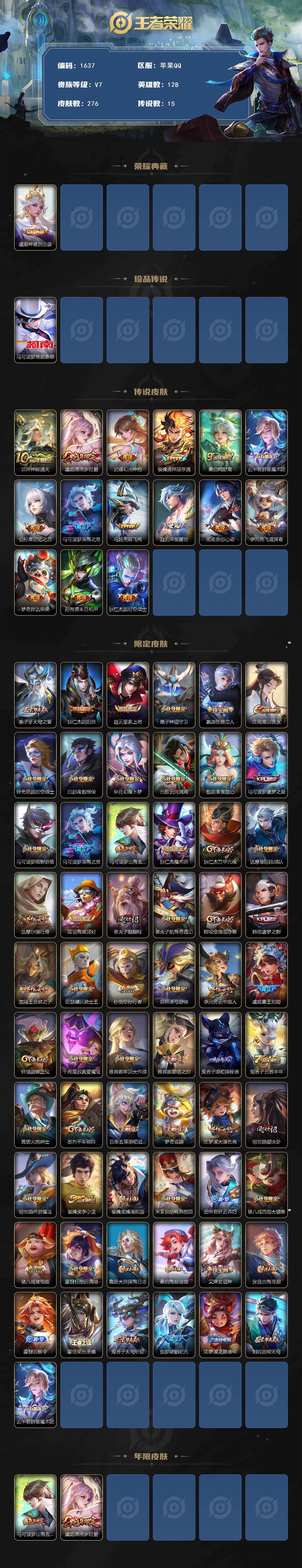[16439386]【1637】苹果Q-V7-最强王者段位-128英雄-276皮肤-1典藏皮肤-1珍品传说-15传说-83史诗