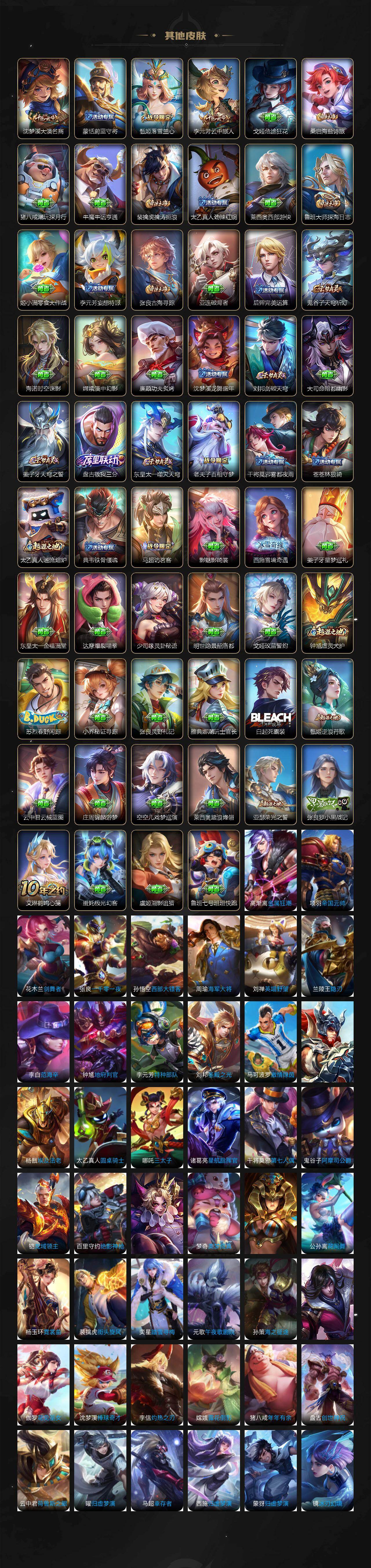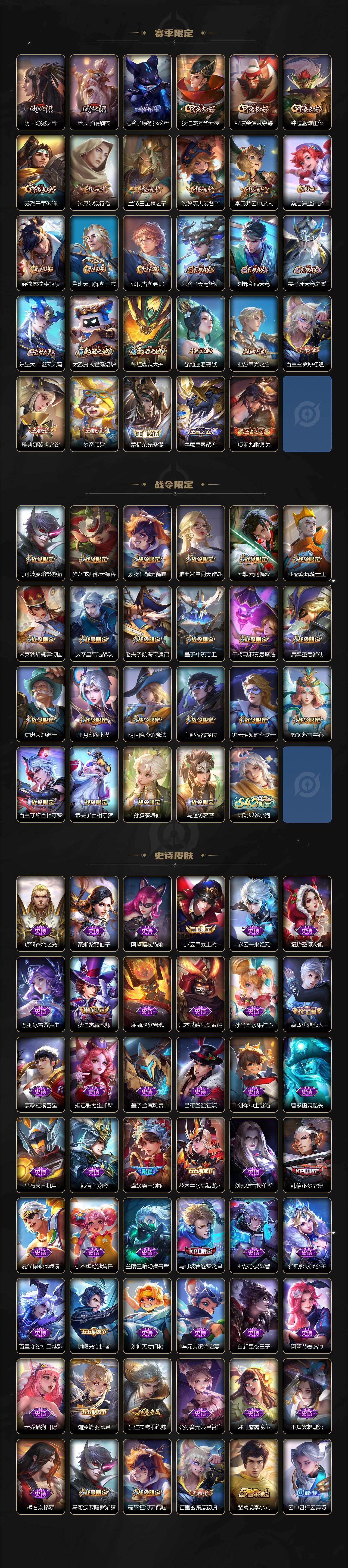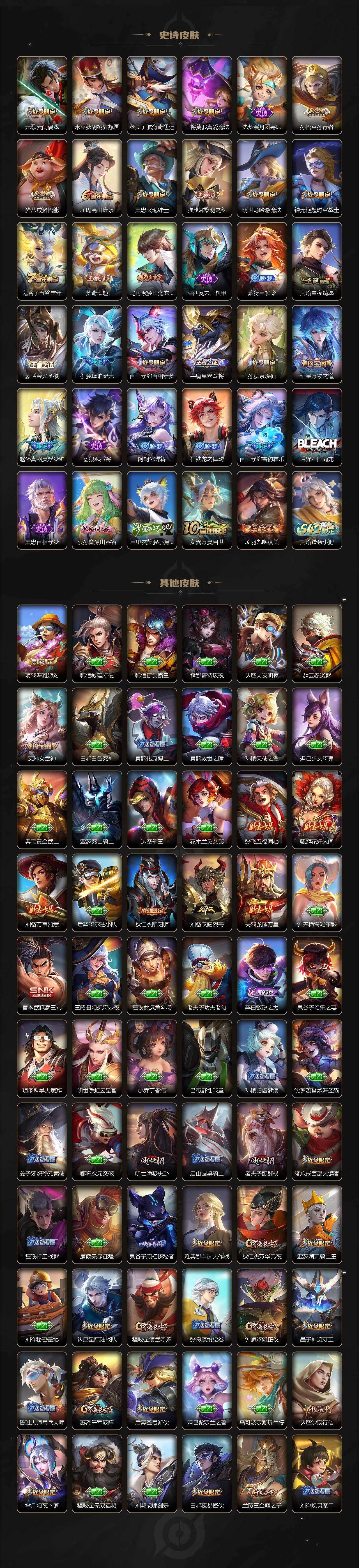 【限定皮肤】:姜子牙天穹之誓,狄仁杰阴阳师,赵云皇家上将,墨子神迹守卫,嬴政优雅恋人,庄周高山流水,钟无艳超时空战士,白起夜都怪侠,芈月幻夜卜梦,元歌云间偶戏,甄姬落雪兰心,马可波罗逐梦之星,马可波罗暗影游猎,马可波罗深海之息,马可波罗山海玄木吟,狄仁杰魔术师,狄仁杰万华元夜,达摩星际陆战队,达摩沙漠行僧,项羽海滩派对,老夫子醍醐杖,老夫子航海奇遇记,程咬金演武夺筹,韩信逐梦之影,兰陵王金庭之子,亚瑟潮玩骑士王,孙悟空孙行者,后羿圣弓游侠,李元芳云中旅人,虞姬霸王别姬,钟馗驱傩正仪,干将莫邪真爱魔法,雅典娜单词大作战,雅典娜黎明之约,鬼谷子原初探秘者,鬼谷子五谷丰年,黄忠火炮绅士,苏烈千军破阵,百里玄策原初追逐者,梦奇顽趣,沈梦溪大漠名商,明世隐疑决卦,明世隐吟游魔法,裴擒虎李小龙,裴擒虎擒涛扼浪,米莱狄胡桃异想国,云中君纤云弄巧,猪八戒西部大镖客,猪八戒猪悟能,蒙犽狂想玩偶喵,鲁班大师探海日志,桑启海盐诗旅,艾琳女武神,张良古海寻踪,蒙犽百解令,蒙恬荣光圣徽,鬼谷子天穹祈灯,伽罗琥珀纪元,沈梦溪龙舞盛年,刘邦剑破天穹,云中君群星魔术团