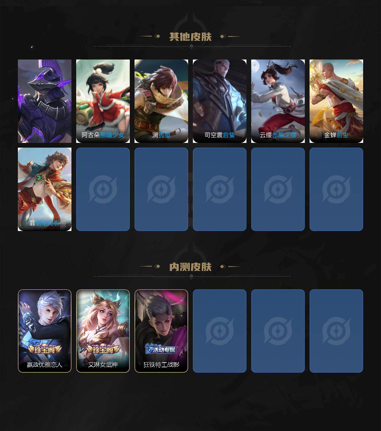 【赛季限定】:明世隐疑决卦,老夫子醍醐杖,鬼谷子原初探秘者,狄仁杰万华元夜,程咬金演武夺筹,钟馗驱傩正仪,苏烈千军破阵,达摩沙漠行僧,兰陵王金庭之子,沈梦溪大漠名商,李元芳云中旅人,桑启海盐诗旅,裴擒虎擒涛扼浪,鲁班大师探海日志,张良古海寻踪,鬼谷子天穹祈灯,刘邦剑破天穹,姜子牙天穹之誓,东皇太一噬灭天穹,太乙真人谧流熔炉,钟馗虚灵犬护,甄姬逆浪荇歌,亚瑟荣光之誓,百里玄策原初追逐者,雅典娜黎明之约,梦奇顽趣,蒙恬荣光圣徽,牛魔星界战将,项羽九幽镇关