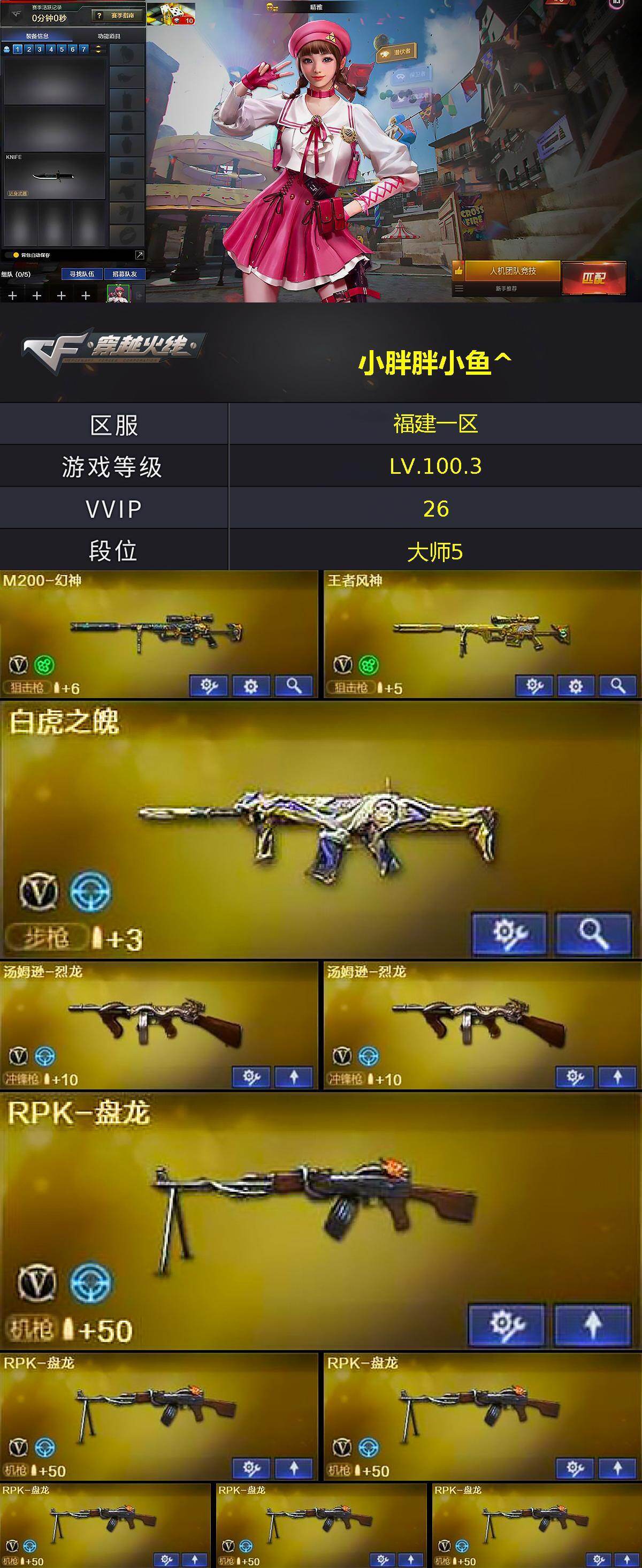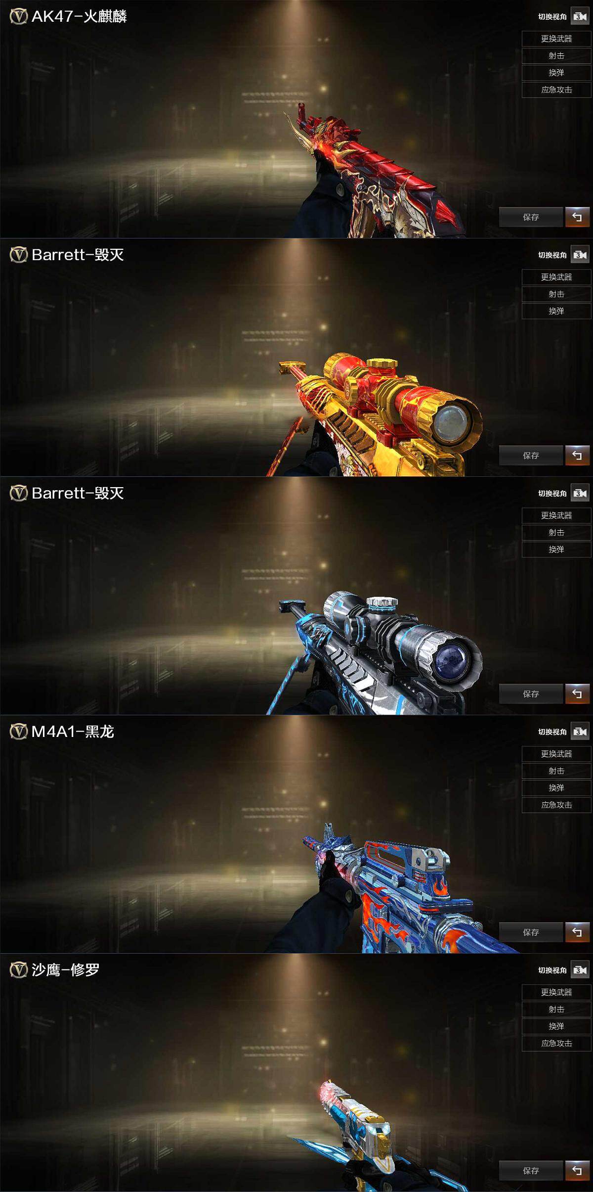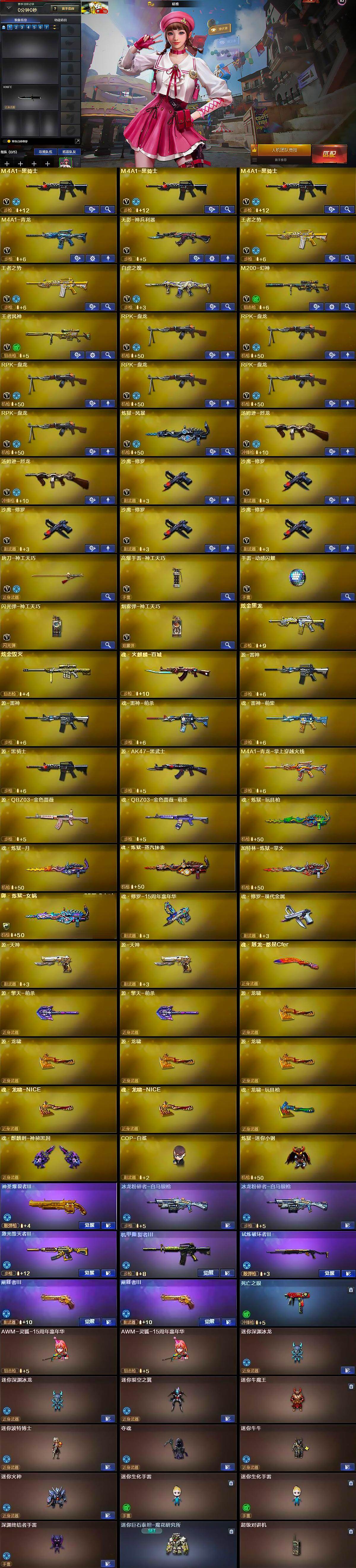 【英雄级武器】:M4A1-黑骑士*3,M4A1-青龙,无影-神兵利器,王者之势-觉醒版*2,白虎之魄-觉醒版,M200-幻神,王者风神-觉醒版,RPK-盘龙*6,炼狱-风暴,汤姆逊-烈龙*2,沙鹰-修罗*5,唐刀-神工天巧,高爆手雷-神工天巧,手雷-动感闪耀,闪光弹-神工天巧,烟雾弹-神工天巧