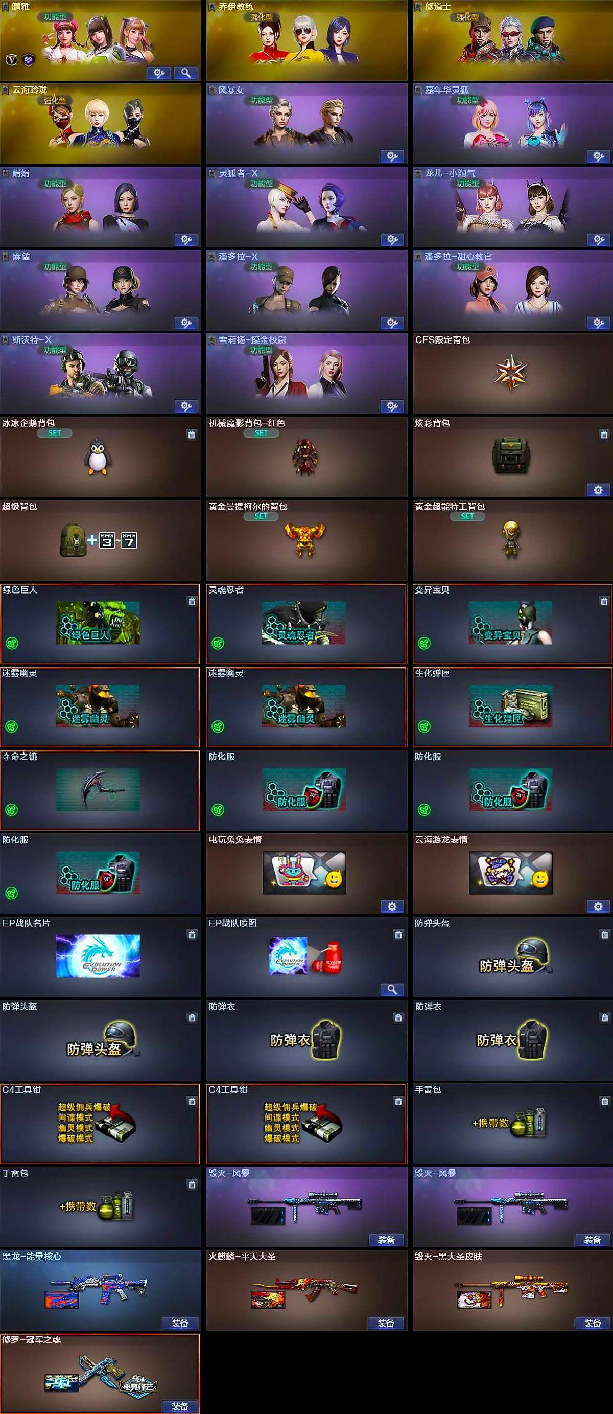 【道具】:CFS限定背包,冰冰企鹅背包,机械魔影背包-红色,炫彩背包,超级背包,黄金曼提柯尔的背包,黄金超能特工背包,绿色巨人,灵魂忍者,变异宝贝,迷雾幽灵*2,生化弹匣,夺命之镰,防化服*3,电玩兔兔表情,云海游龙表情,EP战队名片,EP战队喷图,防弹头盔*2,防弹衣*2,C4工具钳*2,手雷包*2