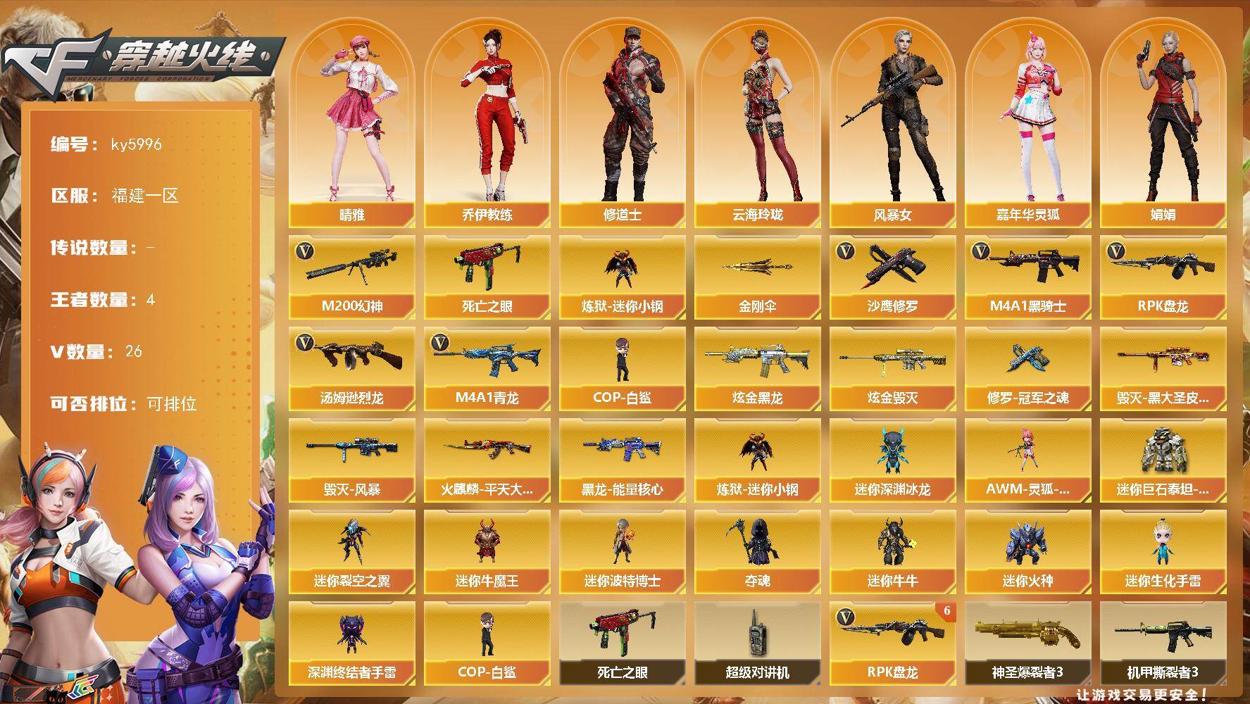 [17155374]福建一区-36V-4王者武器数-2炫金武器数 【热门武器】:M4A1-青龙,M200-幻神,死亡之眼,炼狱-迷你小钢,M4A1-黑骑士*3,汤姆逊-烈龙*2,RPK-盘龙*6,COP-白鲨,沙鹰-修罗*5,金刚伞 【王者炫金武器】:炫金黑龙,炫金毁灭 【皮肤】:火麒麟-平天大圣,毁灭-黑大圣皮肤,毁灭-风暴*2,黑龙-能量核心,修罗-冠军之魂 【角色】:晴雅,乔伊教练,修道士,云海玲珑,风暴女,嘉年华灵狐,娟娟,灵狐者-X,龙儿-小淘气,麻雀,潘多拉-X,潘多拉-甜心教官,斯沃特-X,雪莉杨-摸金校尉 【人偶武器】:COP-白鲨,炼狱-迷你小钢,AWM-灵狐-15周年嘉年华*2,迷你深渊冰龙*2,迷你裂空之翼,迷你牛魔王,迷你波特博士,夺魂,迷你牛牛,迷你火种,迷你生化手雷*2,深渊终结者手雷,迷你巨石泰坦-魔花研究所 【暴走生化】:死亡之眼,超级对讲机 【挑战大师】:神圣爆裂者III,冰龙粉碎者-白马银枪*2,激光毁灭者III,机甲撕裂者III,试炼破坏者III,阐释者III*2 【英雄级武器】:M4A1-黑骑士*3,M4A1-青龙,无影-神兵利器,王者之势-觉醒版*2,白虎之魄-觉醒版,M200-幻神,王者风神-觉醒版,RPK-盘龙*6,炼狱-风暴,汤姆逊-烈龙*2,沙鹰-修罗*5,唐刀-神工天巧,高爆手雷-神工天巧,手雷-动感闪耀,闪光弹-神工天巧,烟雾弹-神工天巧 【道具】:CFS限定背包,冰冰企鹅背包,机械魔影背包-红色,炫彩背包,超级背包,黄金曼提柯尔的背包,黄金超能特工背包,绿色巨人,灵魂忍者,变异宝贝,迷雾幽灵*2,生化弹匣,夺命之镰,防化服*3,电玩兔兔表情,云海游龙表情,EP战队名片,EP战队喷图,防弹头盔*2,防弹衣*2,C4工具钳*2,手雷包*2 【特殊枪械】:3黑骑士,2烈龙,6盘龙