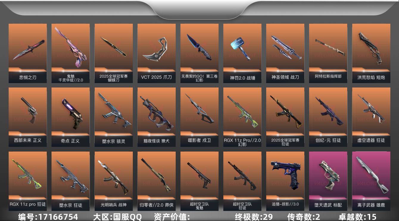 [17166754]【套装】:2025全球冠军赛套装,无畏契约季前邀请赛套装,回火礼包// V25套装,VCT 2025 赛季套装,掠影//3.0套装,回火礼包:掠影套装 【英雄】:幻棱,炼狱,维斯,暮蝶,壹决,铁臂,捷风,幽影,不死鸟,贤者,猎枭,蝰蛇,零,芮娜,奇乐,尚勃勒,霓虹,斯凯,夜露,星礈,K/O,海神,盖可,黑梦,钢锁 【近战武器】:近战武器-2025全球冠军赛 蝴蝶刀,近战武器-影蝶,近战武器-无畏契约季前邀请赛 悲悯之刃,近战武器-无畏契约GO!第三卷 匕首,近战武器-VCT 2025 爪刀,近战武器-黑波之刃,近战武器-神罚//2.0 战锤,近战武器-神圣领域 战刀,近战武器-阿特拉斯指挥部 甩棍 【狂徒】:狂徒-超时空卫队,狂徒-2025全球冠军赛,狂徒-塑水宗,狂徒-创·纪元,狂徒-虚空遗器,狂徒-RGX 11z Pro,狂徒-掠影,狂徒-赤焰铁骥,狂徒-诡秘蛇影 【幻影】:幻影-RGX 11z Pro//2.0,幻影-盖亚的复仇//2.0,幻影-天界神兵//2.0,幻影-异鳞魔蛇,幻影-神中神罚,幻影-掠影//2.0,幻影-神圣领域,幻影-末日之翼 【戍卫】:戍卫-噬影者,戍卫-掠影,戍卫-天界神兵,戍卫-月球哨兵,戍卫-折光棱晶 【獠犬】:獠犬-黯夜怪谈,獠犬-神圣领域 【冥驹】:冥驹-堕天遗武,冥驹-掠影,冥驹-星云暗涌 【飞将】:飞将-末日之翼 【莽侠】:莽侠-归零者//2.0,莽侠-诡秘蛇影,莽侠-月球哨兵 【战神】:战神-光明哨兵,战神-神圣领域 【奥丁】:奥丁-掠影//2.0,奥丁-末日之翼 【判官】:判官-诡秘蛇影 【雄鹿】:雄鹿-离子武器,雄鹿-月球哨兵 【骇灵】:骇灵-塑水宗,骇灵-无限竞技,骇灵-星云暗涌 【蜂刺】:蜂刺-星云暗涌,蜂刺-折光棱晶 【追猎】:追猎-掠影//3.0 【标配】:标配-堕天遗武,标配-折光棱晶 【正义】:正义-奇点,正义-西部未来,正义-月球哨兵 【鬼魅】:鬼魅-超时空卫队,鬼魅-千灵华绽//2.0,鬼魅-星云暗涌 【狂怒】:狂怒-神圣领域 【短炮】:短炮-洪荒怒焰,短炮-末日之翼 【卡面】:南瓜盛典 卡面,树懒大作战 卡面,Clutch 卡面,无畏契约GO!第一卷:芮娜 卡面,无畏契约GO!第一卷:零 卡面,无垠星环 卡面,《双城之战》金克丝 卡面,无畏契约GO!第一卷:贤者 卡面,代号红色 卡面,新兵报到 卡