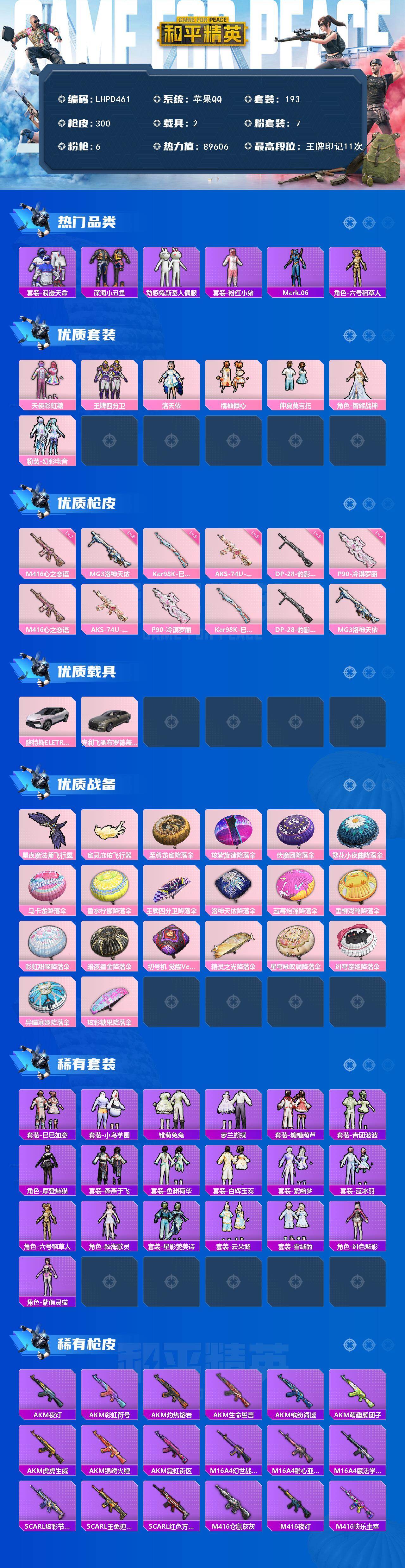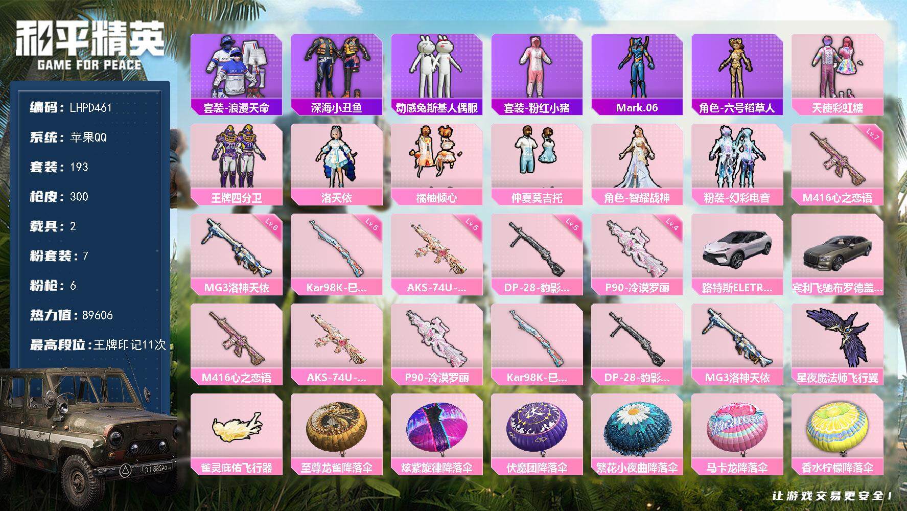 [17153293]【店主推荐捡漏号!可直接换绑】苹果 手Q-7粉装-6特效枪-2载具-2粉色飞行器-89606热力值-11王牌印记-193套装-300枪皮【热门品类】:套装-浪漫天命,套装-深海小丑鱼,套装-动感兔斯基人偶服,套装-粉红小猪,角色-Mark.06,角色-六号稻草人【粉色套装】:粉装-天使彩虹糖,粉装-王牌四分卫,角色-洛天依,粉装-橘柚倾心,粉装-仲夏莫吉托,角色-智耀战神,粉装-幻彩电音【粉色枪皮等级】:M416-心之恋语(七级),AKS-74U-星穹咏叹调(五级),P90-冷漠罗丽(四级),Kar98K-巳巳如意(五级),DP-28-豹影疾电(五级),MG3-洛神天依(六级)【粉色载具】:路特斯ELETRE(花绽灰),宾利飞驰(布罗德盖棕双色)【粉色枪皮】:M416-心之恋语,AKS-74U-星穹咏叹调,P90-冷漠罗丽,Kar98K-巳巳如意,DP-28-豹影疾电,MG3-洛神天依【粉色飞行器】:星夜魔法师飞行翼,雀灵庇佑飞行器