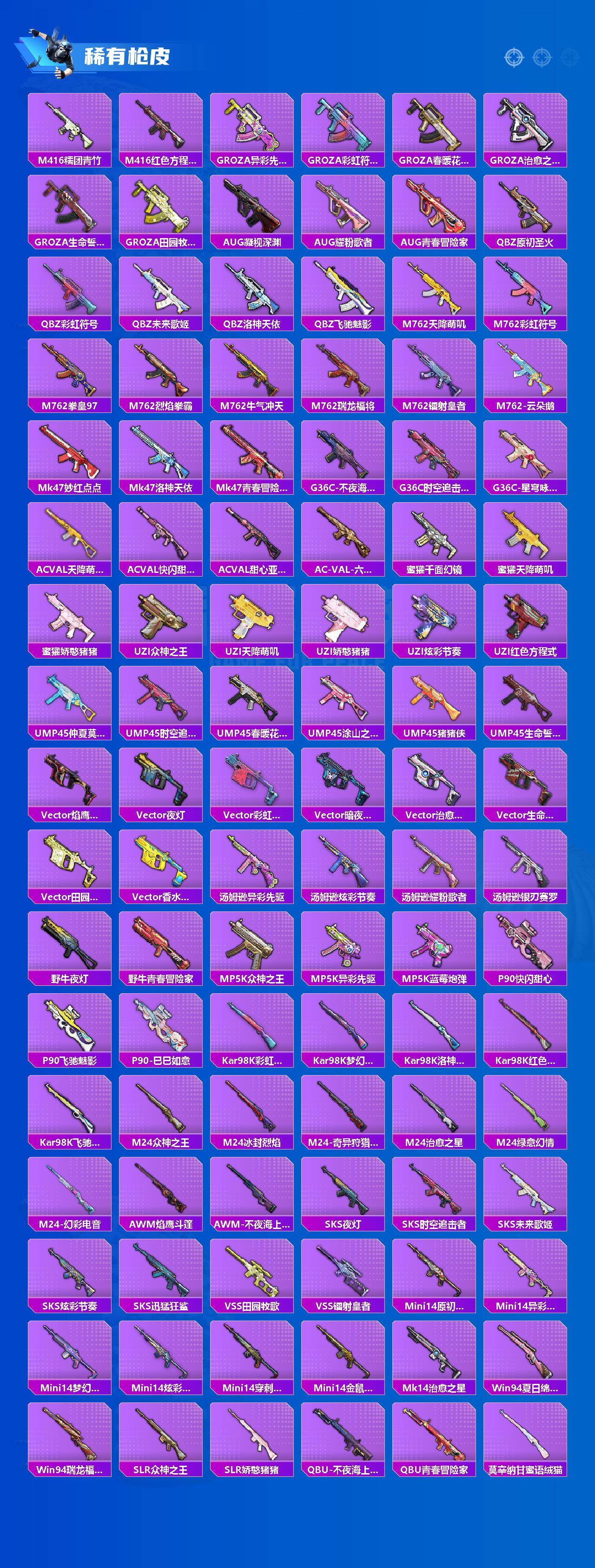 AKM-缤纷海域,M416-仓鼠灰灰,M416-快乐主宰,M762-瑞龙福将,M24-奇异狩猎者