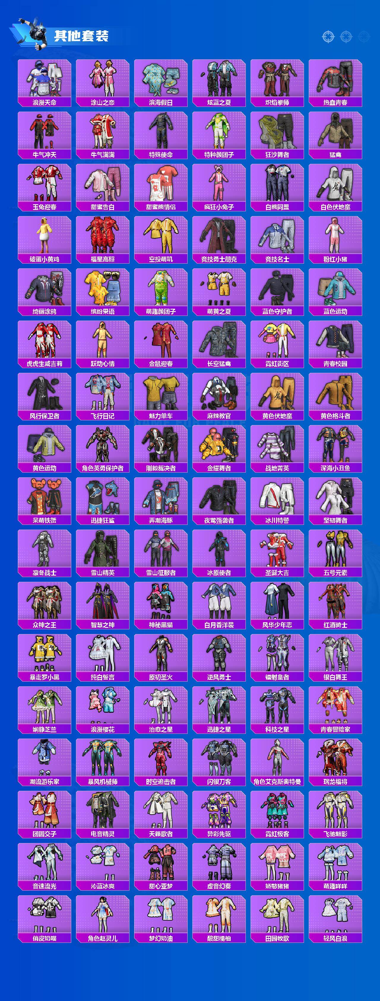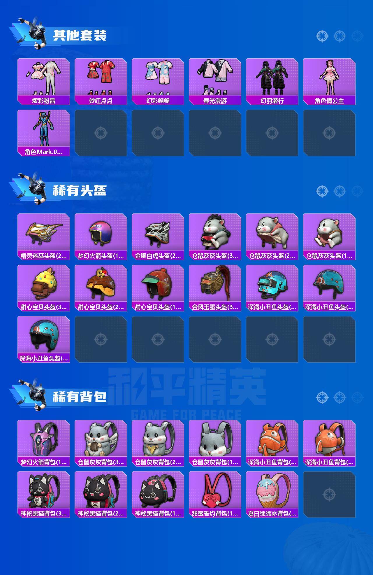 套装-深海小丑鱼,套装-天使彩虹糖,套装-王牌四分卫,角色-洛天依,套装-橘柚倾心,套装-仲夏莫吉托,奇迹天团套装,套装-呆萌铁蟹,套装-迅捷狂鲨,套装-神秘黑猫,套装-暴走罗小黑