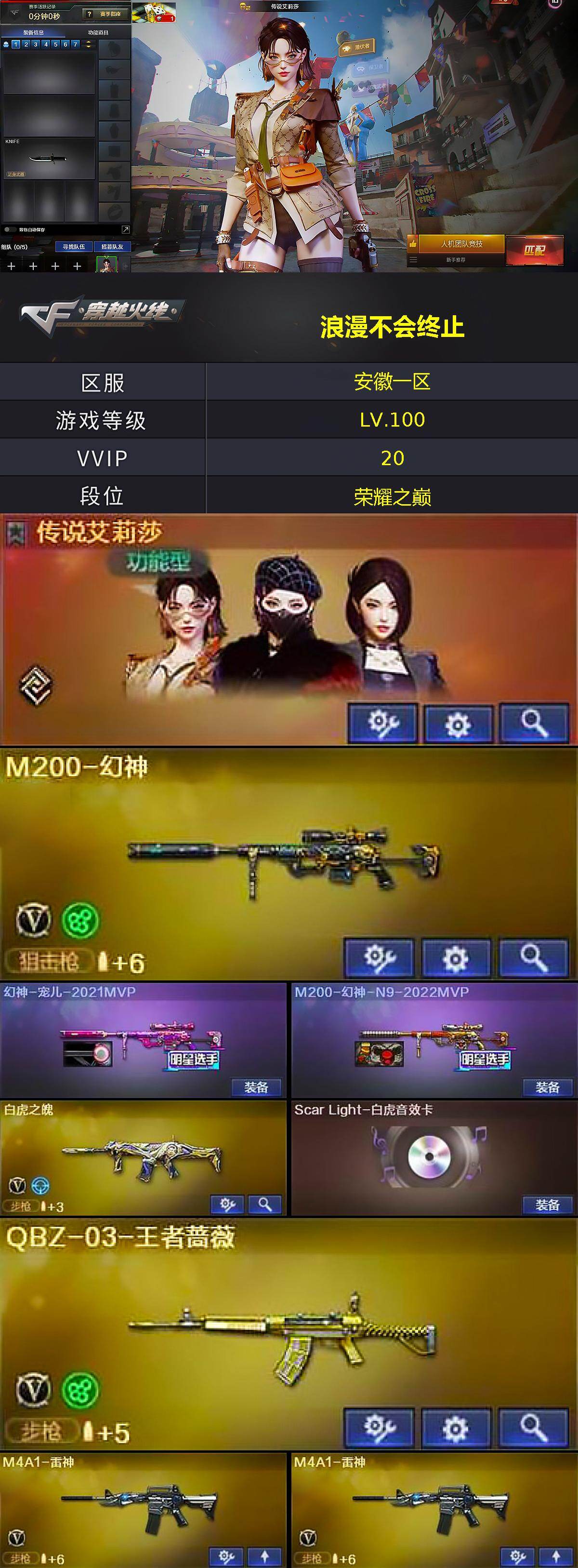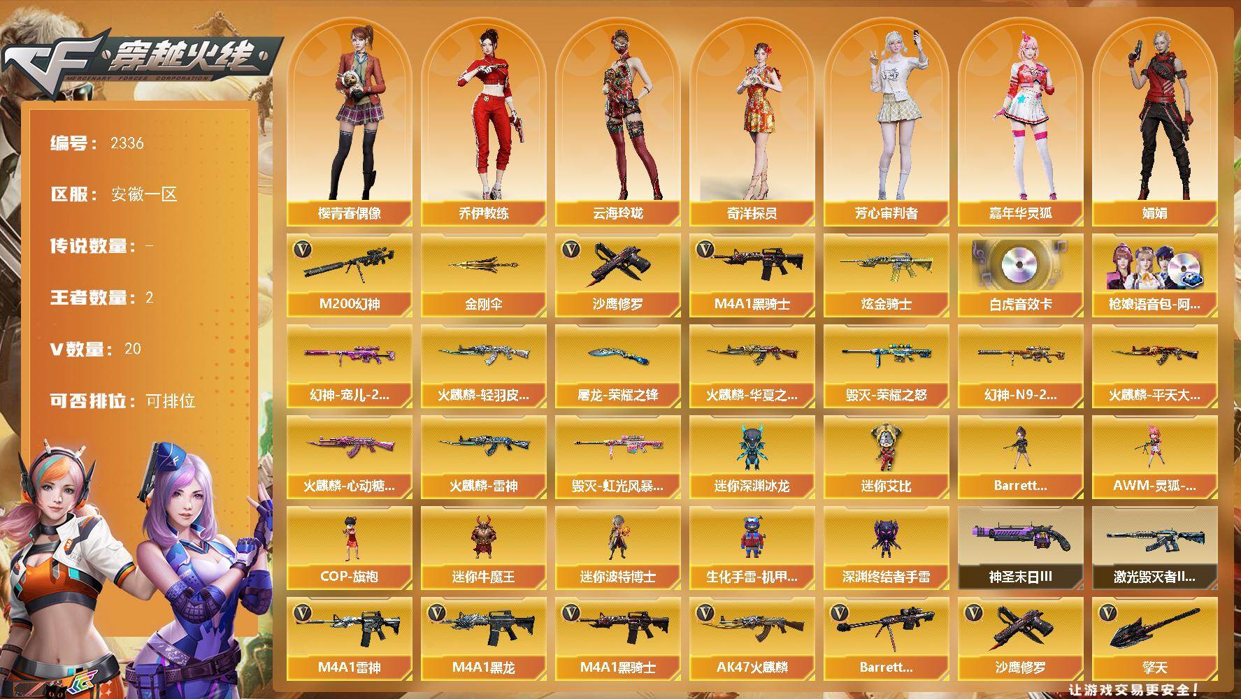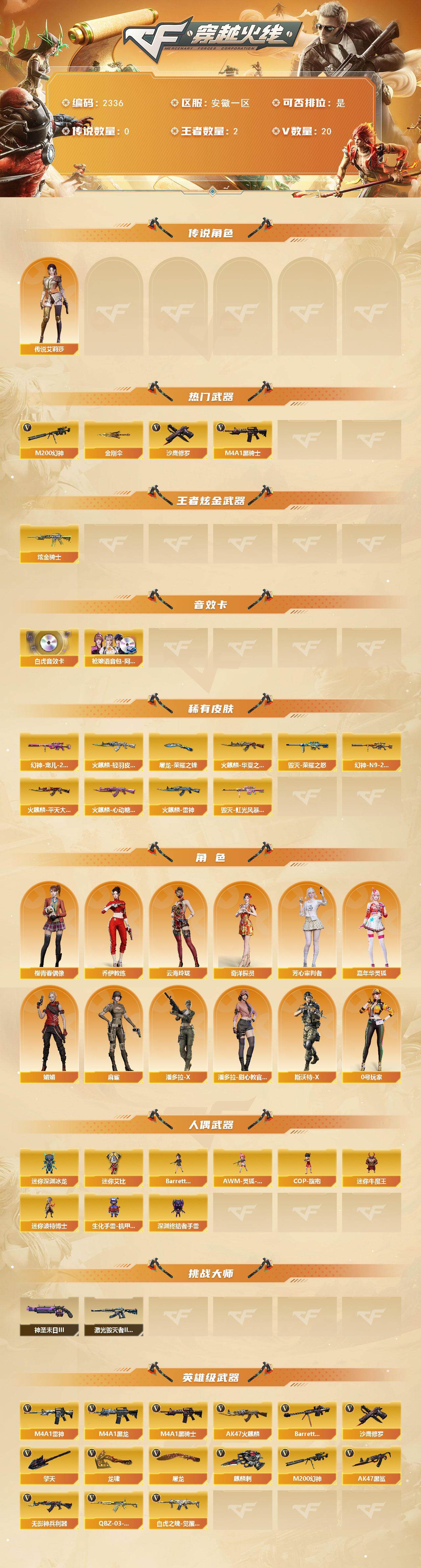 [17153833]安徽一区-25V-2王者武器数-1炫金武器数 【传说角色】:传说艾莉莎 【热门武器】:M200-幻神,M4A1-黑骑士,沙鹰-修罗,金刚伞 【王者炫金武器】:炫金骑士 【音效卡】:Scar Light-白虎音效卡,枪娘语音包-阿敏 【皮肤】:幻神-宠儿-2021MVP,M200-幻神-N9-2022MVP,火麒麟-雷神,火麒麟-华夏之心,火麒麟-轻羽皮肤,火麒麟-平天大圣,火麒麟-心动糖果,毁灭-荣耀之怒,毁灭-虹光风暴 皮肤,屠龙-荣耀之锋 【角色】:奇洋探员,乔伊教练,云海玲珑,芳心审判者,嘉年华灵狐,娟娟,0号玩家,麻雀,潘多拉-X,潘多拉-甜心教官,斯沃特-X,樱-青春偶像 【人偶武器】:AWM-灵狐-15周年嘉年华,COP-旗袍,迷你深渊冰龙,迷你牛魔王,迷你波特博士,生化手雷-机甲核心,深渊终结者手雷,Barrett-夜玫瑰,迷你艾比 【挑战大师】:激光毁灭者III-白马银枪,神圣爆裂者-末日III 【英雄级武器】:AK47-火麒麟,M4A1-黑龙,M4A1-雷神*2,M4A1-黑骑士,AK47-黑鲨,无影-神兵利器,QBZ-03-王者蔷薇-觉醒版,白虎之魄-觉醒版,Barrett-毁灭,M200-幻神,沙鹰-修罗,屠龙*2,龙啸,擎天,麒麟刺 【道具】:全能枪王背包,女皇终结者-魔龙之吻,绿色巨人,灵魂忍者,迷雾幽灵,夺命之镰,防化服*2,金色流光-枪王排位*2,星辰流光-枪王排位,防弹头盔*3,防弹衣*3,C4工具钳*3,手雷包*3 【特殊枪械】:1黑骑士