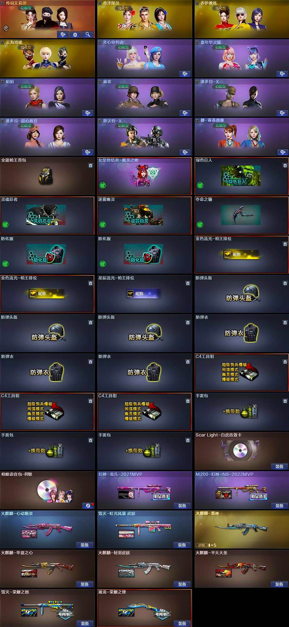 【道具】:全能枪王背包,女皇终结者-魔龙之吻,绿色巨人,灵魂忍者,迷雾幽灵,夺命之镰,防化服*2,金色流光-枪王排位*2,星辰流光-枪王排位,防弹头盔*3,防弹衣*3,C4工具钳*3,手雷包*3