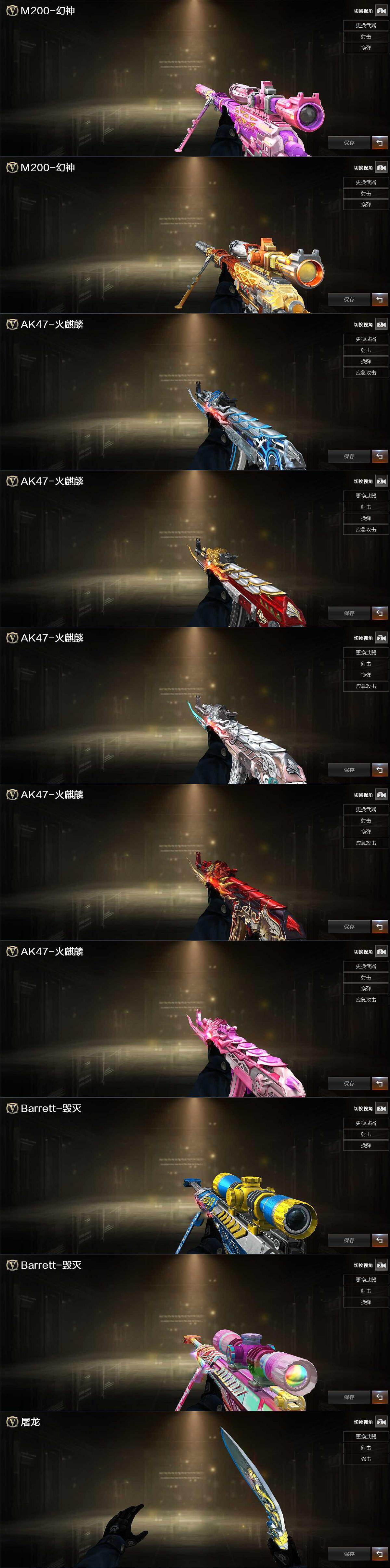 【英雄级武器】:AK47-火麒麟,M4A1-黑龙,M4A1-雷神*2,M4A1-黑骑士,AK47-黑鲨,无影-神兵利器,QBZ-03-王者蔷薇-觉醒版,白虎之魄-觉醒版,Barrett-毁灭,M200-幻神,沙鹰-修罗,屠龙*2,龙啸,擎天,麒麟刺