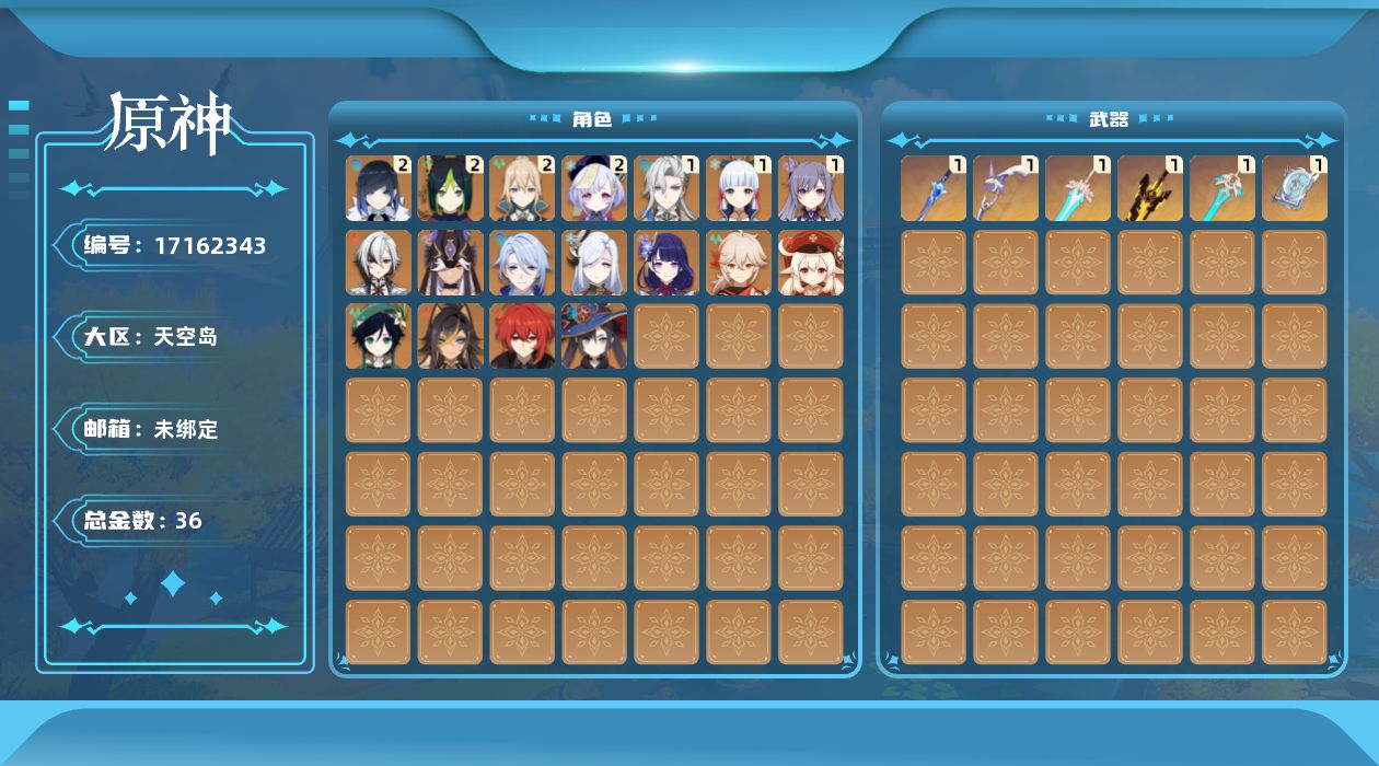 0命阿蕾奇诺,1命那维莱特,0命迪希雅,0命赛诺,2命提纳里,2命夜兰,0命神里绫人,0命申鹤,0命雷电将军,0命枫原万叶,1命神里绫华,0命温迪,0命可莉,1命刻晴,2命七七,2命琴,0命莫娜,0命迪卢克,0命兹白,精1波乱月白经津,精1无工之剑,精1四风原典,精1阿莫斯之弓,精1天空之刃,精1天空之傲