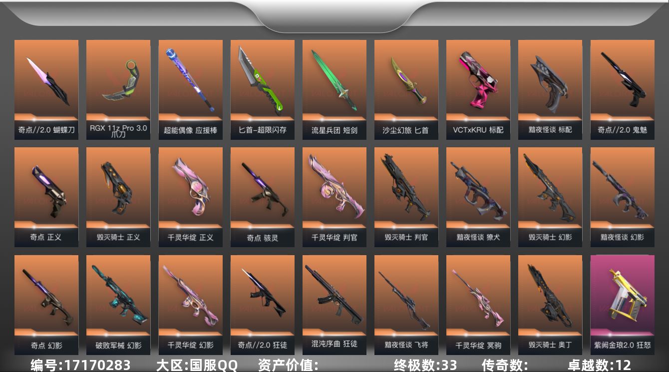 [17170283]【套装】:千灵华绽套装,奇点//2.0套装,黯夜怪谈套装,毁灭骑士套装,回火礼包:奇点套装,掠影套装 【英雄】:炼狱,维斯,暮蝶,壹决,铁臂,捷风,雷兹,幽影,不死鸟,贤者,猎枭,蝰蛇,零,芮娜,奇乐,尚勃勒,霓虹,斯凯,夜露,星礈,K/O,盖可,黑梦,钢锁 【近战 武器】:近战武器-RGX 11z Pro//3.0 爪刀,近战武器-超能偶像 应援棒,近战武器-超限闪存 匕首,近战武器-毁灭战斧,近战武器-流星兵团 短剑,近战武器-落英飞旋,近战武器-奇点//2.0 蝴蝶刀,近战武器-沙尘幻旅 匕首,近战武器-圣石匕首,近战武器-夜刃诡镰,近战武器-夜之蝴蝶,近战武器-影刃,近战武器-紫金爪刀 【标配】:标配-黯夜怪谈,标配-超能偶像,标配-荒土机兵,标配-浮光跃金,标配-战术熊与伙伴们,标配-最终庇护 【VCT手枪】:标配-VCT x KRÜ 【短炮】:短跑-纤云弄巧 【狂怒】:狂怒-紫阙金琅//2.0,狂怒-聚合之力,狂怒-萌彩剪影,狂怒-逆冲蛮牛,狂怒-战术熊与伙伴们 【鬼魅】:鬼魅-奇点//2.0,鬼魅-灵魂冲击,鬼魅-流星兵团,鬼魅-采蜜小蜂队,鬼魅-光导纤维,鬼魅-胡桃狂想,鬼魅-模拟赫兹 【正义】:正义-毁灭骑士,正义-奇点,正义-千灵华绽,正义-掠影,正义-超限闪存,正义-沙尘幻旅,正义-复古浪潮,正义-纤云弄巧 【蜂刺】:蜂刺-超限闪存,蜂刺-胡桃狂想,蜂刺-聚合之力,蜂刺-纤云弄巧 【骇灵】:骇灵-奇点,骇灵-荒土机兵,骇灵-流星兵团,骇灵-沙尘幻旅,骇灵-浮光跃金 【雄鹿】:雄鹿-模拟赫兹,雄鹿-逆冲蛮牛 【判官】:判官-毁灭骑士,判官-千灵华绽,判官-超能偶像,判官-采蜜小蜂队,判官-萌彩剪影,判官-纳米打击x 【獠犬】:獠犬-黯夜怪谈,獠犬-采蜜小蜂队,獠犬-胡桃狂想,獠犬-模拟赫兹,獠犬-逆冲蛮牛 【戍卫】:戍卫-掠影,戍卫-紫阙金琅,戍卫-超能偶像,戍卫-浮光跃金,戍卫-萌彩剪影,戍卫-逆冲蛮牛,戍卫-战术熊与伙伴们 【幻影】:幻影-黯夜怪谈,幻影-毁灭骑士,幻影-破败军械,幻影-奇点,幻影-千灵华绽,幻影-侦察力量,幻影-超限闪存,幻影-聚合之力 【狂徒】:狂徒-混沌序曲,狂徒-奇点//2.0,狂徒-掠影,狂徒-盖亚的复仇,狂徒-紫阙金琅,狂徒-超能偶像,狂徒-流星兵团,狂徒-沙尘幻旅 【飞将】:飞将-黯夜怪谈,飞将-沙尘幻旅,飞将