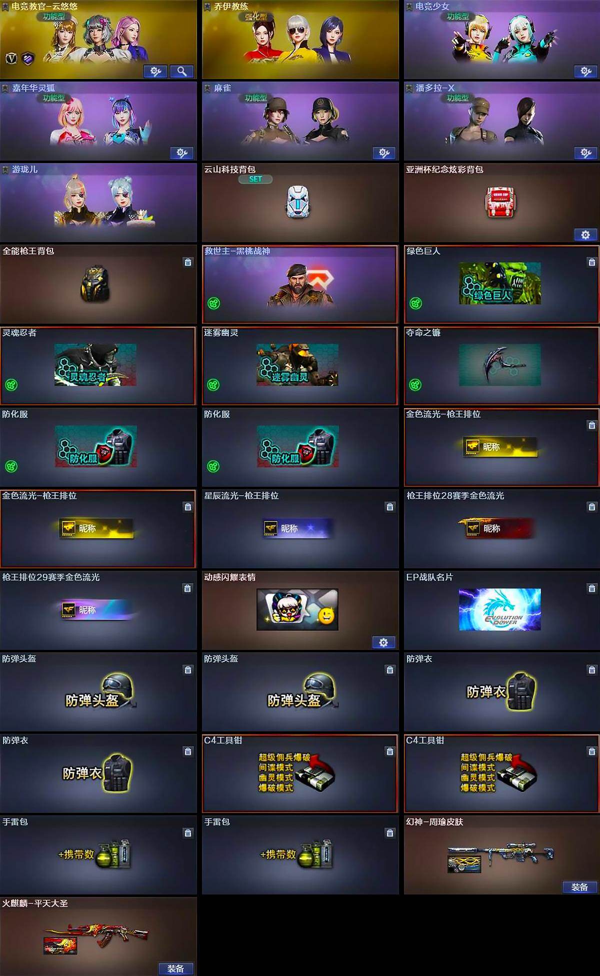 【道具】:云山科技背包,亚洲杯纪念炫彩背包,全能枪王背包,救世主-黑桃战神,绿色巨人,灵魂忍者,迷雾幽灵,夺命之镰,防化服*2,金色流光-枪王排位*2,星辰流光-枪王排位,枪王排位28赛季金色流光,枪王排位29赛季金色流光,动感闪耀表情,EP战队名片,防弹头盔*2,防弹衣*2,C4工具钳*2,手雷包*2