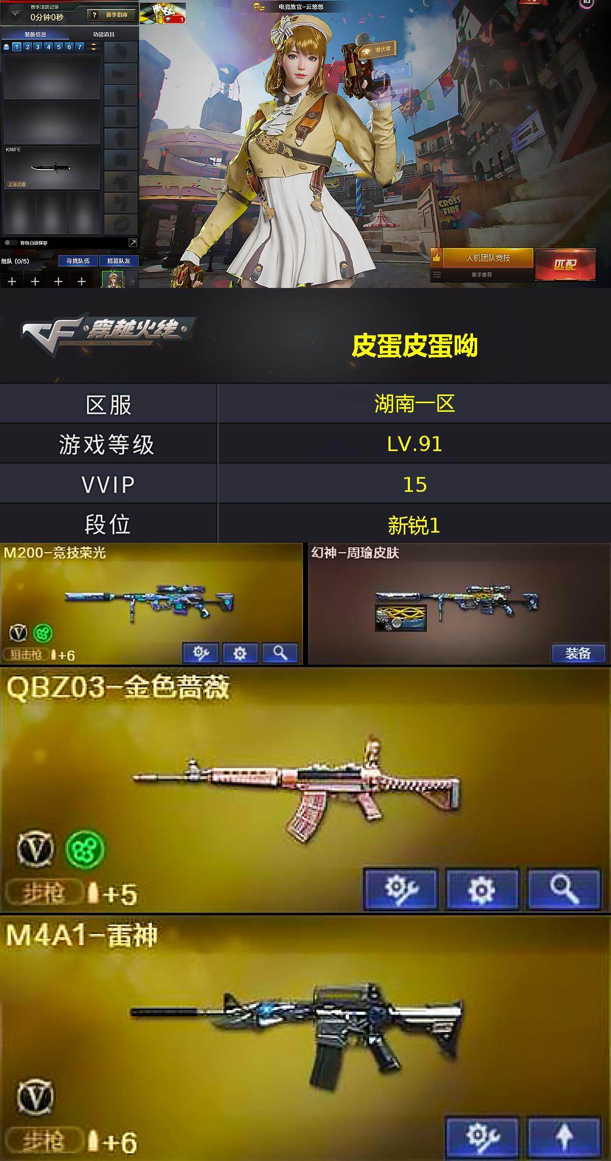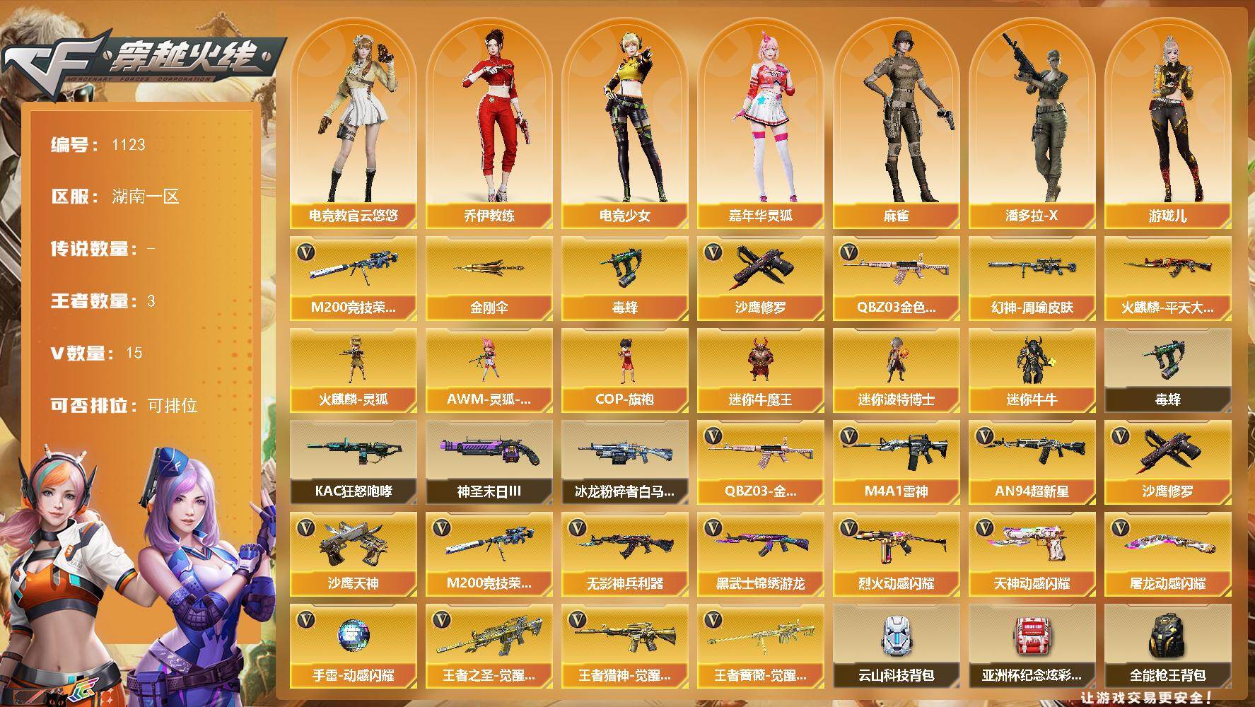 [17128151]湖南一区-18V-3王者武器数-0炫金武器数 【热门武器】:QBZ03-金色蔷薇,M200-竞技荣光,毒蜂,沙鹰-修罗*2,金刚伞 【皮肤】:幻神-周瑜皮肤,火麒麟-平天大圣 【角色】:电竞教官-云悠悠,乔伊教练,电竞少女,嘉年华灵狐,0号玩家,麻雀,潘多拉-X,游珑儿 【人偶武器】:火麒麟-灵狐,AWM-灵狐-15周年嘉年华,COP-旗袍,迷你牛魔王,迷你波特博士,迷你牛牛 【暴走生化】:毒蜂,KAC-狂怒咆哮 【挑战大师】:冰龙粉碎者-白马银枪,神圣爆裂者-末日III 【英雄级武器】:M4A1-雷神,AN94-超新星,无影-神兵利器,黑武士-锦绣游龙,QBZ03-金色蔷薇,烈火-动感闪耀,王者之圣-觉醒版,王者猎神-觉醒版,M200-竞技荣光,王者蔷薇-觉醒版,沙鹰-修罗*2,沙鹰-天神,天神-动感闪耀,屠龙-动感闪耀,手雷-动感闪耀 【道具】:云山科技背包,亚洲杯纪念炫彩背包,全能枪王背包,救世主-黑桃战神,绿色巨人,灵魂忍者,迷雾幽灵,夺命之镰,防化服*2,金色流光-枪王排位*2,星辰流光-枪王排位,枪王排位28赛季金色流光,枪王排位29赛季金色流光,动感闪耀表情,EP战队名片,防弹头盔*2,防弹衣*2,C4工具钳*2,手雷包*2 【特殊枪械】: