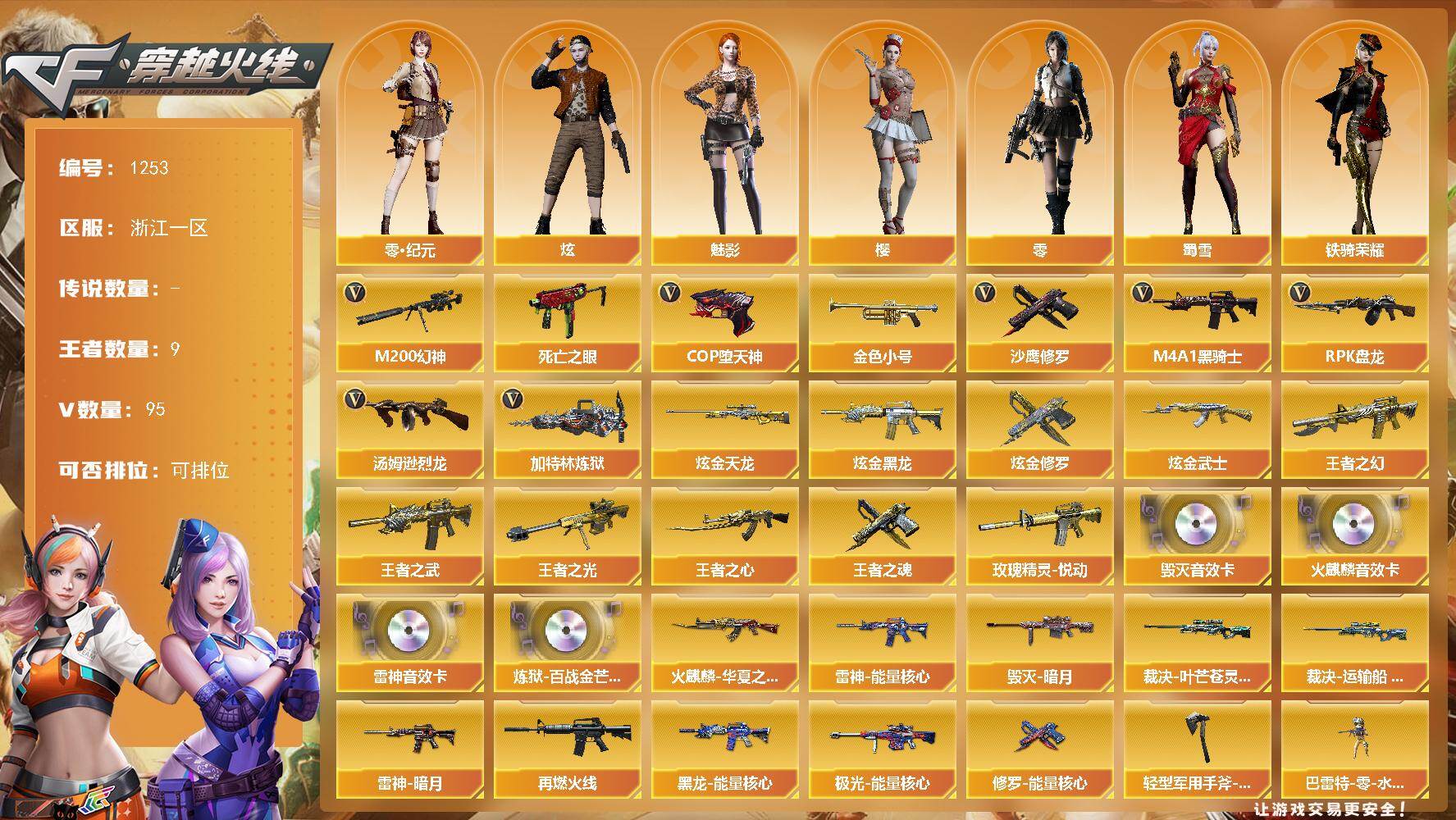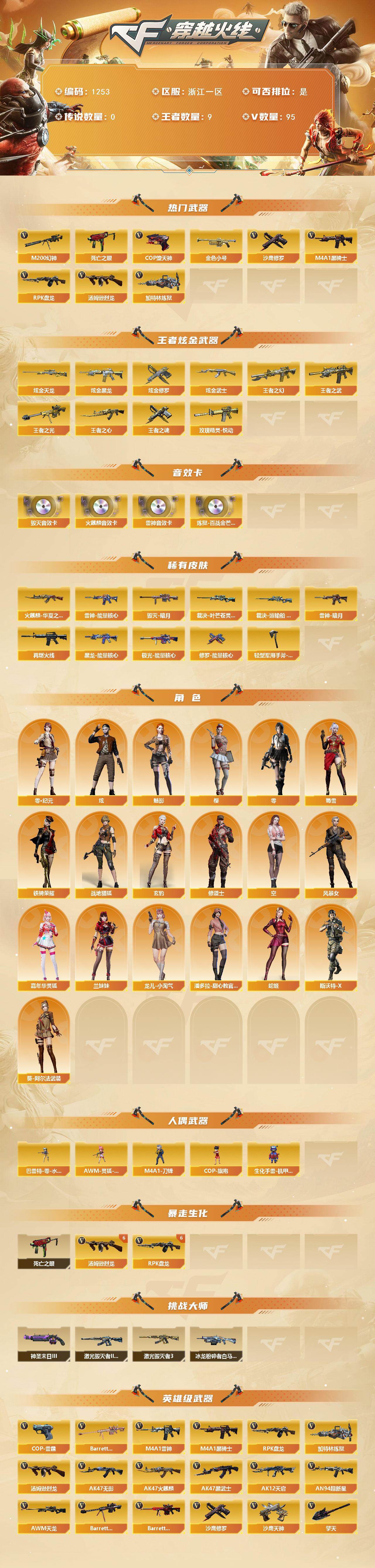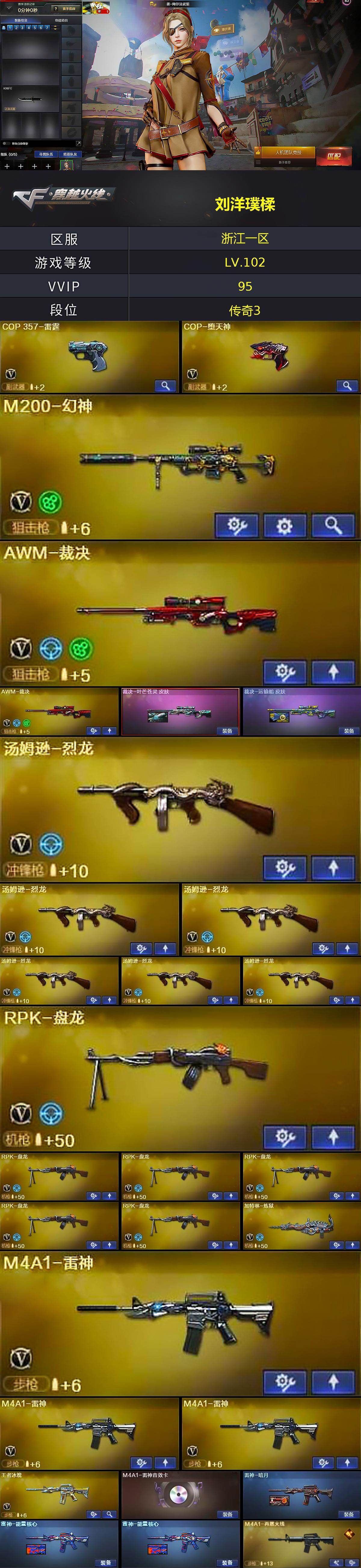 [17128381]浙江一区-99V-9王者武器数-4炫金武器数 【热门武器】:M200-幻神,死亡之眼,金色小号,M4A1-黑骑士*2,汤姆逊-烈龙*6,RPK-盘龙*6,加特林-炼狱,COP-堕天神,沙鹰-修罗*6 【王者炫金武器】:王者之幻,王者之武,玫瑰精灵-悦动,王者之心,王者之光,王者之魂*2,炫金黑龙,炫金武士,炫金天龙,炫金修罗 【音效卡】:AK47-火麒麟音效卡,M4A1-雷神音效卡,Barrett-毁灭音效卡,炼狱-百战金芒-庆典舞曲音效卡 【皮肤】:裁决-叶芒苍灵 皮肤,裁决-运输船 皮肤,雷神-暗月,雷神-能量核心*2,M4A1-再燃火线,火麒麟-华夏之心,毁灭-暗月,黑龙-能量核心,极光-能量核心*2,修罗-能量核心*4,轻型军用手斧-再燃火线 【角色】:零,樱,魅影,炫,玄豹,零·纪元,战地猎狐,修道士,葵-阿尔法武装,空,风暴女,嘉年华灵狐,兰妹妹,龙儿-小淘气,潘多拉-甜心教官,蛇姬,斯沃特-X,蜀雪,铁骑荣耀 【人偶武器】:巴雷特-零-水下丽影,AWM-灵狐-15周年嘉年华*2,COP-旗袍,M4A1-刀锋,生化手雷-机甲核心 【暴走生化】:死亡之眼 【挑战大师】:冰龙粉碎者-白马银枪,激光毁灭者III-白马银枪*2,激光毁灭者III*2,神圣爆裂者-末日III 【英雄级武器】:M4A1-千变*2,AK47-火麒麟*2,M4A1-雷神*3,M4A1-黑骑士*2,AK47-无影*2,AK47-黑武士,AK12-天启,AN94-超新星,M4A1-雷霆,无影-神兵利器,M4A1-猎神,王者冰魄-觉醒版,AWM-天龙,Barrett-毁灭*2,Barrett-极光,AWM-裁决*2,M200-幻神,Barrett-金色蔷薇,王者之怒-觉醒版,RPK-盘龙*6,加特林-炼狱,炼狱-百战金芒,汤姆逊-烈龙*6,AA-12-雷霆,沙鹰-修罗*6,沙鹰-天神,COP-雷霆,COP-堕天神,屠龙*3,龙啸,麒麟刺-堕天神,擎天,麒麟刺*2,龙啸-堕天神,麒麟刺-百战金芒,高爆手雷-雷霆*5,高爆手雷-堕天神*3,闪光弹-雷霆*5,闪光弹-堕天神*3,烟雾弹-雷霆*5,烟雾弹-堕天神*3,M4A1-赤狱骑士,M4A1-苍鸣雷神 【道具】:BS战队炫彩背包,云山科技背包,云海游龙炫彩背包,女皇终结者-背包,炫彩背包-诺拉,炫彩背包,百战金芒炫彩背包,超级背包*2,圣拳猎手