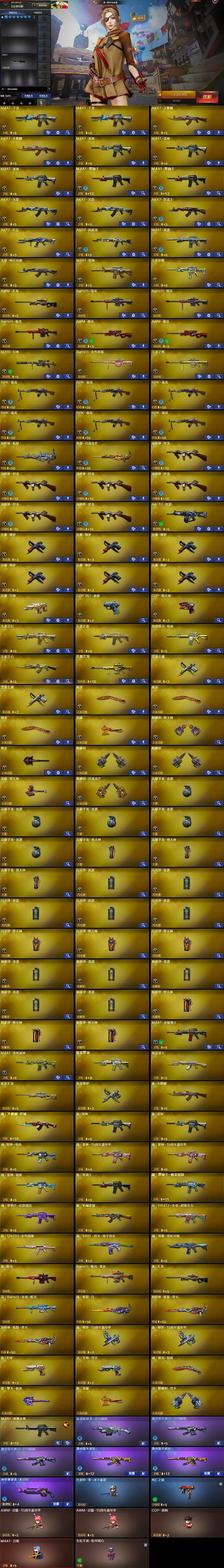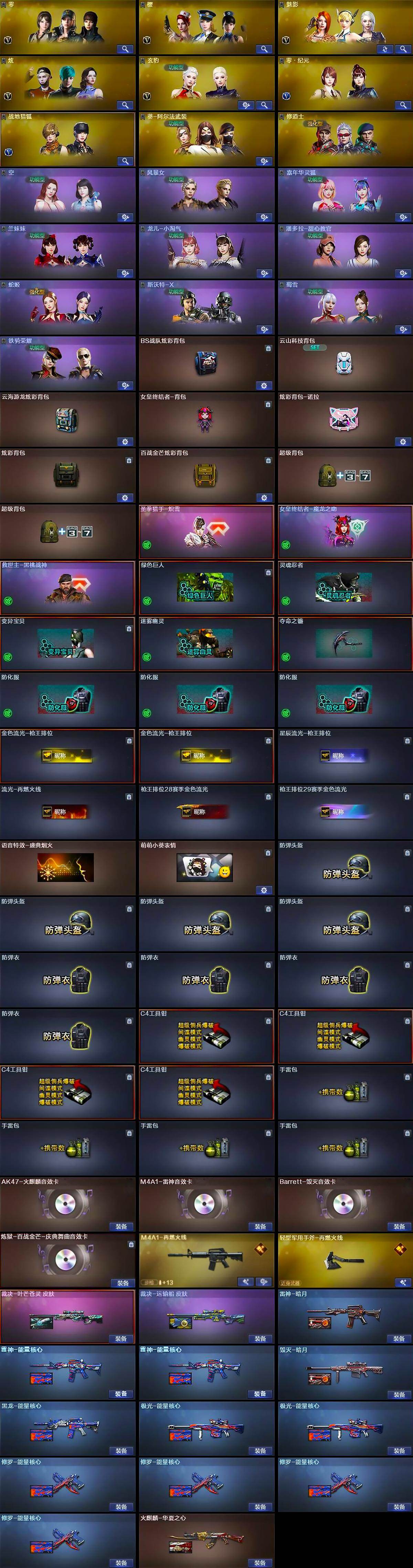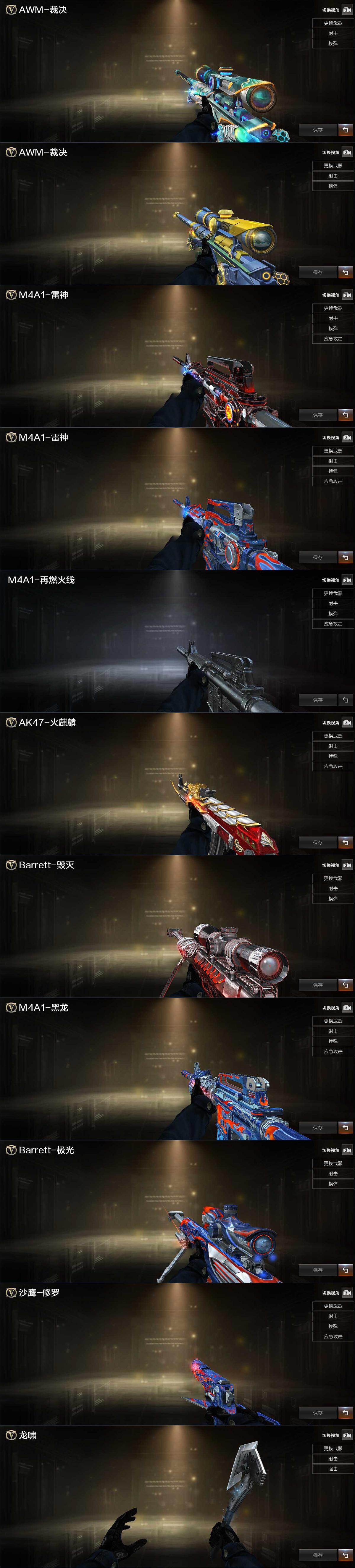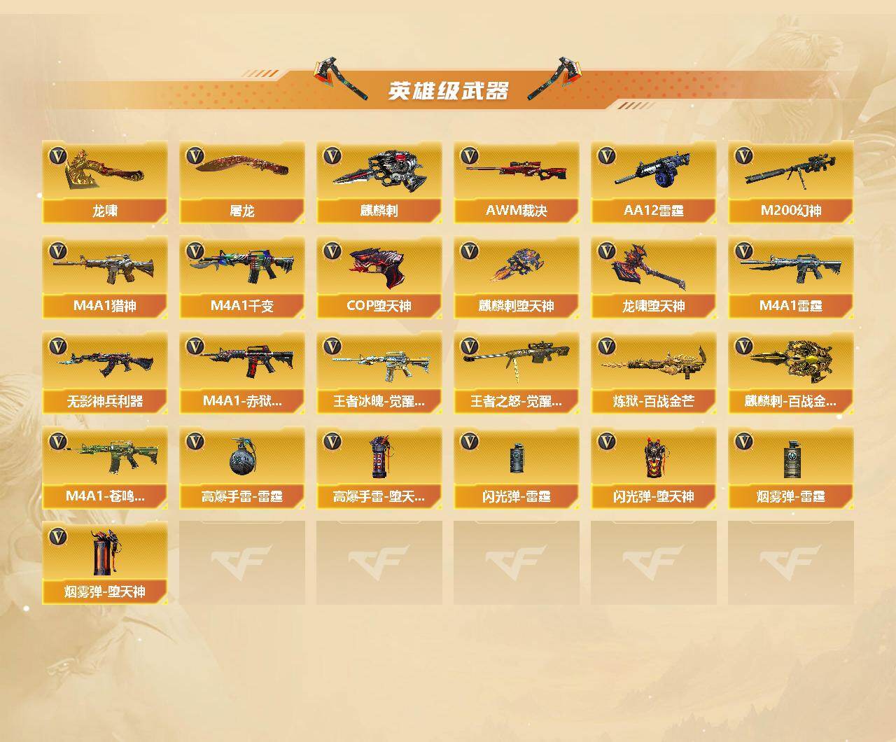 【英雄级武器】:M4A1-千变*2,AK47-火麒麟*2,M4A1-雷神*3,M4A1-黑骑士*2,AK47-无影*2,AK47-黑武士,AK12-天启,AN94-超新星,M4A1-雷霆,无影-神兵利器,M4A1-猎神,王者冰魄-觉醒版,AWM-天龙,Barrett-毁灭*2,Barrett-极光,AWM-裁决*2,M200-幻神,Barrett-金色蔷薇,王者之怒-觉醒版,RPK-盘龙*6,加特林-炼狱,炼狱-百战金芒,汤姆逊-烈龙*6,AA-12-雷霆,沙鹰-修罗*6,沙鹰-天神,COP-雷霆,COP-堕天神,屠龙*3,龙啸,麒麟刺-堕天神,擎天,麒麟刺*2,龙啸-堕天神,麒麟刺-百战金芒,高爆手雷-雷霆*5,高爆手雷-堕天神*3,闪光弹-雷霆*5,闪光弹-堕天神*3,烟雾弹-雷霆*5,烟雾弹-堕天神*3,M4A1-赤狱骑士,M4A1-苍鸣雷神