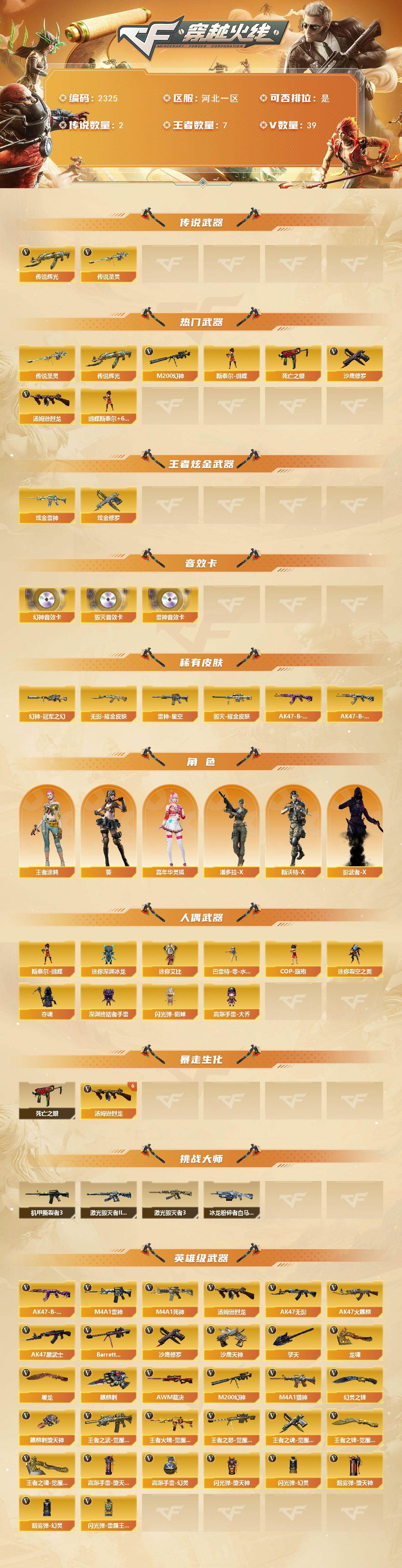 [17130631]河北一区-46V-7王者武器数-2炫金武器数 【传说武器】:传说辉光,传说圣灵 【热门武器】:传说圣灵,传说辉光,M200-幻神,死亡之眼*2,汤姆逊-烈龙*6,斯泰尔-蝴蝶,沙鹰-修罗*2 【王者炫金武器】:炫金雷神,炫金修罗 【音效卡】:M200-幻神音效卡,M4A1-雷神音效卡,Barrett-毁灭音效卡 【皮肤】:幻神-冠军之幻,雷神-星空,毁灭耀金皮肤,无影耀金皮肤,AK47-B-常胜将军-曹操,AK47-B-常胜将军-刘备*2 【角色】:葵,王者涂鸦,嘉年华灵狐,潘多拉-X,斯沃特-X,影武者-X 【人偶武器】:斯泰尔-蝴蝶,巴雷特-零-水下丽影,COP-旗袍,迷你深渊冰龙,迷你裂空之翼,夺魂,深渊终结者手雷,闪光弹-貂蝉,高爆手雷-大乔,迷你艾比 【暴走生化】:死亡之眼*2 【挑战大师】:冰龙粉碎者-白马银枪,激光毁灭者III-白马银枪,激光毁灭者III,机甲撕裂者III 【英雄级武器】:AK47-火麒麟,M4A1-雷神,AK47-无影,M4A1-死神,AK47-黑武士,M4A1-猎神,王者之武-觉醒版,王者火魄-觉醒版,AK47-B-常胜将军,Barrett-毁灭,AWM-裁决,M200-幻神,王者之怒-觉醒版,汤姆逊-烈龙*6,沙鹰-修罗*2,沙鹰-天神,王者之魂-觉醒版,屠龙,龙啸,麒麟刺-堕天神,擎天,麒麟刺*2,幻灵之锋,王者之锋-觉醒版,王者之啸-觉醒版,高爆手雷-堕天神,高爆手雷-幻灵*2,闪光弹-堕天神,闪光弹-幻灵,闪光弹-雷霆王者-觉醒版,烟雾弹-堕天神,烟雾弹-幻灵*2 【道具】:战舰背包,炫彩背包,超级背包*2,黄金生化钩,变异宝贝,生化弹匣,夺命之镰,防化服,星辰流光-枪王排位,枪王排位28赛季金色流光,枪王排位29赛季金色流光,C4-红龙,防弹头盔*2,防弹衣*2,C4工具钳*2,手雷包*2 【特殊枪械】:蝴蝶斯泰尔+6烈龙,6烈龙,1蝴蝶斯泰尔