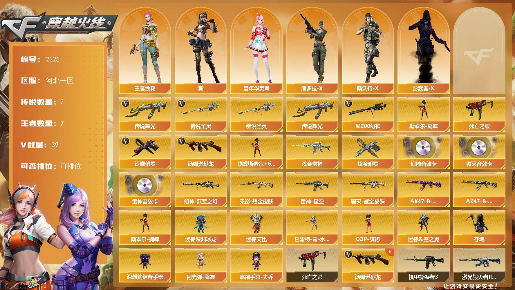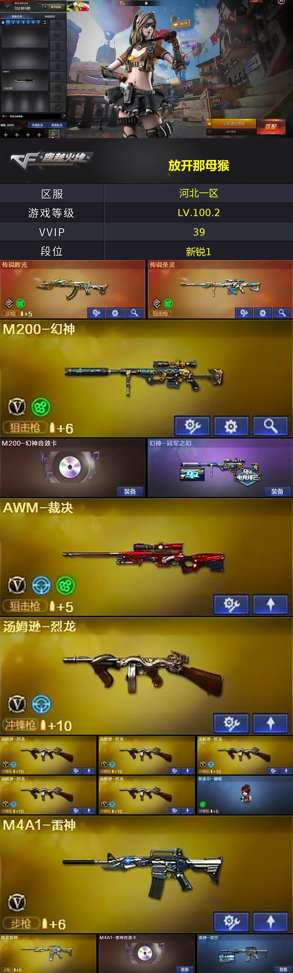 - [16357281]北京一区-70V-5王者-0炫金 【传说角色】:传说影煞 【热门武器】:QBZ03-金色蔷薇,M200-幻神,M200-竞技荣光,死亡之眼,白虎-电玩蓝兔,M4A1-黑骑士,汤姆逊-烈龙*5,RPK-盘龙*3,加特林-炼狱*3,王者M4A1-萌萌金发刀锋,裁决-雪莉杨,COP-堕天神,沙鹰-修罗*2,炽芒蝶刃 【音效卡】:M200-幻神音效卡,AK47-火麒麟音效卡,M4A1-黑骑士音效卡,Barrett-毁灭音效卡,AWM-裁决音效卡 【皮肤】:幻神-丹凤,雷神-冠军之魄,雷神-宇航兔皮肤,毁灭-冠军之怒,毁灭-黑大圣皮肤,毁灭-风暴,黑龙-暗月,黑骑士耀金皮肤,战神-粉色甜心皮肤,战神-紫绶金章皮肤,修罗-能量核心,修罗-星空 【角色】:电竞教官-云悠悠,荒漠琉璃,暗夜-X,初恋灵狐,风暴女,葵-赛博朋克,龙儿,麻雀,潘多拉-X,铁骑荣耀,兔囡囡,职业选手 【人偶武器】:王者M4A1-萌萌金发刀锋,裁决-雪莉杨,王者COP-精英刀锋,M37-葵,迷你牛魔王,夺魂,深渊终结者手雷,迷你超能女侍 【暴走生化】:死亡之眼 【挑战大师】:冰龙粉碎者-白马银枪*2,激光毁灭者III,KAC-圣炎切割者III,神圣爆裂者-末日III 【英雄级武器】:AK47-火麒麟,M4A1-黑龙,M4A1-雷神*2,M4A1-黑骑士,AK12-天启,无影-神兵利器,QBZ03-金色蔷薇,AK-47-猩红传说*2,AK47-B-战神,王者冰魄-觉醒版,黑骑士-海王,王者龙血-觉醒版,白虎-电玩蓝兔,Barrett-毁灭,AWM-裁决,M200-幻神,M200-竞技荣光,RPK-盘龙*3,加特林-炼狱*3,汤姆逊-烈龙*5,沙鹰-修罗*2,沙鹰-天神,COP-堕天神,柯尔特-竞技荣光*3,屠龙,马来剑-夜魔,擎天,麒麟刺*2,擎天-竞技荣光*3,炽芒蝶刃,王者之啸-觉醒版,高爆手雷-夜魔,高爆手雷-竞技荣光*6,闪光弹-夜魔,闪光弹-竞技荣光*6,烟雾弹-夜魔,烟雾弹-竞技荣光*6 【道具】:AG战队炫彩背包,XROCK炫彩背包,灵魂忍者,变异宝贝,妖姬,迷雾幽灵,夺命之镰,防化服,金色流光-枪王排位*2,星辰流光-枪王排位,电玩兔兔表情,C4-红龙,防弹头盔,防弹衣,C4工具钳,手雷包 【特殊枪械】:1黑骑士,5烈龙,3盘龙,3炼狱