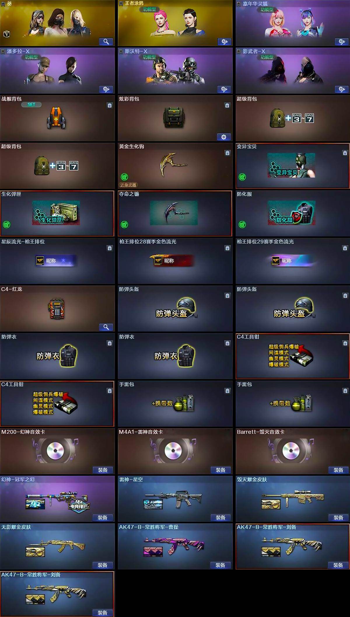 【道具】:战舰背包,炫彩背包,超级背包*2,黄金生化钩,变异宝贝,生化弹匣,夺命之镰,防化服,星辰流光-枪王排位,枪王排位28赛季金色流光,枪王排位29赛季金色流光,C4-红龙,防弹头盔*2,防弹衣*2,C4工具钳*2,手雷包*2