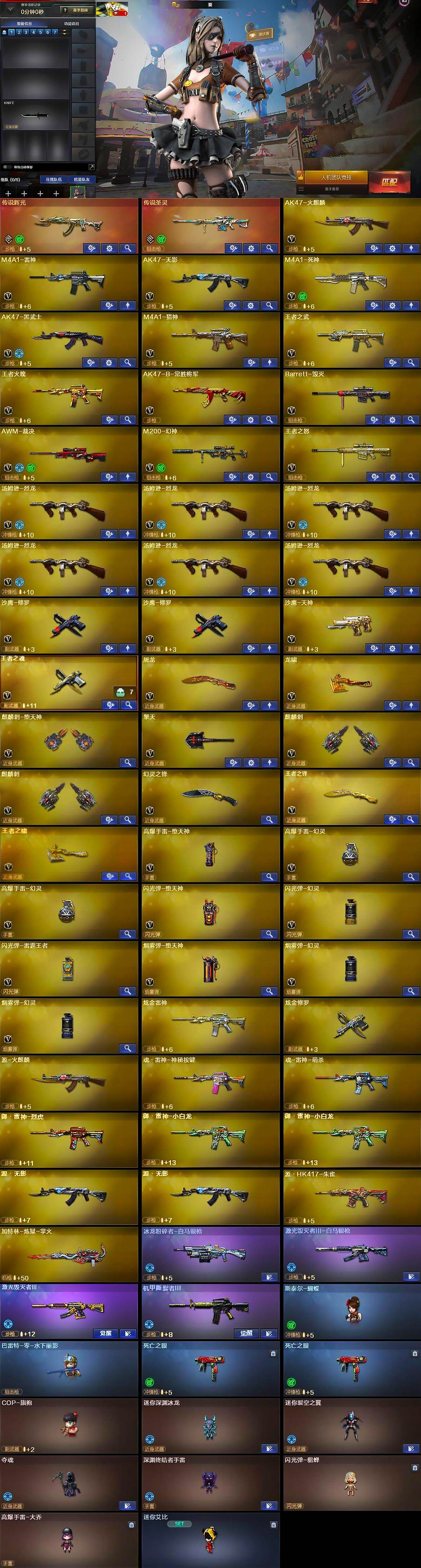 【英雄级武器】:AK47-火麒麟,M4A1-雷神,AK47-无影,M4A1-死神,AK47-黑武士,M4A1-猎神,王者之武-觉醒版,王者火魄-觉醒版,AK47-B-常胜将军,Barrett-毁灭,AWM-裁决,M200-幻神,王者之怒-觉醒版,汤姆逊-烈龙*6,沙鹰-修罗*2,沙鹰-天神,王者之魂-觉醒版,屠龙,龙啸,麒麟刺-堕天神,擎天,麒麟刺*2,幻灵之锋,王者之锋-觉醒版,王者之啸-觉醒版,高爆手雷-堕天神,高爆手雷-幻灵*2,闪光弹-堕天神,闪光弹-幻灵,闪光弹-雷霆王者-觉醒版,烟雾弹-堕天神,烟雾弹-幻灵*2