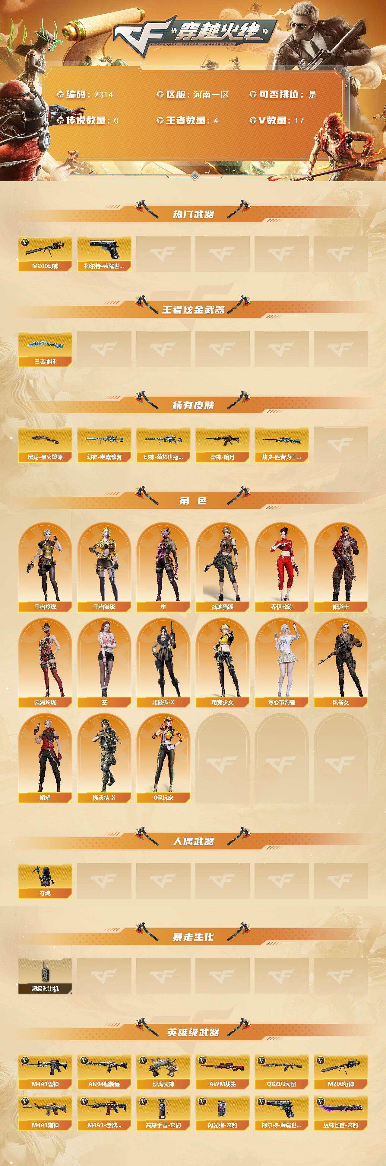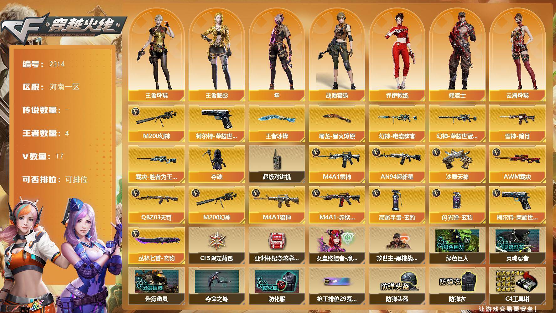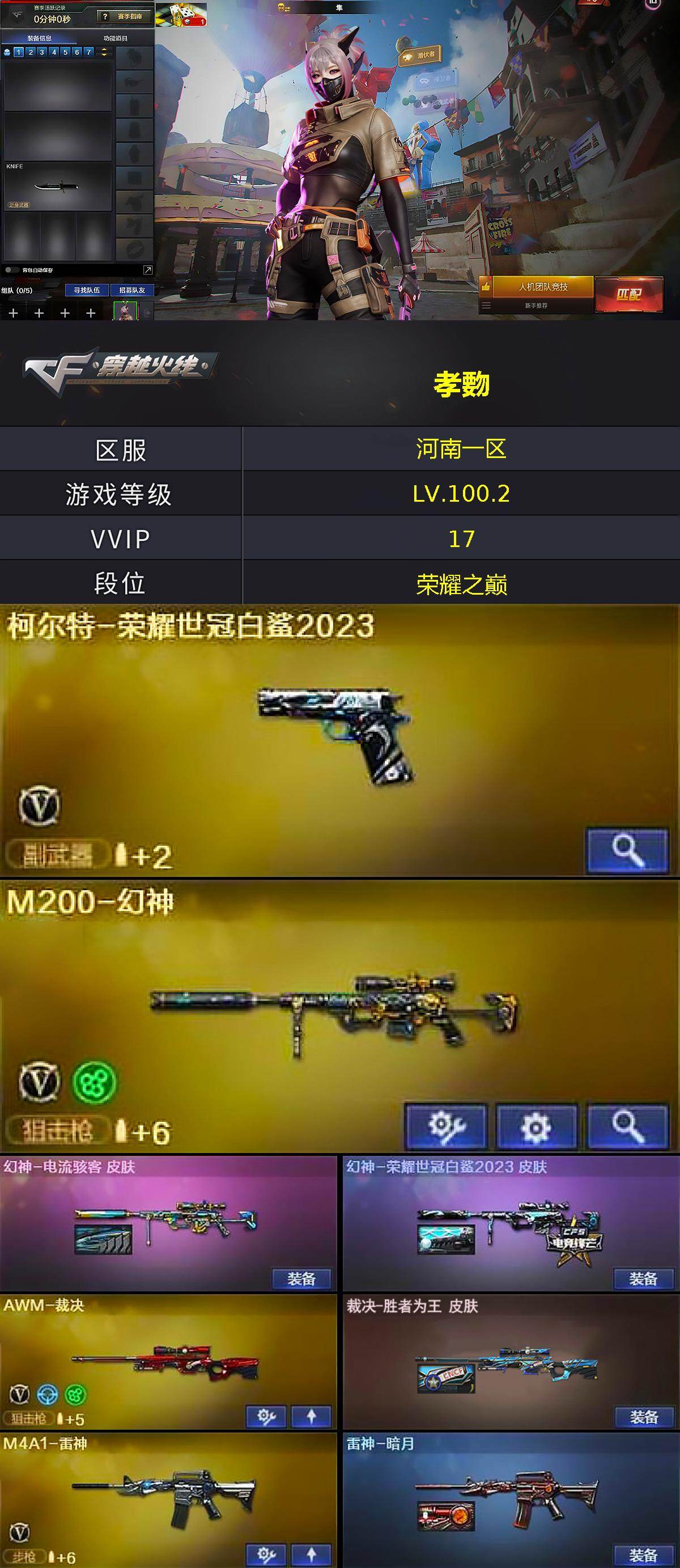 [17130741]河南一区-19V-4王者武器数-0炫金武器数 【热门武器】:M200-幻神,柯尔特-荣耀世冠白鲨2023 【王者炫金武器】:王者冰锋 【皮肤】:幻神-电流骇客 皮肤,幻神-荣耀世冠白鲨2023 皮肤,裁决-胜者为王 皮肤,雷神-暗月,屠龙-星火燎原*2 【角色】:隼,战地猎狐,王者玲珑,王者-魅影,乔伊教练,修道士,云海玲珑,空,北极狐-X,电竞少女,芳心审判者,风暴女*2,娟娟,0号玩家,斯沃特-X 【人偶武器】:夺魂 【暴走生化】:超级对讲机 【英雄级武器】:M4A1-雷神,AN94-超新星,QBZ03-天罚,M4A1-猎神,AWM-裁决,M200-幻神,沙鹰-天神,柯尔特-荣耀世冠白鲨2023,丛林匕首-玄豹,高爆手雷-玄豹,闪光弹-玄豹,M4A1-赤狱骑士 【道具】:CFS限定背包,亚洲杯纪念炫彩背包,女皇终结者-魔龙之吻,救世主-黑桃战神,绿色巨人,灵魂忍者,迷雾幽灵,夺命之镰,防化服*3,星辰流光-枪王排位,枪王排位28赛季金色流光,枪王排位29赛季金色流光,EP战队名片,EP战队喷图,防弹头盔*6,防弹衣*6,C4工具钳*6,手雷包*6 【特殊枪械】: