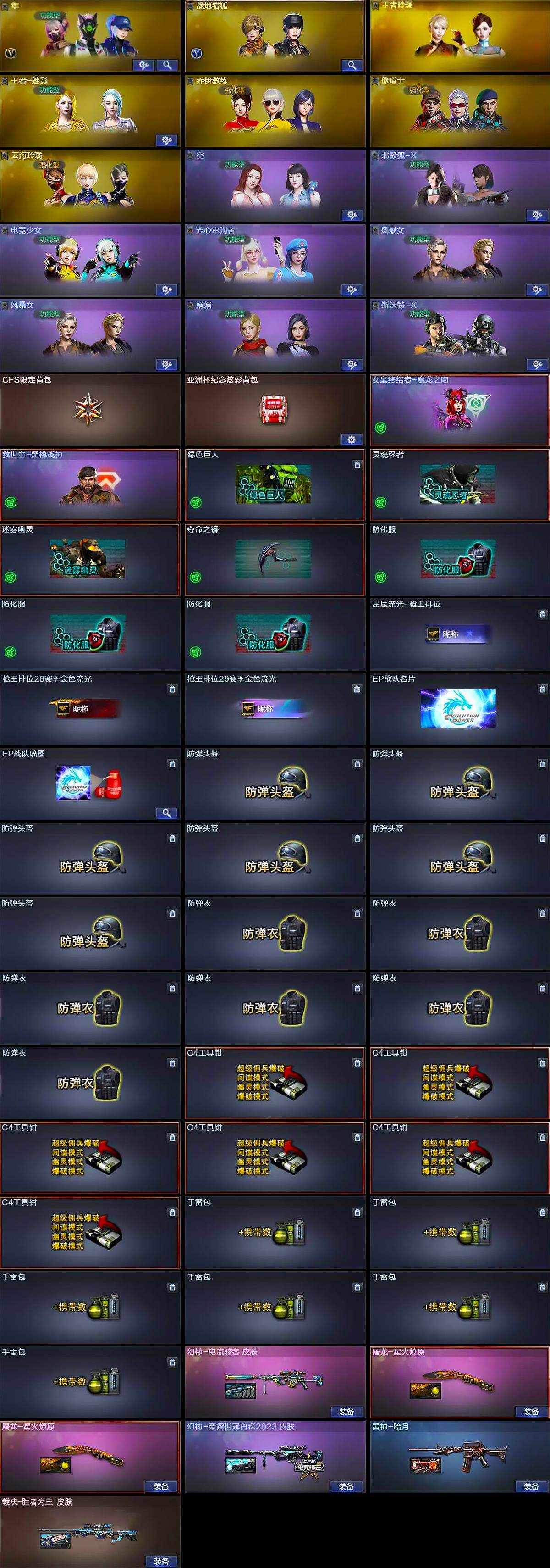 【道具】:CFS限定背包,亚洲杯纪念炫彩背包,女皇终结者-魔龙之吻,救世主-黑桃战神,绿色巨人,灵魂忍者,迷雾幽灵,夺命之镰,防化服*3,星辰流光-枪王排位,枪王排位28赛季金色流光,枪王排位29赛季金色流光,EP战队名片,EP战队喷图,防弹头盔*6,防弹衣*6,C4工具钳*6,手雷包*6