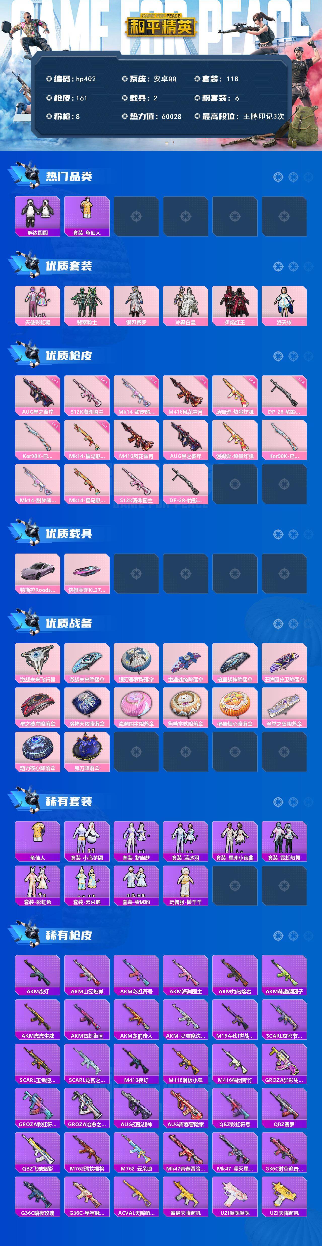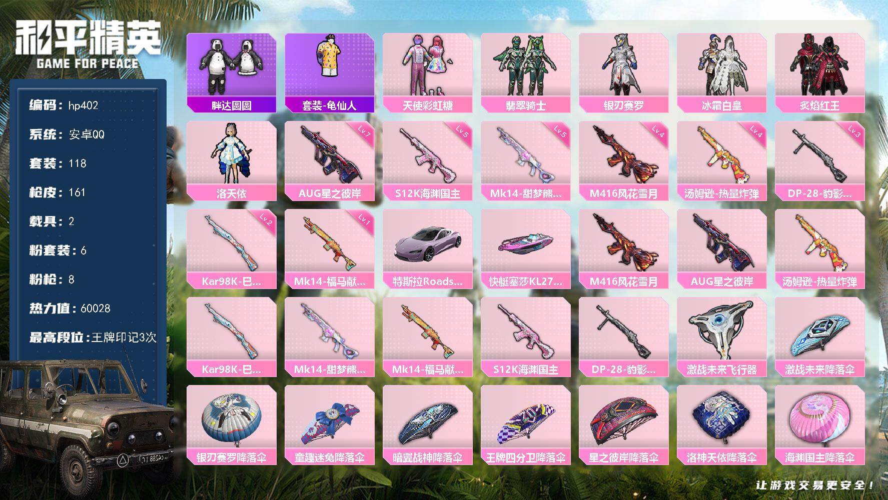 [17140421]安卓 手Q-6粉装-8特效枪-2载具-1粉色飞行器-60028热力值-3王牌印记-118套装-161枪皮 【热门品类】:套装-胖达圆圆,套装-龟仙人 【粉色套装】:粉装-天使彩虹糖,粉装-翡翠骑士,粉装-银刃赛罗,粉装-冰霜白皇,粉装-炙焰红王,角色-洛天依 【粉色枪皮等级】:M416-风花雪月(四级),AUG-星之彼岸(七级),汤姆逊-热量炸弹(四级),Kar98K-巳巳如意(二级),Mk14-甜梦熊击(五级),Mk14-福马献瑞(一级),S12K-海渊国主(五级),DP-28-豹影疾电(三级) 【粉色载具】:特斯拉Roadster(沁心粉),快艇-塞莎KL27(霓虹粉) 【粉色枪皮】:M416-风花雪月,AUG-星之彼岸,汤姆逊-热量炸弹,Kar98K-巳巳如意,Mk14-甜梦熊击,Mk14-福马献瑞,S12K-海渊国主,DP-28-豹影疾电 【粉色飞行器】:激战未来飞行器 【粉色降落伞】:激战未来降落伞,银刃赛罗降落伞,童趣迷兔降落伞,暗翼战神降落伞,王牌四分卫降落伞,星之彼岸降落伞,洛神天依降落伞,海渊国主降落伞,焦糖拿铁降落伞,橘柚倾心降落伞,圣堂之誓降落伞,动力核心降落伞,鬼刀降落伞 【稀有套装】:套装-龟仙人,套装-小鸟芋圆,套装-雪国风尚,套装-紫幽梦,套装-蓝冰羽,套装-星渊小夜曲,套装-霓虹热舞,套装-彩虹兔,套装-云朵鹅,套装-雪绒豹,玩偶服-懒羊羊 【稀有枪皮】:AKM-夜灯,AKM-山经魅狐,AKM-彩虹符号,AKM-海渊国主,AKM-灼热熔岩,AKM-萌趣颜团子,AKM-虎虎生威,AKM-霓虹街区,AKM-龙的传人,AKM-灵猫魔法师,M16A4-幻世战舞者,SCAR-L-炫彩节奏,SCAR-L-玉兔迎春,SCAR-L-龙宫之主,M416-夜灯,M416-滑板小狐,M416-糯团青竹,GROZA-异彩先驱,GROZA-彩虹符号,GROZA-治愈之星,AUG-幻影战神,AUG-青春冒险家,QBZ-彩虹符号,QBZ-赛罗,QBZ-飞驰魅影,M762-瑞龙福将,M762-云朵鹅,Mk47-青春冒险家,Mk47-湮灭星辰,G36C-时空追击者,G36C-暗夜玫瑰,G36C-星穹咏叹调,AC-VAL-天降萌叽,蜜獾-天降萌叽,UZI-啾咪啾咪,UZI-天降萌叽,UZI-幻影战神,UZI-炫彩节奏,UZI-烈焰拳霸,UMP45-时空追击者,UMP4
