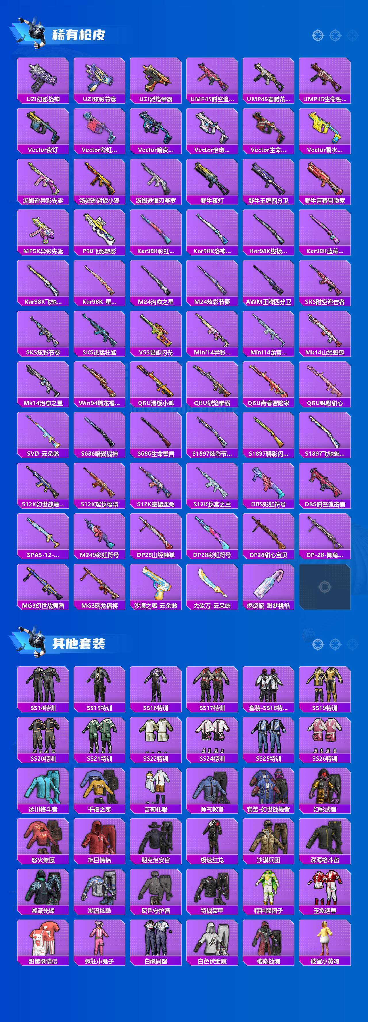 【稀有枪皮】:AKM-夜灯,AKM-山经魅狐,AKM-彩虹符号,AKM-海渊国主,AKM-灼热熔岩,AKM-萌趣颜团子,AKM-虎虎生威,AKM-霓虹街区,AKM-龙的传人,AKM-灵猫魔法师,M16A4-幻世战舞者,SCAR-L-炫彩节奏,SCAR-L-玉兔迎春,SCAR-L-龙宫之主,M416-夜灯,M416-滑板小狐,M416-糯团青竹,GROZA-异彩先驱,GROZA-彩虹符号,GROZA-治愈之星,AUG-幻影战神,AUG-青春冒险家,QBZ-彩虹符号,QBZ-赛罗,QBZ-飞驰魅影,M762-瑞龙福将,M762-云朵鹅,Mk47-青春冒险家,Mk47-湮灭星辰,G36C-时空追击者,G36C-暗夜玫瑰,G36C-星穹咏叹调,AC-VAL-天降萌叽,蜜獾-天降萌叽,UZI-啾咪啾咪,UZI-天降萌叽,UZI-幻影战神,UZI-炫彩节奏,UZI-烈焰拳霸,UMP45-时空追击者,UMP4
