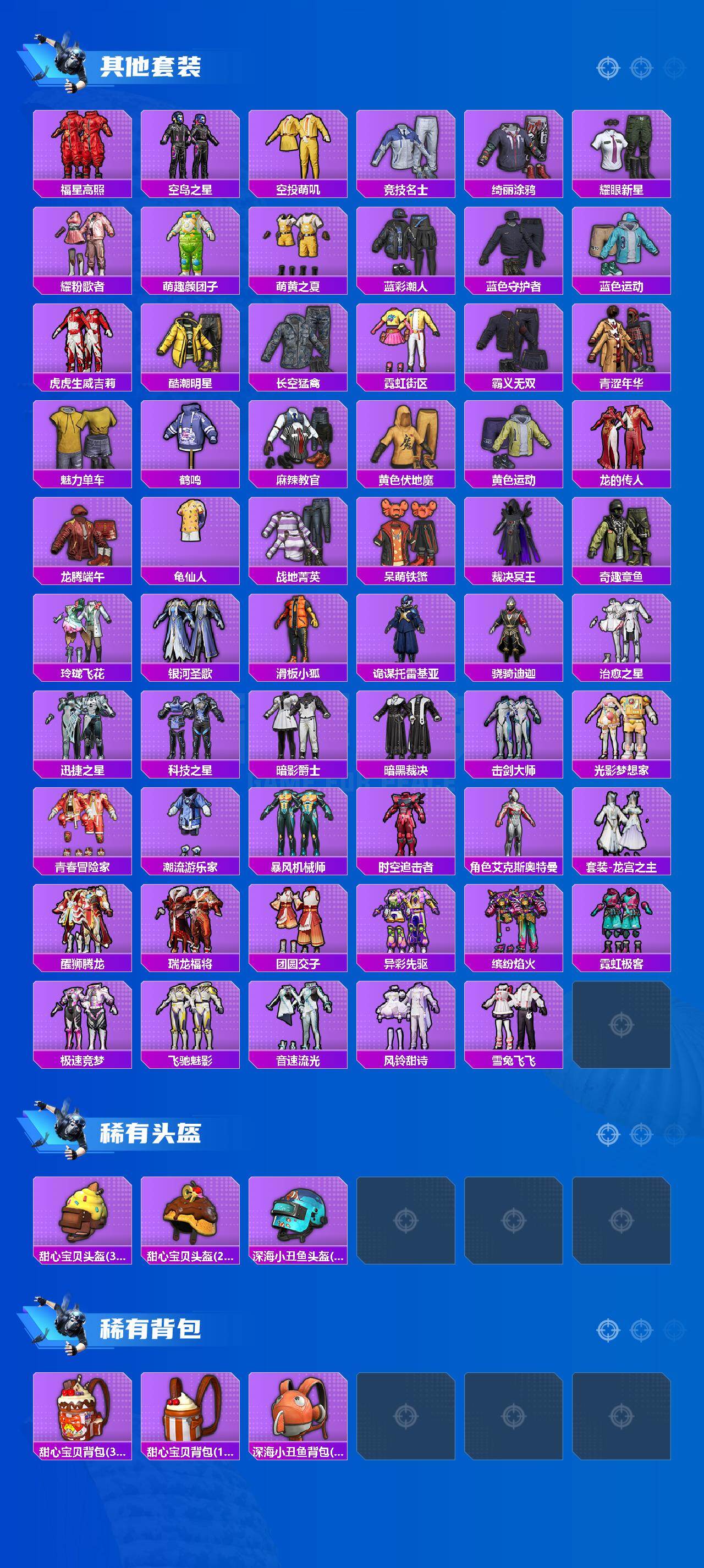 【稀有套装】:套装-龟仙人,套装-小鸟芋圆,套装-雪国风尚,套装-紫幽梦,套装-蓝冰羽,套装-星渊小夜曲,套装-霓虹热舞,套装-彩虹兔,套装-云朵鹅,套装-雪绒豹,玩偶服-懒羊羊