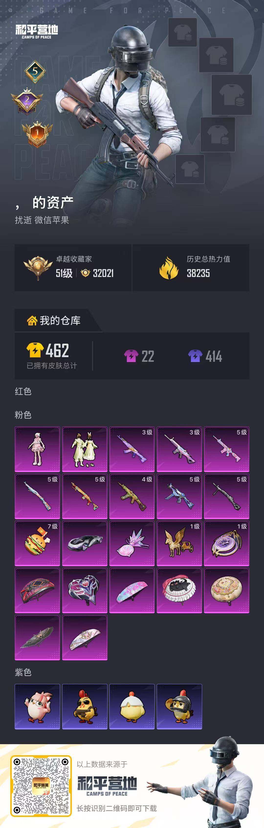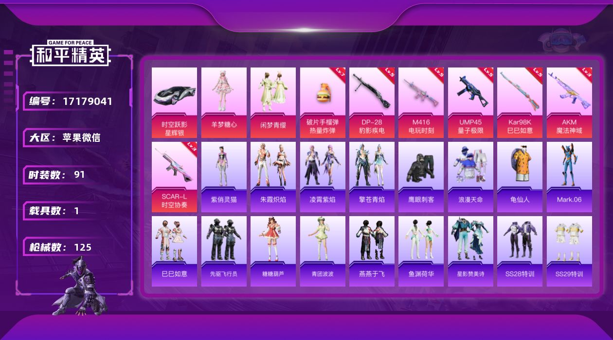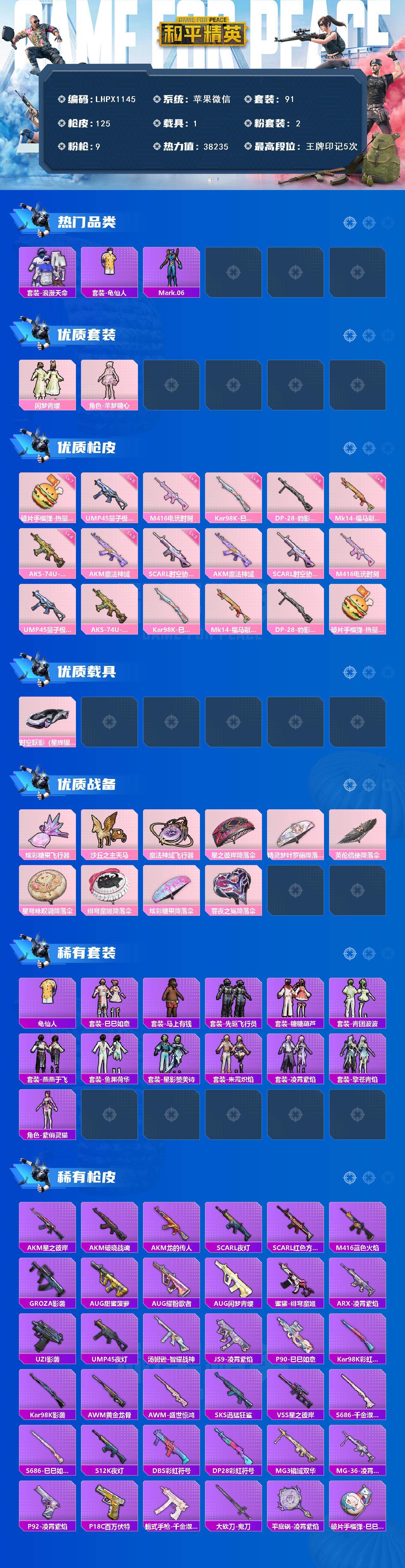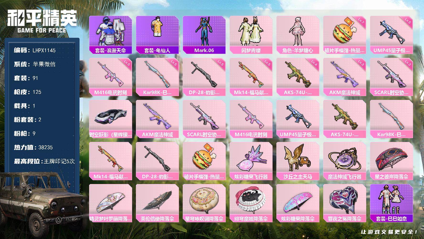 [17179041]【特价出售/店主推荐】苹果 微信-2粉装-9特效枪-1载具-3粉色飞行器-38235热力值-5王牌印记-91套装-125枪皮 【热门品类】:套装-浪漫天命,套装-龟仙人,角色-Mark.06 【粉色套装】:粉装-闲梦青缨,角色-羊梦糖心 【粉色枪皮等级】:AKM-魔法神域(三级),SCAR-L-时空协奏(三级),M416-电玩时刻(五级),UMP45-量子极限(五级),AKS-74U-森灵之息(四级),Kar98K-巳巳如意(五级),Mk14-福马献瑞(五级),DP-28-豹影疾电(五级),破片手榴弹-热量炸弹(七级) 【粉色载具】:时空跃影(星辉银) 【粉色枪皮】:AKM-魔法神域,SCAR-L-时空协奏,M416-电玩时刻,UMP45-量子极限,AKS-74U-森灵之息,Kar98K-巳巳如意,Mk14-福马献瑞,DP-28-豹影疾电,破片手榴弹-热量炸弹 【粉色飞行器】:炫彩糖果飞行器,沙丘之主天马,魔法神域飞行器 【粉色降落伞】:星之彼岸降落伞,精灵梦叶罗丽降落伞,英伦信使降落伞,星穹咏叹调降落伞,绯穹魔姬降落伞,炫彩糖果降落伞,罪夜之冕降落伞 【稀有套装】:套装-龟仙人,套装-巳巳如意,套装-炫彩糖果,套装-马上有钱,套装-先驱飞行员,套装-糖糖葫芦,套装-青团波波,套装-燕燕于飞,套装-鱼渊荷华,套装-星影赞美诗,套装-朱霞炽焰,套装-凌霄紫焰,套装-擎苍青焰,角色-紫俏灵猫 【稀有枪皮】:AUG-冰晶雪宝,AKM-星之彼岸,AKM-破晓战魂,AKM-龙的传人,SCAR-L-夜灯,SCAR-L-红色方程式,M416-蓝色火焰,GROZA-影袭,AUG-甜蜜菠萝,AUG-耀粉歌者,AUG-闲梦青缨,蜜獾-绯穹魔姬,ARX-凌霄紫焰,UZI-影袭,UMP45-夜灯,汤姆逊-智耀战神,JS9-凌霄紫焰,P90-巳巳如意,Kar98K-彩虹符号,Kar98K-影袭,AWM-黄金龙骨,AWM-盛世惊鸿,SKS-迅猛狂鲨,VSS-星之彼岸,S686-巳巳如意,S686-千金淑猫,S12K-夜灯,DBS-彩虹符号,DP-28-彩虹符号,MG3-镜域双华,MG-36-凌霄紫焰,P92-凌霄紫焰,P18C-百万伏特,蝎式手枪-千金淑猫,大砍刀-鬼刀,平底锅-凌霄紫焰,破片手榴弹-巳巳如意 【其他套装】:套装-SS28特训,套装-SS29特训,套装-冷焰舞者,套装-幻世战