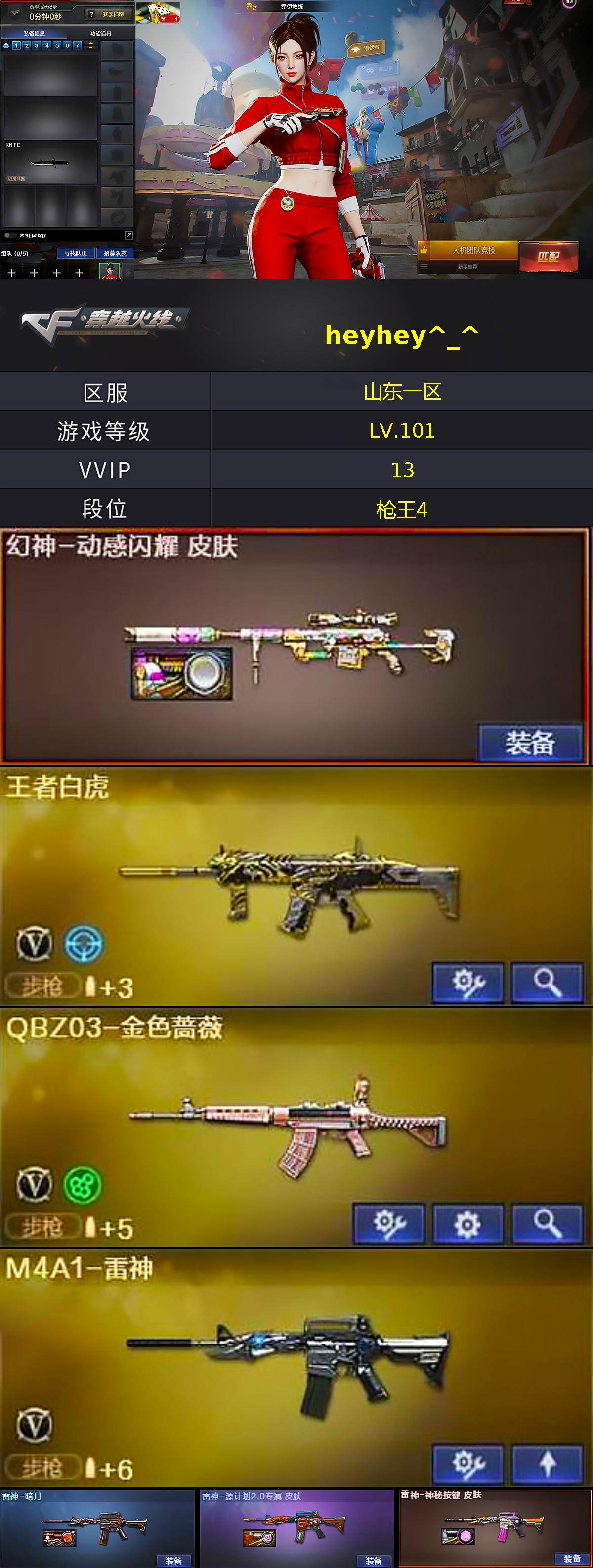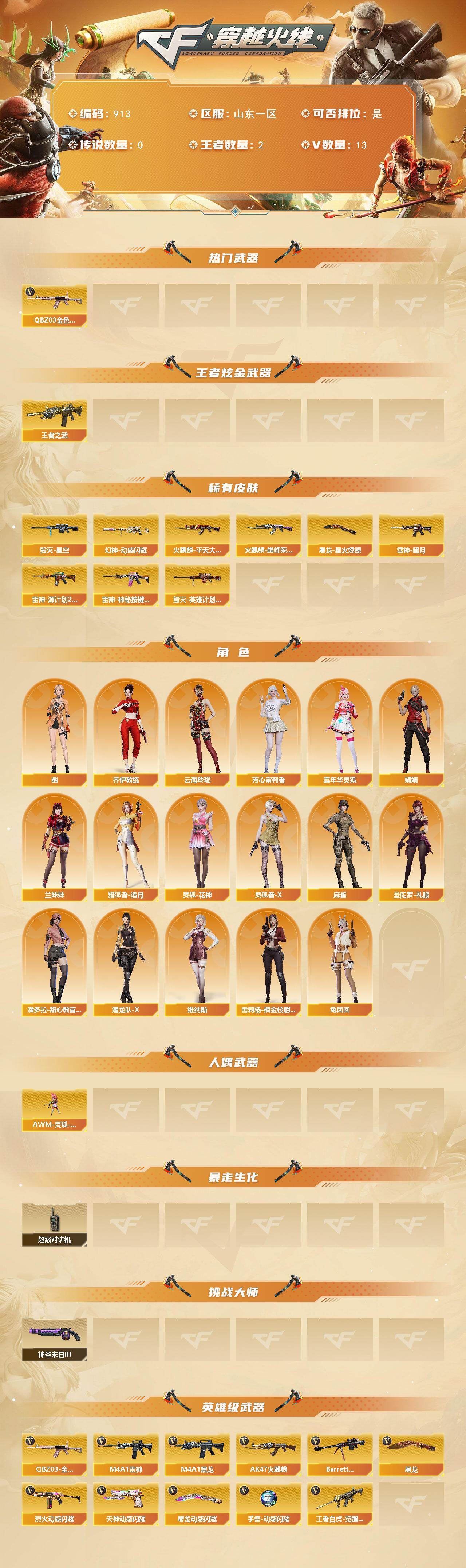 [17183461]山东一区-13V-2王者-0炫金 【热门武器】:QBZ03-金色蔷薇 【王者炫金武器】:王者之武 【皮肤】:幻神-动感闪耀 皮肤,雷神-暗月,雷神-源计划2.0专属 皮肤,雷神-神秘按键 皮肤,火麒麟-平天大圣,火麒麟-巅峰荣耀,毁灭-星空,毁灭-英雄计划 皮肤,屠龙-星火燎原 【角色】:乔伊教练,云海玲珑,芳心审判者,嘉年华灵狐,娟娟,兰妹妹,猎狐者-追月,灵狐-花神,灵狐者-X,麻雀,曼陀罗-礼服,潘多拉-甜心教官,潜龙队-X,兔囡囡,维纳斯,雪莉杨-摸金校尉,幽 【人偶武器】:AWM-灵狐-15周年嘉年华*2 【暴走生化】:超级对讲机 【挑战大师】:神圣爆裂者-末日III 【英雄级武器】:AK47-火麒麟,M4A1-黑龙,M4A1-雷神,QBZ03-金色蔷薇,烈火-动感闪耀,王者白虎-觉醒版,Barrett-毁灭,天神-动感闪耀,屠龙*2,屠龙-动感闪耀,手雷-动感闪耀 【道具】:全能枪王背包,迷你冰龙背包,救世主-黑桃战神,绿色巨人,灵魂忍者,迷雾幽灵,夺命之镰,防化服*3,金色流光-枪王排位*2,流光-鎏金之域,流光-再燃火线,枪王排位29赛季金色流光,动感闪耀表情,防弹头盔*4,防弹衣*4,C4工具钳*4,手雷包*4 【特殊枪械】: