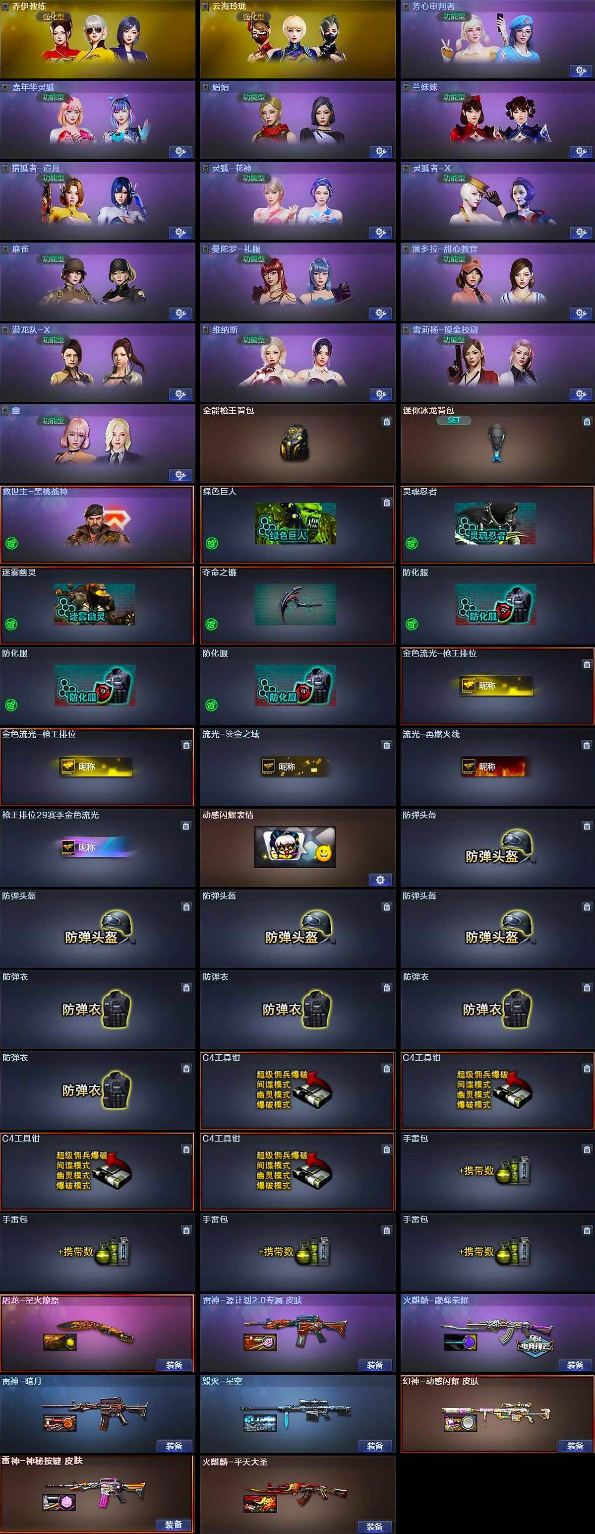【道具】:全能枪王背包,迷你冰龙背包,救世主-黑桃战神,绿色巨人,灵魂忍者,迷雾幽灵,夺命之镰,防化服*3,金色流光-枪王排位*2,流光-鎏金之域,流光-再燃火线,枪王排位29赛季金色流光,动感闪耀表情,防弹头盔*4,防弹衣*4,C4工具钳*4,手雷包*4