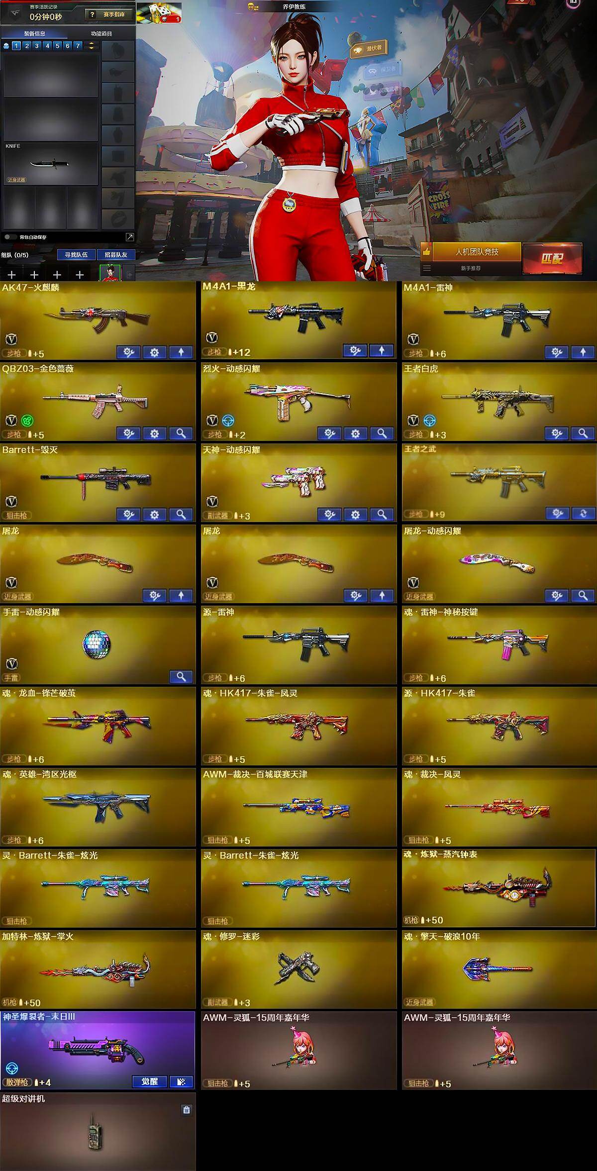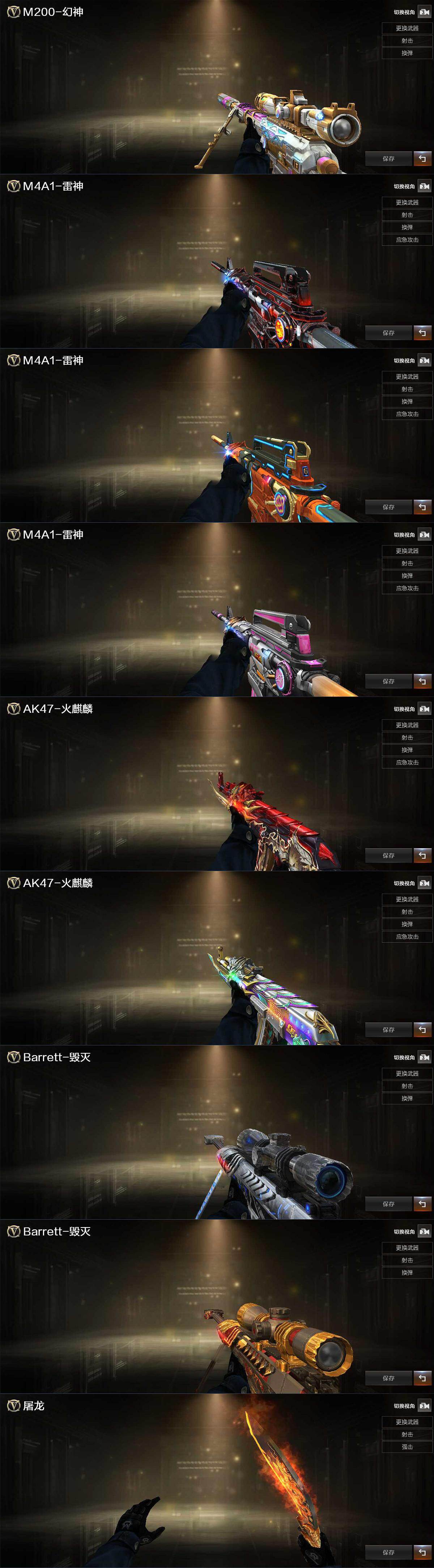 【英雄级武器】:AK47-火麒麟,M4A1-黑龙,M4A1-雷神,QBZ03-金色蔷薇,烈火-动感闪耀,王者白虎-觉醒版,Barrett-毁灭,天神-动感闪耀,屠龙*2,屠龙-动感闪耀,手雷-动感闪耀