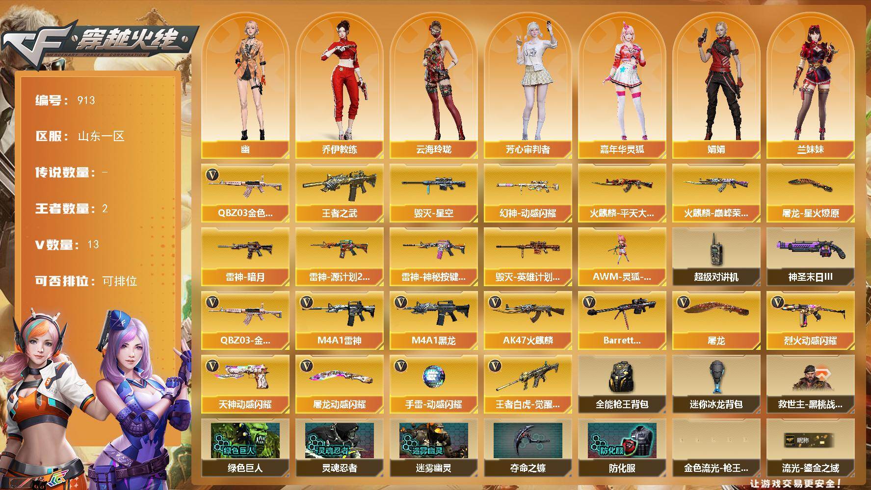- [16393837]湖南一区-25V-3王者-1炫金 【热门武器】:QBZ03-金色蔷薇,HK417-朱雀,M200-幻神,加特林-炼狱 【王者炫金武器】:王者之心,王者之力,王者之啸,炫金天龙 【音效卡】:天神-动感闪耀 音效卡 【皮肤】:火麒麟-心动糖果,M4A1-千变-孔明皮肤,黑龙-能量核心,无影-能量核心*2,极光-能量核心,龙啸-青青莓果 皮肤 【角色】:乔伊教练,暗夜-X,芳心审判者,风暴女,嘉年华灵狐,兰-新年限定,兰妹妹,猎狐者-追月,0号玩家,灵狐-花神,灵狐者-X,灵狐者-七夕宝贝,麻雀,曼陀罗-X,曼陀罗-礼服,萌儿,潘多拉-X,潘多拉-甜心教官,邱刚敖,斯沃特-X,铁骑荣耀,兔囡囡,雪莉杨 【人偶武器】:AWM-灵狐-15周年嘉年华,M37-葵,迷你深渊冰龙*2,迷你波特博士,夺魂,生化手雷-机甲核心*2,深渊终结者手雷*2,迷你艾比,迷你巨石泰坦-魔花研究所 【暴走生化】:超级对讲机 【挑战大师】:激光毁灭者III-白马银枪,激光毁灭者III,神圣爆裂者-末日III 【英雄级武器】:M4A1-千变*2,AK47-火麒麟*3,M4A1-雷神,AK12-天启*2,AK47-机械迷城,M4A1-龙血,HK417-朱雀,QBZ03-金色蔷薇,烈火-动感闪耀,黑骑士-海王,Barrett-极光,M200-幻神,加特林-炼狱,天神-动感闪耀,龙啸,唐刀-神工天巧,屠龙-动感闪耀,龙啸-堕天神,手雷-动感闪耀 【道具】:CFS限定背包,EP战队炫彩背包,炫彩背包,背包-洛丽塔,超级背包,哔哩哔哩名片,绿色巨人,灵魂忍者,变异宝贝,迷雾幽灵,生化弹匣,夺命之镰,防化服*2,金色流光-枪王排位*2,星辰流光-枪王排位,枪王排位28赛季金色流光,枪王排位29赛季金色流光,循环实验表情,动感闪耀表情,EP战队名片,EP战队喷图,防弹头盔*3,防弹衣*4,C4工具钳*2,手雷包*2 【特殊枪械】:1炼狱