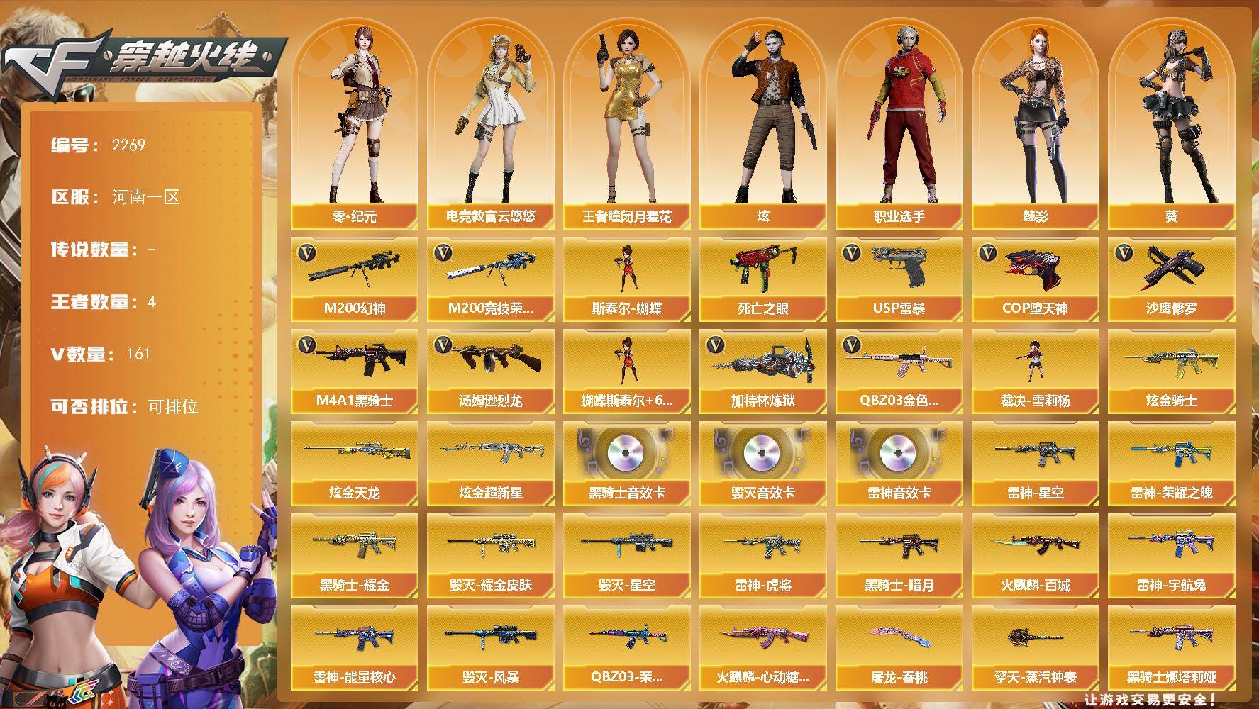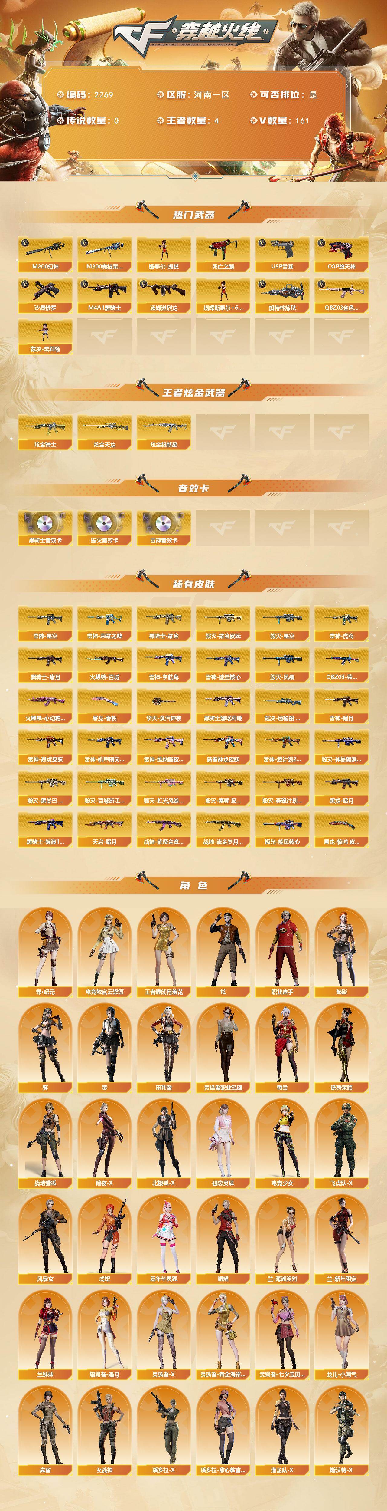 [17104965]河南一区-166V-4王者武器数-5炫金武器数 【热门武器】:QBZ03-金色蔷薇,M200-幻神,M200-竞技荣光,死亡之眼,M4A1-黑骑士,汤姆逊-烈龙*7,加特林-炼狱,斯泰尔-蝴蝶,裁决-雪莉杨,USP-雷暴,COP-堕天神,沙鹰-修罗*8 【王者炫金武器】:炫金骑士,炫金超新星*3,炫金天龙 【音效卡】:M4A1-雷神音效卡,M4A1-黑骑士音效卡,Barrett-毁灭音效卡 【皮肤】:QBZ03-荣耀世冠白鲨,裁决-运输船 皮肤,雷神-暗月,雷神-能量核心,雷神-荣耀之魄,雷神-星空,雷神-虎将,雷神-烈虎皮肤,雷神-机甲刑天皮肤,雷神-宇航兔皮肤,雷神-维纳斯皮肤,M4A1-雷神-新春神龙皮肤,雷神-源计划2.0专属 皮肤,火麒麟-百城,火麒麟-心动糖果,毁灭耀金皮肤,毁灭-星空,毁灭-风暴,毁灭-神秘黑洞皮肤,毁灭-黑曼巴 皮肤,毁灭-百城浙江 皮肤,毁灭-虹光风暴 皮肤,毁灭-秦师 皮肤,毁灭-英雄计划 皮肤,黑龙-暗月,黑骑士-暗月,黑骑士耀金皮肤,黑骑士-破浪10年皮肤,M4A1-黑骑士-娜塔莉娅 皮肤,天启-暗月,战神-紫绶金章皮肤,战神-流金岁月皮肤,极光-能量核心,屠龙-春桃 皮肤,屠龙-惊鸿 皮肤,擎天-蒸汽钟表 皮肤 【角色】:零,葵,魅影,炫,电竞教官-云悠悠,审判者,零·纪元,战地猎狐,王者-瞳-闭月羞花,暗夜-X,北极狐-X,初恋灵狐,电竞少女,飞虎队-X,风暴女,虎妞,嘉年华灵狐,娟娟,兰-海滩派对,兰-新年限定,兰妹妹,猎狐者-追月,0号玩家,灵狐者-X,灵狐者-黄金海岸,灵狐者-七夕宝贝,灵狐者-职业经理,龙儿-小淘气,麻雀,女战神,潘多拉-X,潘多拉-甜心教官,潜龙队-X,斯沃特-X,蜀雪,铁骑荣耀,兔囡囡,新娜塔莎,雪莉杨-摸金校尉,夜玫瑰-幻能朋克,樱-战斗天使,影武者-X,职业选手 【人偶武器】:裁决-雪莉杨,斯泰尔-蝴蝶,AWM-灵狐-15周年嘉年华,COP-旗袍,迷你波特博士,迷你牛牛 【暴走生化】:死亡之眼,超级对讲机 【挑战大师】:神圣爆裂者III,神圣爆裂者-末日III 【英雄级武器】:M4A1-千变,AK47-火麒麟*4,M4A1-黑龙*2,M4A1-雷神*4,M4A1-黑骑士,AK47-无影,M4A1-死神,AK12-天启,AN94-超新星,M4A1-武圣,AK47-黑鲨,M4A1-龙血,M4A