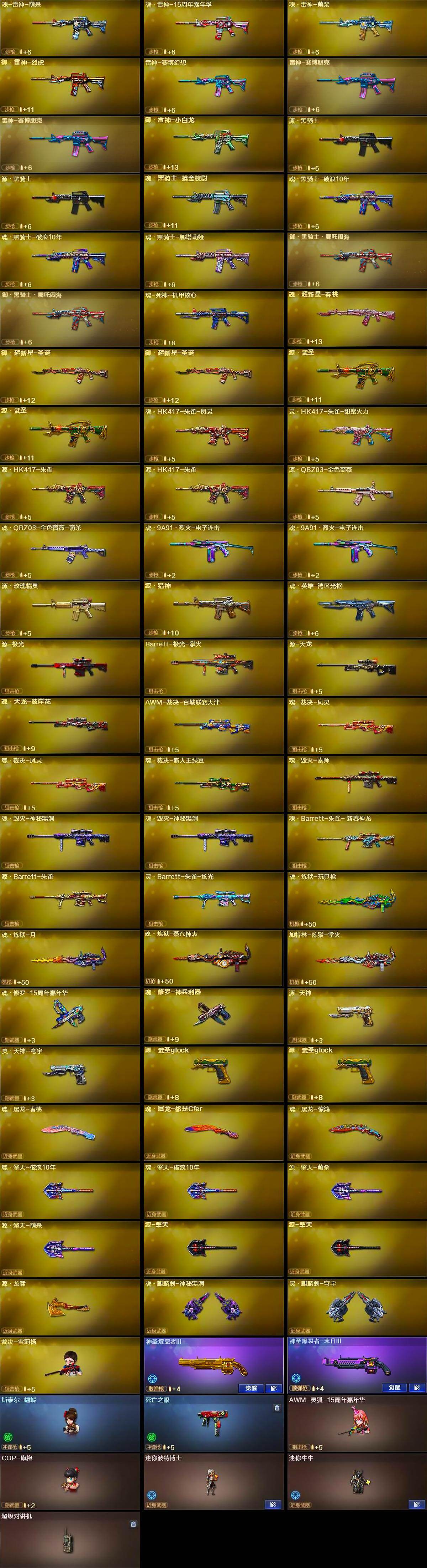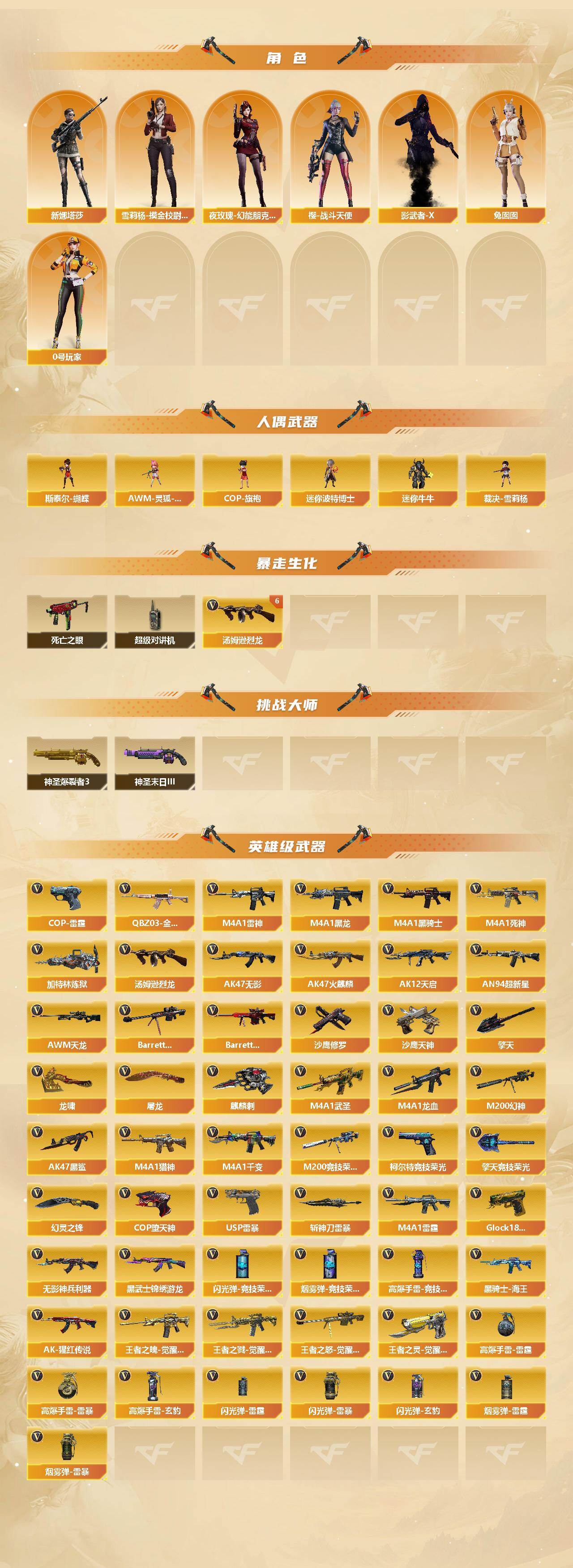【英雄级武器】:M4A1-千变,AK47-火麒麟*4,M4A1-黑龙*2,M4A1-雷神*4,M4A1-黑骑士,AK47-无影,M4A1-死神,AK12-天启,AN94-超新星,M4A1-武圣,AK47-黑鲨,M4A1-龙血,M4A