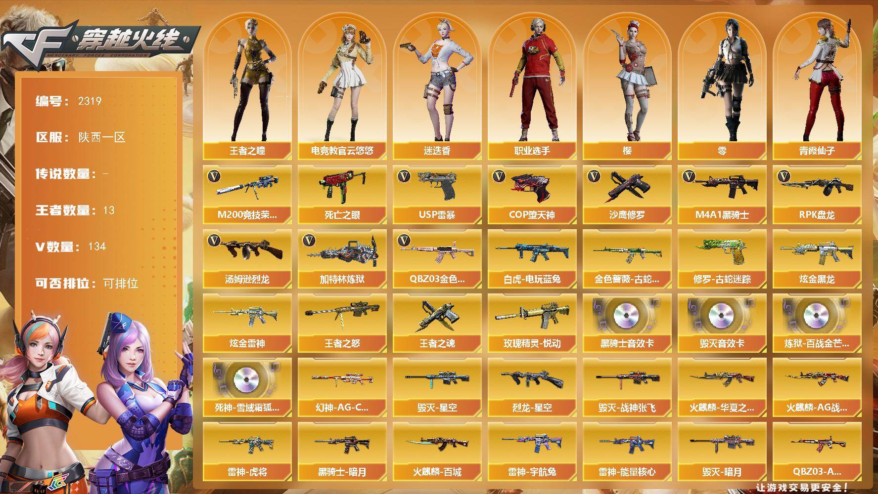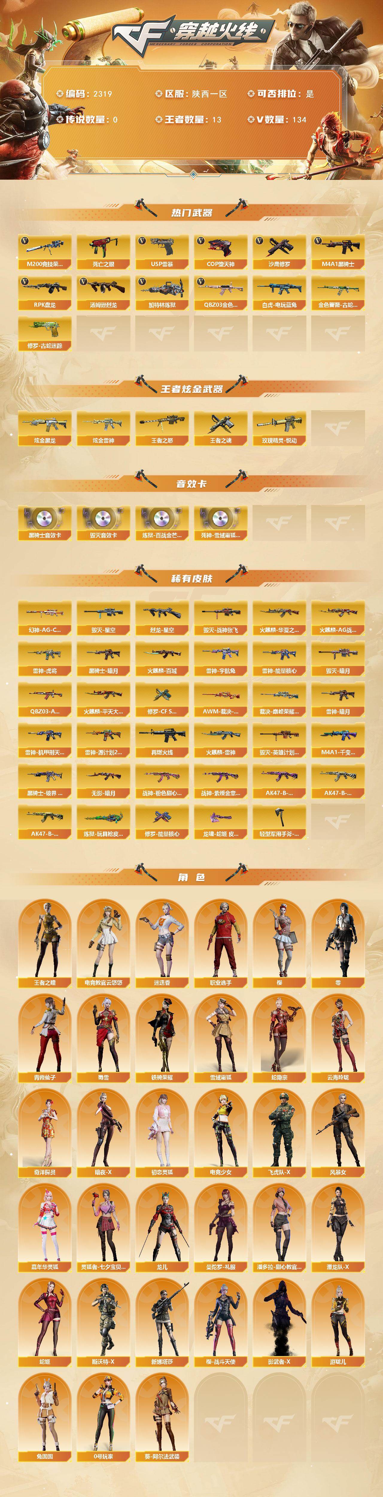 [17128745]陕西一区-137V-13王者武器数-2炫金武器数 【热门武器】:QBZ03-金色蔷薇,金色蔷薇-古蛇迷踪,修罗-古蛇迷踪,M200-竞技荣光,死亡之眼,白虎-电玩蓝兔,M4A1-黑骑士*2,汤姆逊-烈龙*5,RPK-盘龙*6,加特林-炼狱*3,USP-雷暴,COP-堕天神*3,沙鹰-修罗*2 【王者炫金武器】:玫瑰精灵-悦动*2,王者之怒,王者之魂,炫金黑龙,炫金雷神 【音效卡】:M4A1-黑骑士音效卡*2,Barrett-毁灭音效卡*2,炼狱-百战金芒-庆典舞曲音效卡,死神-雪域霜狐-怀旧音效卡 【皮肤】:幻神-AG-CFPL S24冠军 皮肤,QBZ03-AG-CFPLS19冠军,AWM-裁决-凤灵皮肤,裁决-巅峰荣耀 皮肤,烈龙-星空,雷神-暗月,雷神-能量核心,雷神-虎将,雷神-机甲刑天皮肤,雷神-宇航兔皮肤,雷神-源计划2.0专属 皮肤,M4A1-再燃火线,火麒麟-AG战队皮肤,火麒麟-雷神*2,火麒麟-华夏之心,火麒麟-平天大圣,火麒麟-百城,毁灭-暗月,毁灭-星空*2,毁灭-战神张飞,毁灭-英雄计划 皮肤,M4A1-千变-孔明皮肤,黑骑士-暗月,黑骑士-破界 皮肤,无影-暗月,战神-粉色甜心皮肤,战神-紫绶金章皮肤,AK47-B-常胜将军-曹操*2,AK47-B-常胜将军-刘备,AK47-B-常胜将军-孙权*2,炼狱-玩具枪皮肤,修罗-CF STAR,修罗-能量核心*2,龙啸-蛇姬 皮肤,轻型军用手斧-再燃火线 【角色】:零,樱,迷迭香,电竞教官-云悠悠,王者之瞳,雪域霜狐,蛇隐宗,奇洋探员,云海玲珑,葵-阿尔法武装,暗夜-X,初恋灵狐,电竞少女,飞虎队-X,风暴女,嘉年华灵狐,0号玩家,灵狐者-七夕宝贝,龙儿,曼陀罗-礼服,潘多拉-甜心教官,潜龙队-X,青霞仙子,蛇姬,斯沃特-X,蜀雪,铁骑荣耀,兔囡囡,新娜塔莎,樱-战斗天使,影武者-X,游珑儿,职业选手 【人偶武器】:巴雷特-零-水下丽影,Scar Light-马枪,迷你深渊冰龙,迷你波特博士,迷你曼提柯尔,夺魂,迷你火种,生化手雷-机甲核心,闪光弹-貂蝉,高爆手雷-大乔,迷你超能女侍 【暴走生化】:死亡之眼,超级对讲机 【挑战大师】:神圣爆裂者III,冰龙粉碎者-白马银枪*2,激光毁灭者III-白马银枪,激光毁灭者III,机甲撕裂者III,试炼破坏者III,神圣爆裂者-末日III 【英雄级武器