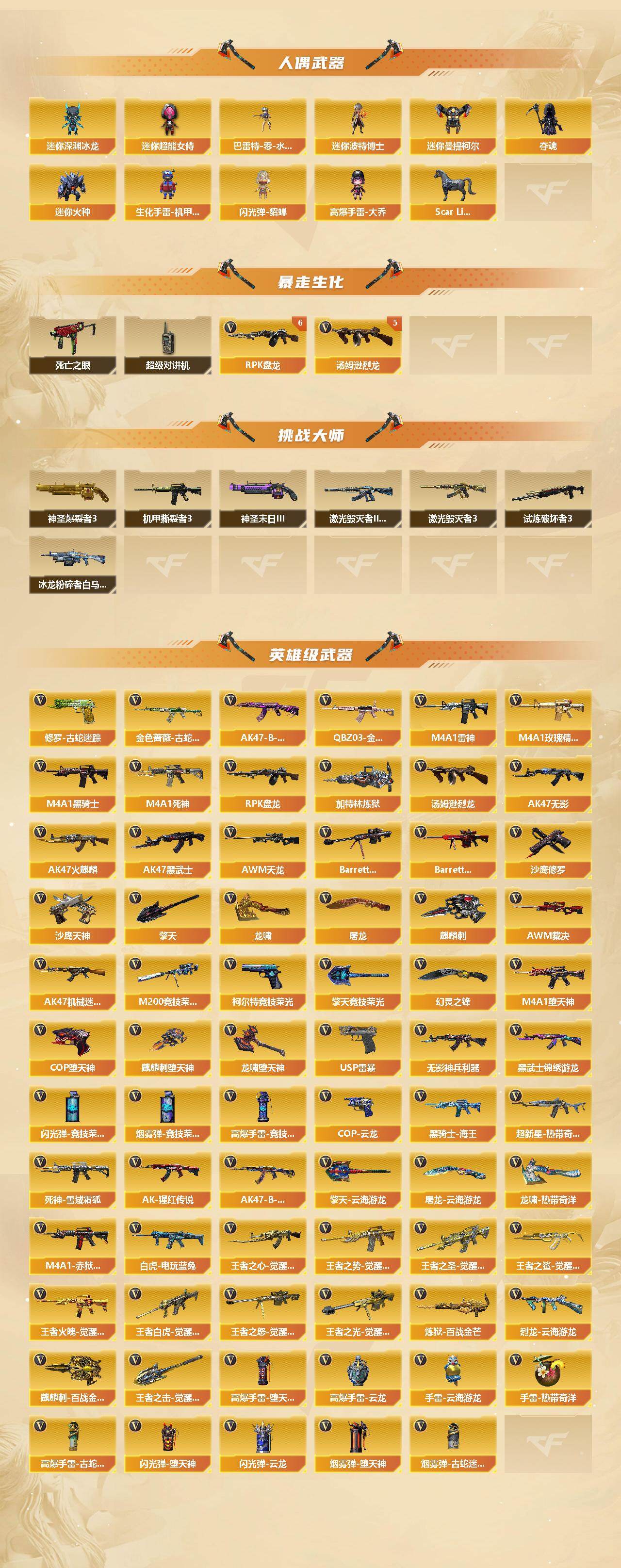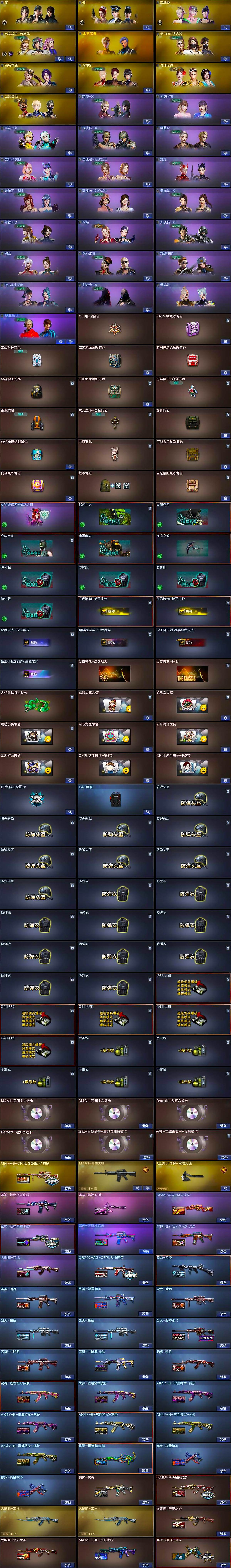 【皮肤】:幻神-AG-CFPL S24冠军 皮肤,QBZ03-AG-CFPLS19冠军,AWM-裁决-凤灵皮肤,裁决-巅峰荣耀 皮肤,烈龙-星空,雷神-暗月,雷神-能量核心,雷神-虎将,雷神-机甲刑天皮肤,雷神-宇航兔皮肤,雷神-源计划2.0专属 皮肤,M4A1-再燃火线,火麒麟-AG战队皮肤,火麒麟-雷神*2,火麒麟-华夏之心,火麒麟-平天大圣,火麒麟-百城,毁灭-暗月,毁灭-星空*2,毁灭-战神张飞,毁灭-英雄计划 皮肤,M4A1-千变-孔明皮肤,黑骑士-暗月,黑骑士-破界 皮肤,无影-暗月,战神-粉色甜心皮肤,战神-紫绶金章皮肤,AK47-B-常胜将军-曹操*2,AK47-B-常胜将军-刘备,AK47-B-常胜将军-孙权*2,炼狱-玩具枪皮肤,修罗-CF STAR,修罗-能量核心*2,龙啸-蛇姬 皮肤,轻型军用手斧-再燃火线