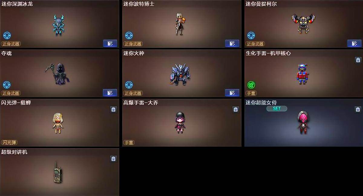 【人偶武器】:巴雷特-零-水下丽影,Scar Light-马枪,迷你深渊冰龙,迷你波特博士,迷你曼提柯尔,夺魂,迷你火种,生化手雷-机甲核心,闪光弹-貂蝉,高爆手雷-大乔,迷你超能女侍