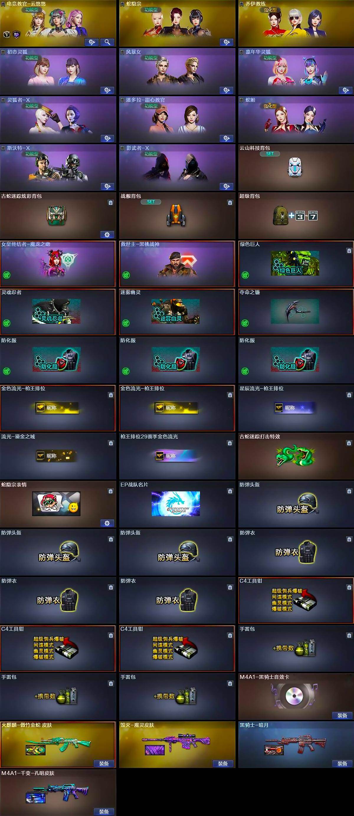【道具】:云山科技背包,古蛇迷踪炫彩背包,战舰背包,超级背包,女皇终结者-魔龙之吻,救世主-黑桃战神,绿色巨人,灵魂忍者,迷雾幽灵,夺命之镰,防化服*3,金色流光-枪王排位*2,星辰流光-枪王排位,流光-鎏金之域,枪王排位29赛季金色流光,古蛇迷踪打击特效,蛇隐宗表情,EP战队名片,防弹头盔*3,防弹衣*3,C4工具钳*3,手雷包*3