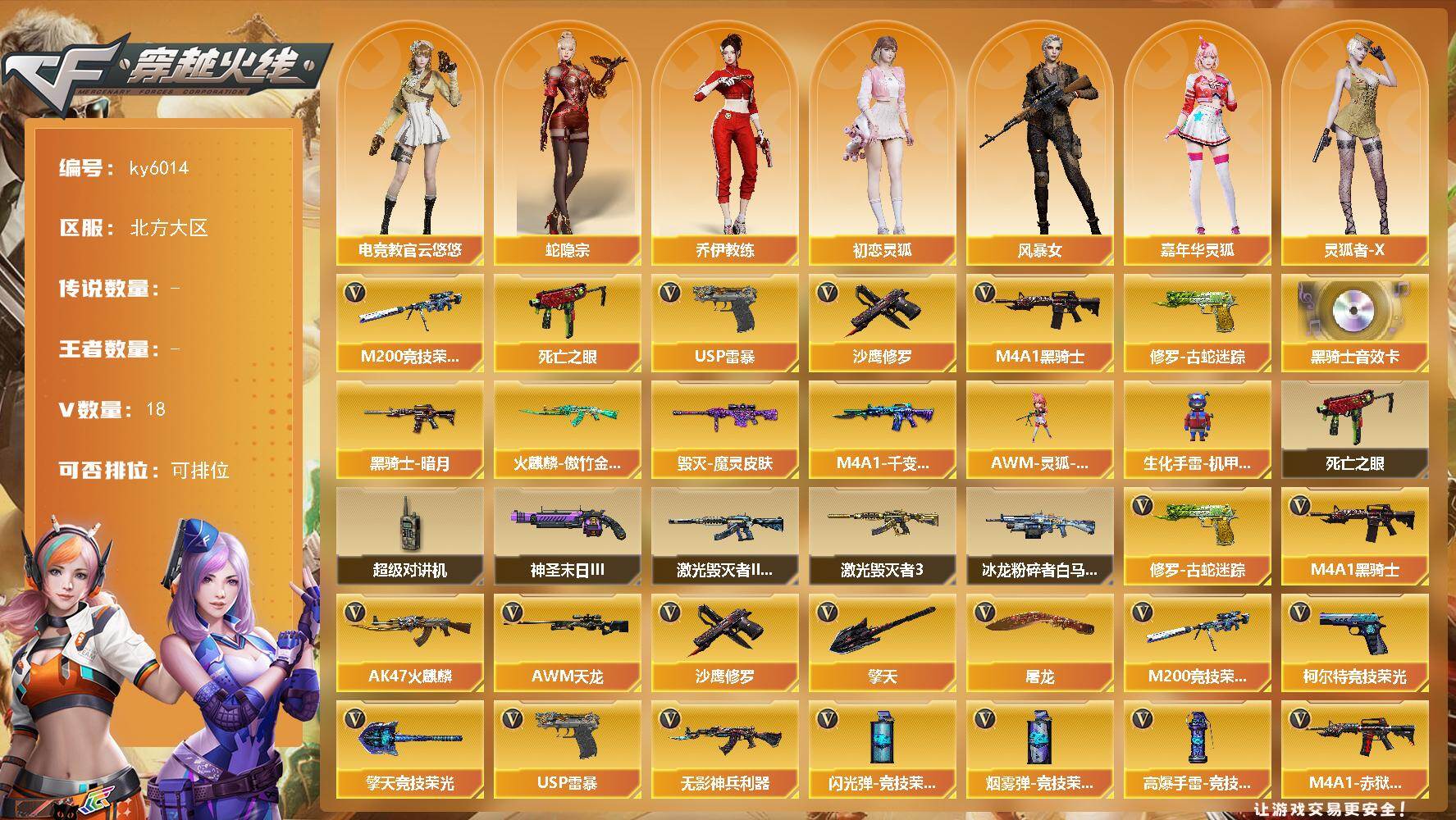[17155535]北方大区-16V-0王者武器数-0炫金武器数 【热门武器】:修罗-古蛇迷踪,M200-竞技荣光,死亡之眼,M4A1-黑骑士,USP-雷暴,沙鹰-修罗 【音效卡】:M4A1-黑骑士音效卡 【皮肤】:火麒麟-傲竹金蛇 皮肤,毁灭-魔灵皮肤,M4A1-千变-孔明皮肤,黑骑士-暗月 【角色】:电竞教官-云悠悠,蛇隐宗,乔伊教练,初恋灵狐,风暴女,嘉年华灵狐,灵狐者-X,潘多拉-甜心教官,蛇姬,斯沃特-X,影武者-X 【人偶武器】:AWM-灵狐-15周年嘉年华,生化手雷-机甲核心*2 【暴走生化】:死亡之眼,超级对讲机 【挑战大师】:冰龙粉碎者-白马银枪,激光毁灭者III-白马银枪,激光毁灭者III*2,神圣爆裂者-末日III 【英雄级武器】:AK47-火麒麟,M4A1-黑骑士,无影-神兵利器,AWM-天龙,M200-竞技荣光,沙鹰-修罗,USP-雷暴,柯尔特-竞技荣光,修罗-古蛇迷踪,屠龙,擎天,擎天-竞技荣光,高爆手雷-竞技荣光,高爆手雷-古蛇迷踪,闪光弹-竞技荣光*2,烟雾弹-竞技荣光,烟雾弹-古蛇迷踪,M4A1-赤狱骑士 【道具】:云山科技背包,古蛇迷踪炫彩背包,战舰背包,超级背包,女皇终结者-魔龙之吻,救世主-黑桃战神,绿色巨人,灵魂忍者,迷雾幽灵,夺命之镰,防化服*3,金色流光-枪王排位*2,星辰流光-枪王排位,流光-鎏金之域,枪王排位29赛季金色流光,古蛇迷踪打击特效,蛇隐宗表情,EP战队名片,防弹头盔*3,防弹衣*3,C4工具钳*3,手雷包*3 【特殊枪械】:1黑骑士