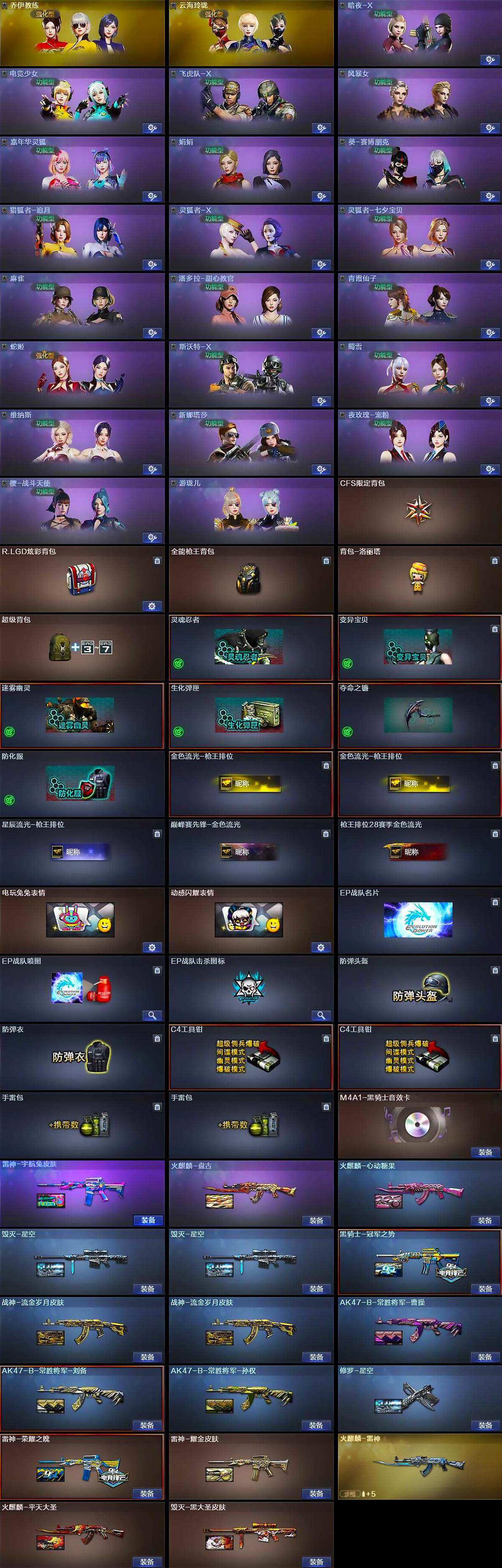 【道具】:CFS限定背包,R.LGD炫彩背包,全能枪王背包,背包-洛丽塔,超级背包,灵魂忍者,变异宝贝,迷雾幽灵,生化弹匣,夺命之镰,防化服,金色流光-枪王排位*2,星辰流光-枪王排位,巅峰赛先锋-金色流光,枪王排位28赛季金色流光,电玩兔兔表情,动感闪耀表情,EP战队名片,EP战队喷图,EP战队