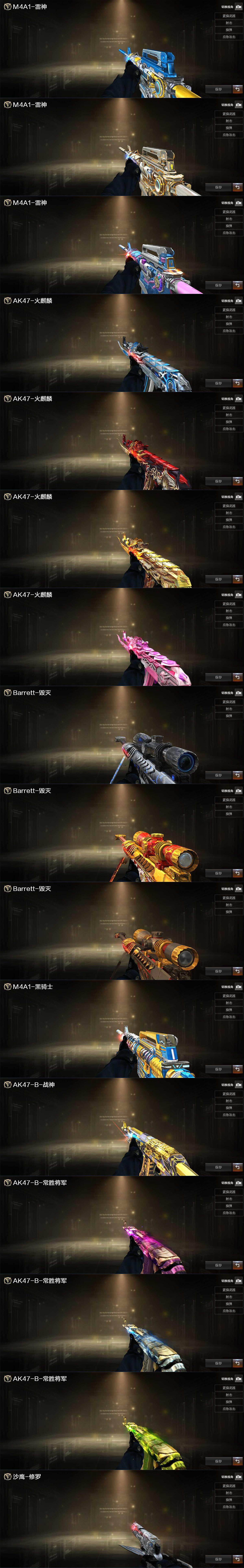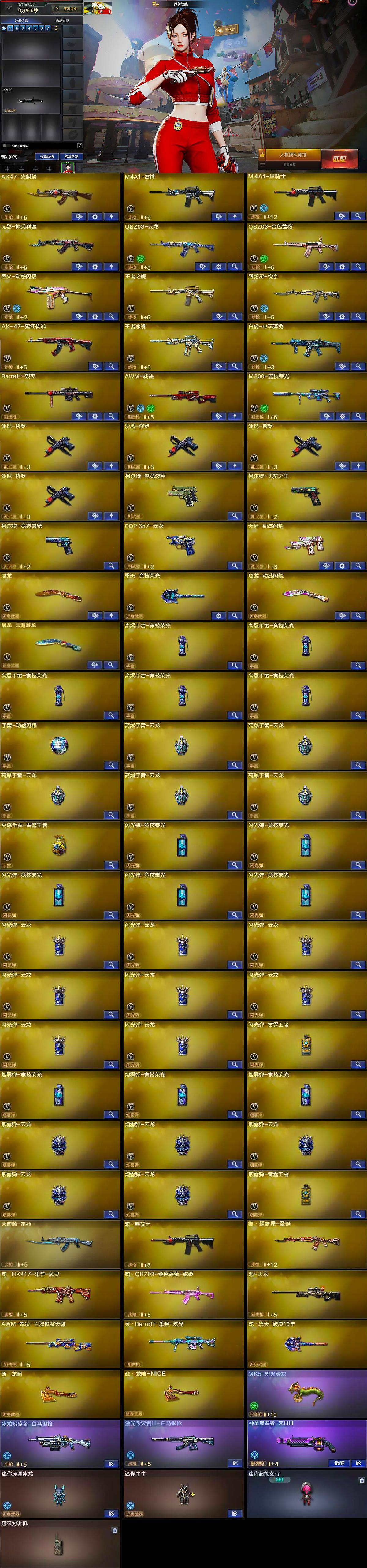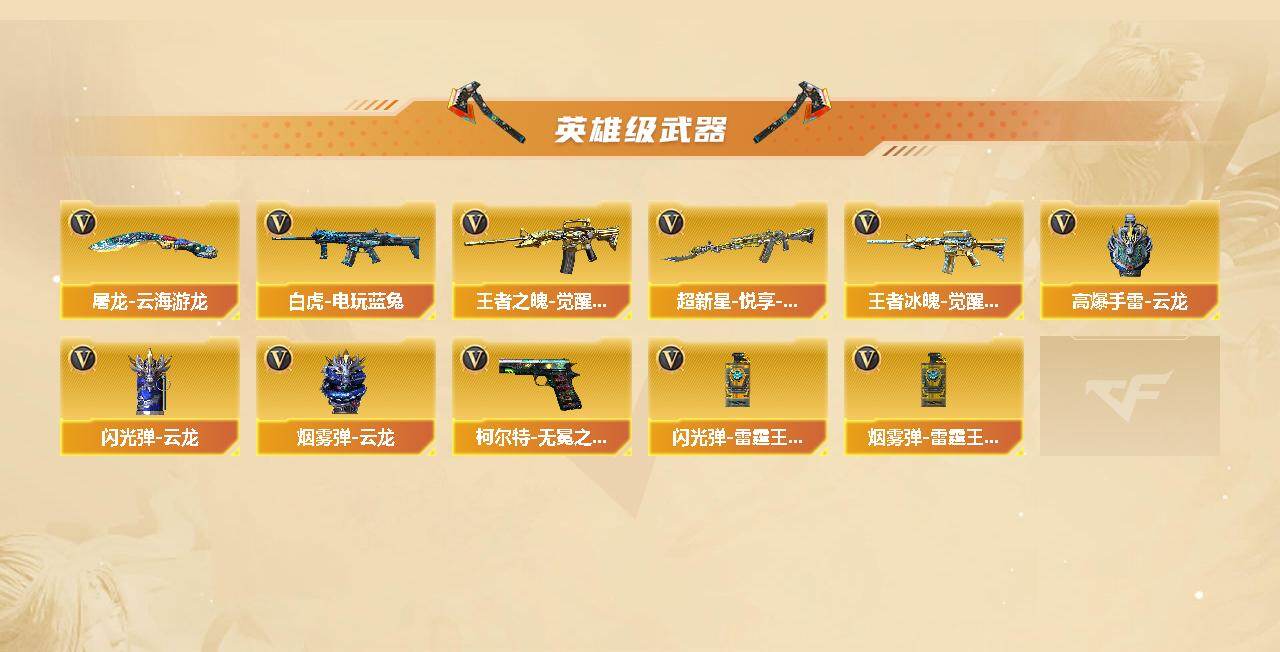 【英雄级武器】:AK47-火麒麟,M4A1-雷神,M4A1-黑骑士,无影-神兵利器,QBZ03-云龙,QBZ03-金色蔷薇,烈火-动感闪耀,王者之魄-觉醒版,超新星-悦享-觉醒版,AK-47-猩红传说,王者冰魄-觉醒版,白虎-电玩蓝兔,Barrett-毁灭,AWM-裁决,M200-竞技荣光,沙鹰-修罗*4,柯尔特-电竞装甲,柯尔特-无冕之王,柯尔特-竞技荣光,COP 357-云龙,天神-动感闪耀,屠龙,擎天-竞技荣光,屠龙-动感闪耀,屠龙-云海游龙,高爆手雷-竞技荣光*5,手雷-动感闪耀,高爆手雷-云龙*5,高爆手雷-雷霆王者-觉醒版,闪光弹-竞技荣光*5,闪光弹-云龙*8,闪光弹-雷霆王者-觉醒版,烟雾弹-竞技荣光*3,烟雾弹-云龙*5,烟雾弹-雷霆王者-觉醒版