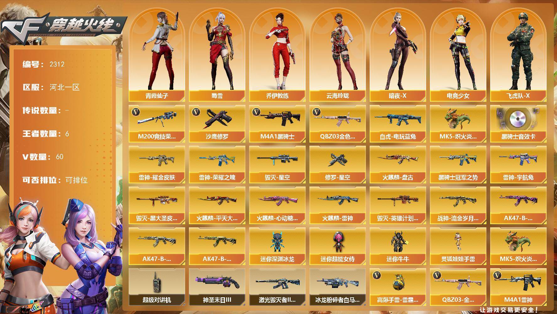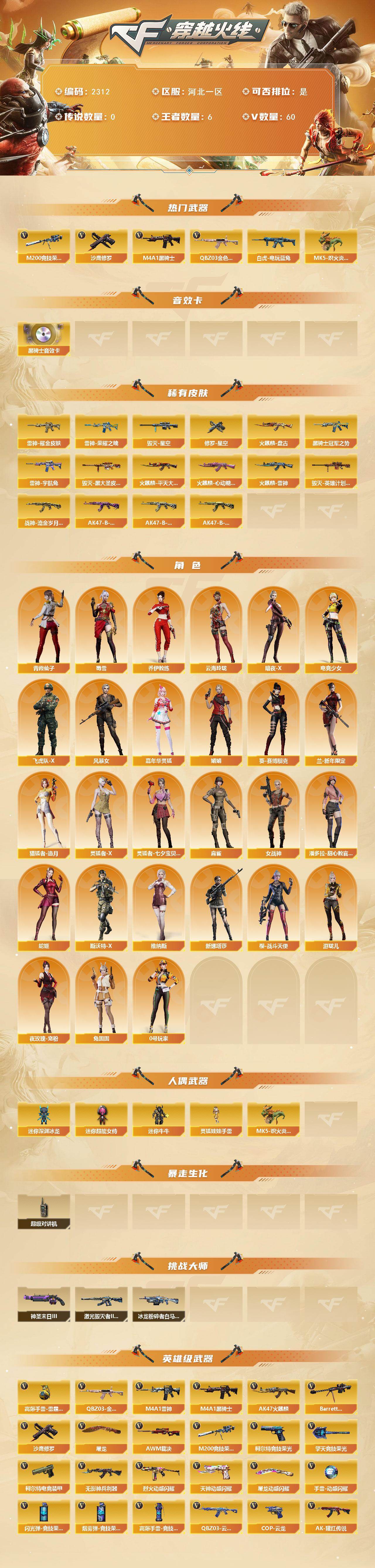 [17127260]河北一区-65V-6王者武器数-0炫金武器数 【热门武器】:QBZ03-金色蔷薇,M200-竞技荣光,白虎-电玩蓝兔,M4A1-黑骑士,MK5-炽火炎龙,沙鹰-修罗*4 【音效卡】:M4A1-黑骑士音效卡 【皮肤】:雷神-荣耀之魄,雷神-耀金皮肤,雷神-宇航兔皮肤,火麒麟-雷神,火麒麟-平天大圣,火麒麟-盘古,火麒麟-心动糖果,毁灭-星空*2,毁灭-黑大圣皮肤,毁灭-英雄计划 皮肤,黑骑士-冠军之势,战神-流金岁月皮肤*2,AK47-B-常胜将军-曹操,AK47-B-常胜将军-刘备,AK47-B-常胜将军-孙权,修罗-星空 【角色】:乔伊教练,云海玲珑,暗夜-X,电竞少女,飞虎队-X,风暴女,嘉年华灵狐,娟娟,葵-赛博朋克,兰-新年限定,猎狐者-追月,0号玩家,灵狐者-X,灵狐者-七夕宝贝,麻雀,女战神,潘多拉-甜心教官,青霞仙子,蛇姬,斯沃特-X,蜀雪,兔囡囡,维纳斯,新娜塔莎,夜玫瑰-宠粉,樱-战斗天使,游珑儿 【人偶武器】:MK5-炽火炎龙,迷你深渊冰龙,迷你牛牛,迷你超能女侍,灵狐娃娃手雷 【暴走生化】:超级对讲机 【挑战大师】:冰龙粉碎者-白马银枪,激光毁灭者III-白马银枪,神圣爆裂者-末日III 【英雄级武器】:AK47-火麒麟,M4A1-雷神,M4A1-黑骑士,无影-神兵利器,QBZ03-云龙,QBZ03-金色蔷薇,烈火-动感闪耀,王者之魄-觉醒版,超新星-悦享-觉醒版,AK-47-猩红传说,王者冰魄-觉醒版,白虎-电玩蓝兔,Barrett-毁灭,AWM-裁决,M200-竞技荣光,沙鹰-修罗*4,柯尔特-电竞装甲,柯尔特-无冕之王,柯尔特-竞技荣光,COP 357-云龙,天神-动感闪耀,屠龙,擎天-竞技荣光,屠龙-动感闪耀,屠龙-云海游龙,高爆手雷-竞技荣光*5,手雷-动感闪耀,高爆手雷-云龙*5,高爆手雷-雷霆王者-觉醒版,闪光弹-竞技荣光*5,闪光弹-云龙*8,闪光弹-雷霆王者-觉醒版,烟雾弹-竞技荣光*3,烟雾弹-云龙*5,烟雾弹-雷霆王者-觉醒版 【道具】:CFS限定背包,R.LGD炫彩背包,全能枪王背包,背包-洛丽塔,超级背包,灵魂忍者,变异宝贝,迷雾幽灵,生化弹匣,夺命之镰,防化服,金色流光-枪王排位*2,星辰流光-枪王排位,巅峰赛先锋-金色流光,枪王排位28赛季金色流光,电玩兔兔表情,动感闪耀表情,EP战队名片,EP战队喷图,EP战队