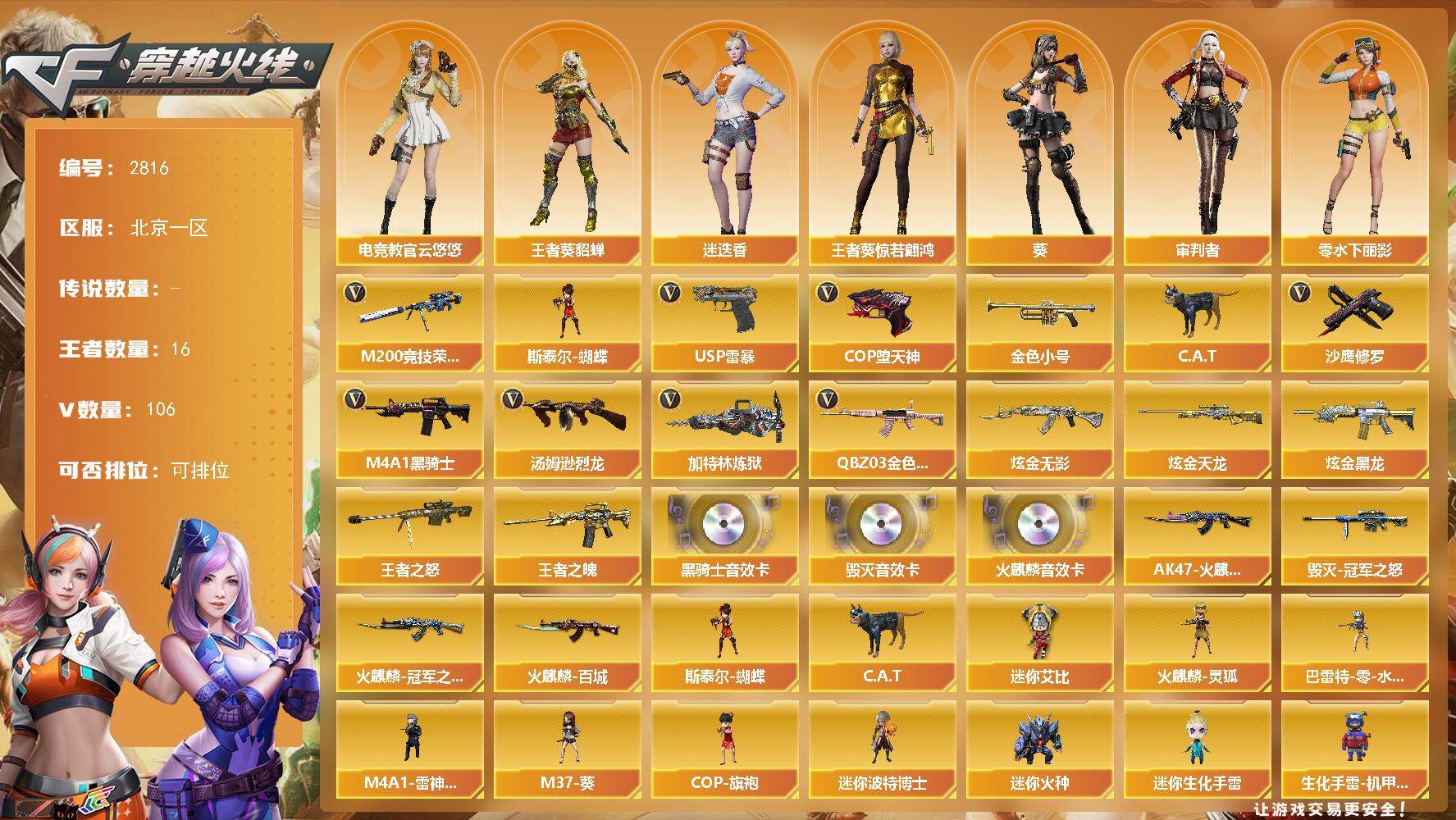 [17176545]北京一区-106V-16王者-6炫金 【热门武器】:QBZ03-金色蔷薇*2,M200-竞技荣光,金色小号,C.A.T,M4A1-黑骑士*2,汤姆逊-烈龙*5,加特林-炼狱*2,斯泰尔-蝴蝶,USP-雷暴,COP-堕天神*2,沙鹰-修罗*2 【王者炫金武器】:炫金无影*2,炫金天龙*2,炫金黑龙*2,王者之怒*6,王者之魄*3 【音效卡】:AK47-火麒麟音效卡*2,M4A1-黑骑士音效卡,Barrett-毁灭音效卡 【稀有皮肤】:火麒麟-冠军之心,AK47-火麒麟-传奇EVEN,火麒麟-百城,毁灭-冠军之怒 【角色】:王者-葵-貂蝉,王者葵-惊若翩鸿,零-水下丽影,审判者,葵,迷迭香,电竞教官-云悠悠,战地猎狐,蜀雪,铁骑荣耀 【人偶武器】:斯泰尔-蝴蝶,火麒麟-灵狐,巴雷特-零-水下丽影*2,M4A1-雷神-精英刀锋,M37-葵,COP-旗袍,C.A.T,迷你艾比,迷你波特博士,迷你火种,迷你生化手雷,生化手雷-机甲核心,深渊终结者手雷,闪光弹-小乔 【暴走生化】:斯泰尔-蝴蝶,超级对讲机 【挑战大师】:神圣爆裂者III,神圣爆裂者-末日III,试炼破坏者III,激光毁灭者III-白马银枪,冰龙粉碎者-白马银枪 【英雄级武器】:M200-竞技荣光,柯尔特-竞技荣光,擎天-竞技荣光,高爆手雷-竞技荣光*2,烟雾弹-竞技荣光,闪光弹-竞技荣光,M4A1-堕天神,COP-堕天神*2,麒麟刺-堕天神,龙啸-堕天神*2,USP-雷暴,QBZ03-金色蔷薇*2,M4A1-雷神*3,M4A1-黑龙,M4A1-黑骑士*2,M4A1-死神*2,加特林-炼狱*2,汤姆逊-烈龙*5,AK47-火麒麟,AN94-超新星,AWM-天龙,Barrett-毁灭*2,AK47-机械迷城,AK47-黑鲨,M4A1-千变,黑骑士-海王*2,AK-47-猩红传说*25,AK47-B-战神,AWM-昌龙,沙鹰-天神,沙鹰-修罗*2,麒麟刺,屠龙*4 【特殊枪械】:蝴蝶斯泰尔+5烈龙,2黑骑士,5烈龙,2炼狱,1蝴蝶斯泰尔