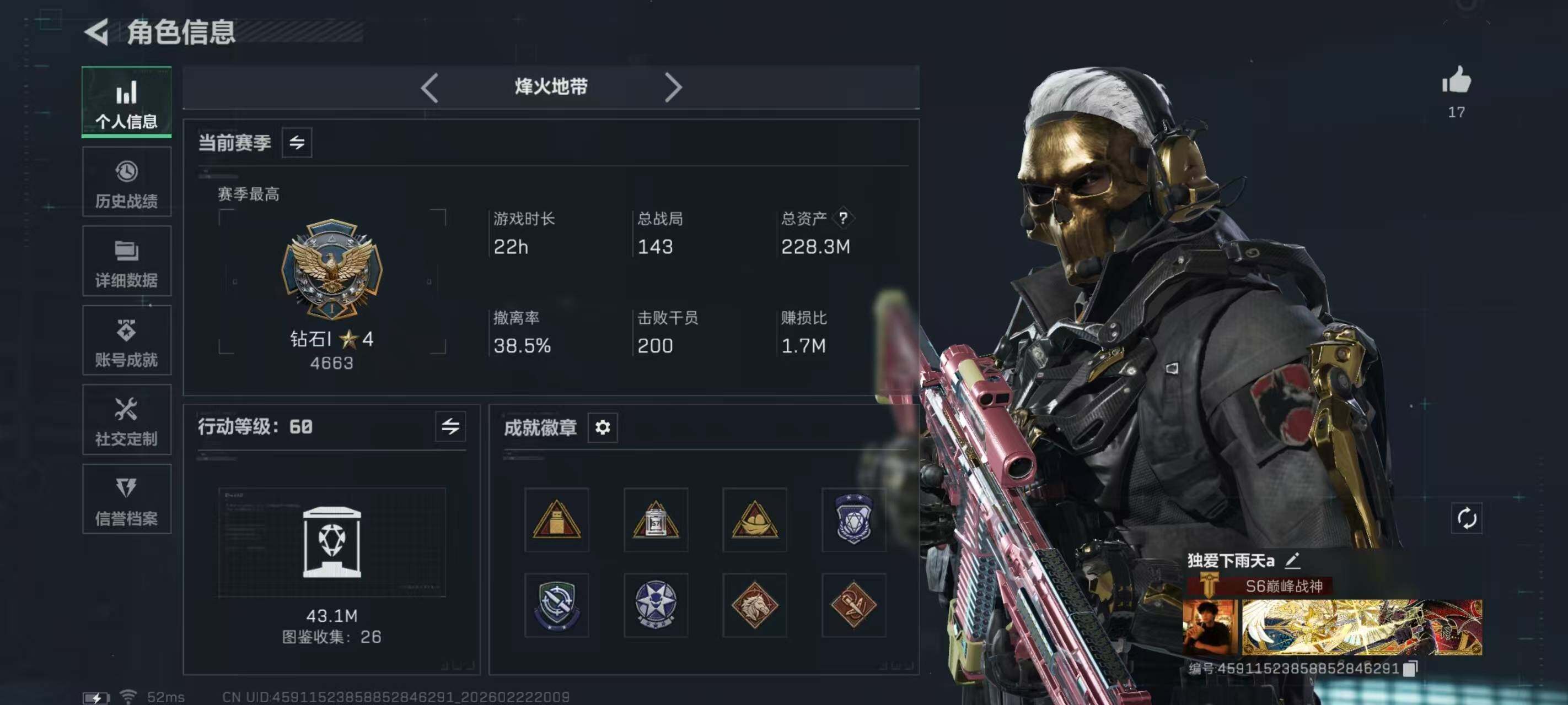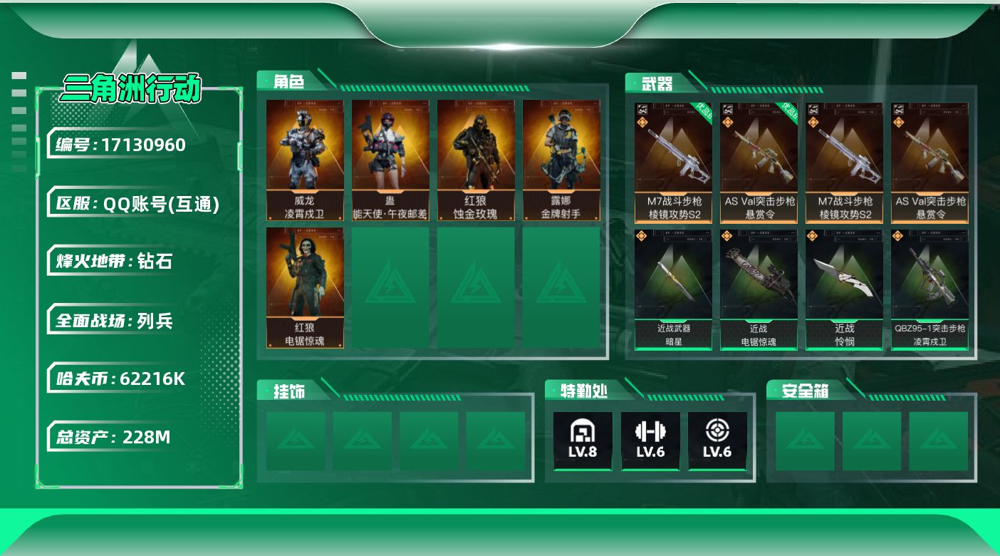 - [11852049]总资产:153.9M 1干员外观 11传说枪械 哈夫币:694.996K 可二次 可修改实名 烽火地带段位:白银 全面战场段位:无段位 传说武器皮肤:UZI冲锋枪-特斯拉线圈,M16A4突击步枪-狩猎时刻,AK-12突击步枪-特斯拉线圈,SR-3M紧凑突击步枪-特斯拉线圈,勇士冲锋枪-能天使-午夜邮差,Vector冲锋枪-狩猎时刻,G3战斗步枪-狩猎时刻,复合弓-黑-天际线,725双管霰弹枪-送葬人-无题密令,M4A1突击步枪-阿米娅,CAR-15突击步枪-阿米娅 史诗武器皮肤:PKM通用机枪-蝮蛇,QJB201轻机枪-Old Habits,SV-98狙击步枪-林中猎手,PKM通用机枪-荒野求生,腾龙突击步枪-无垢,MP7冲锋枪-无垢,PSG-1射手步枪-无垢,SVD狙击步枪-荒野求生,SR-3M紧凑突击步枪-荒野求生,M700狙击步枪-竞技风 干员外观:蜂医-送葬人·无题密令(S5)