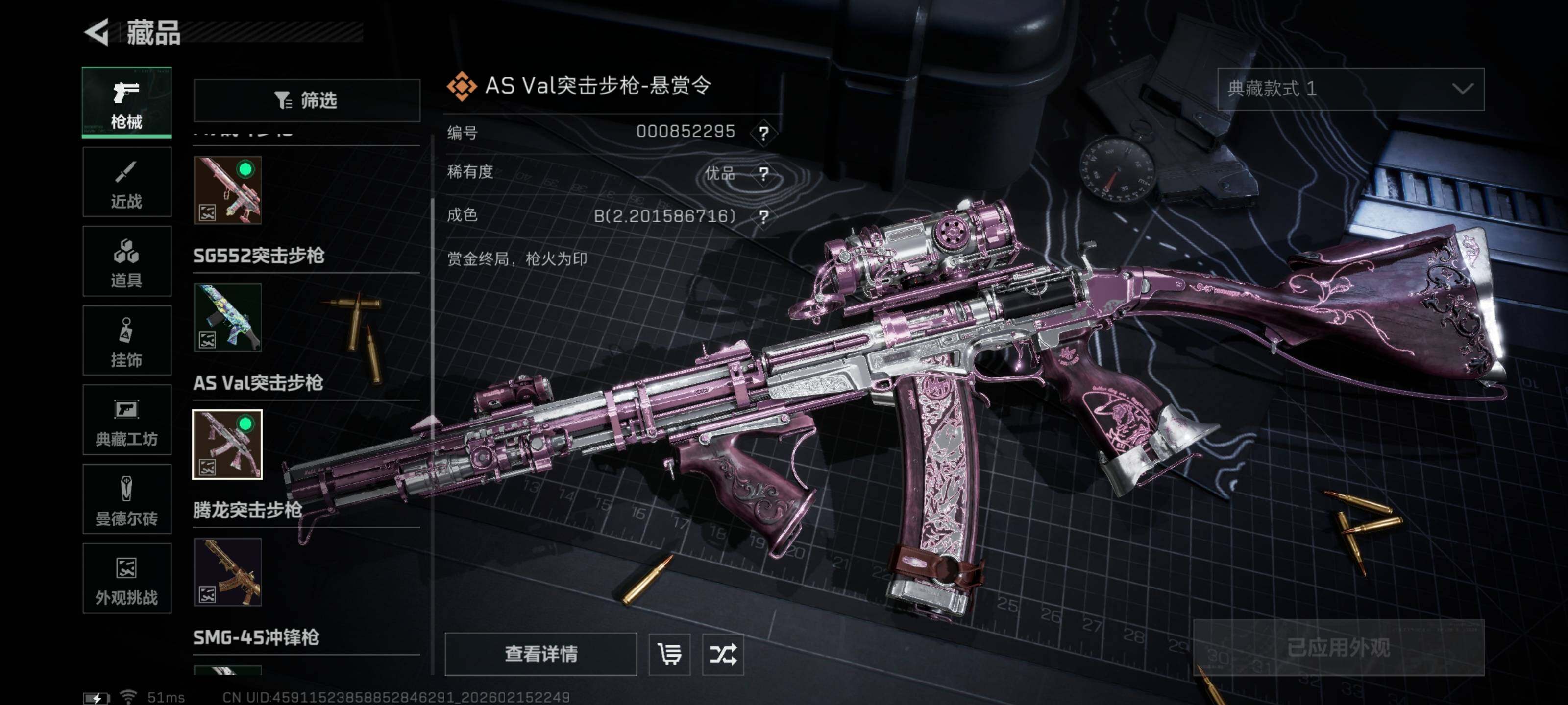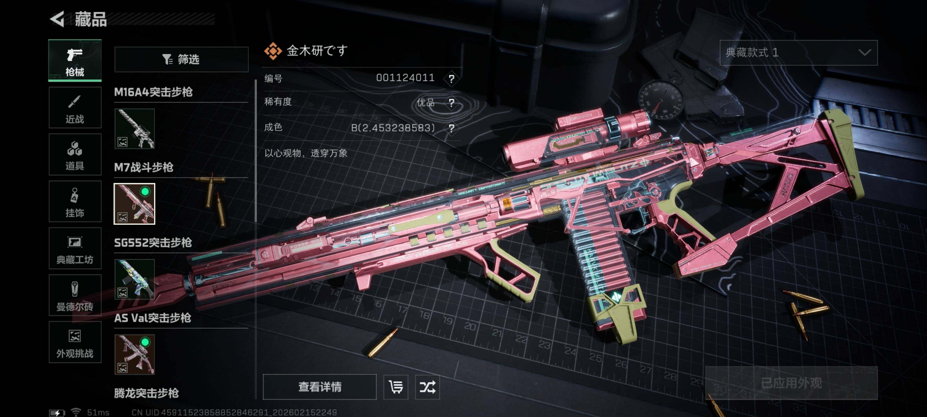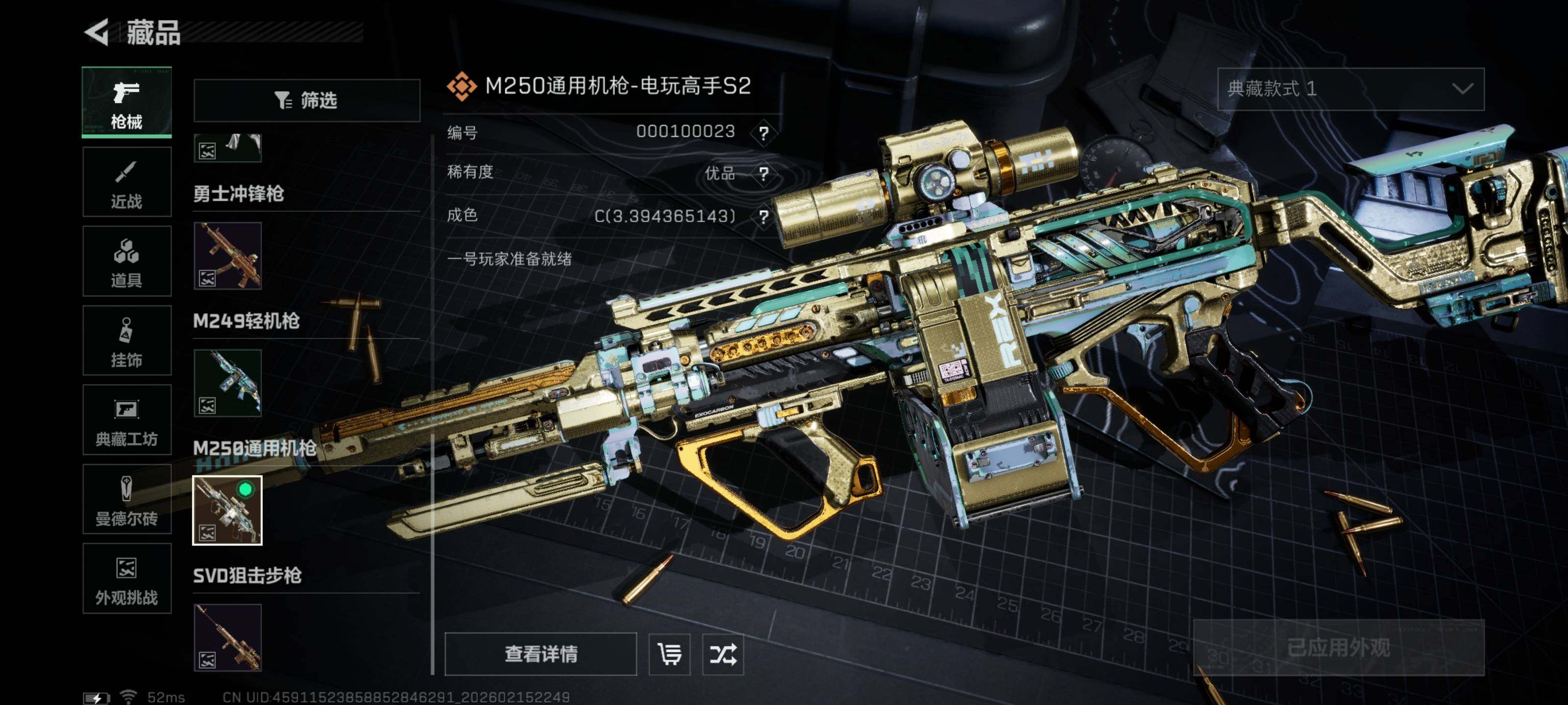 【典藏外观成色】:M7战斗步枪-棱镜攻势S2(优品B),AS Val突击步枪-悬赏令(优品B),M250通用机枪-电玩高手S2(优品C)