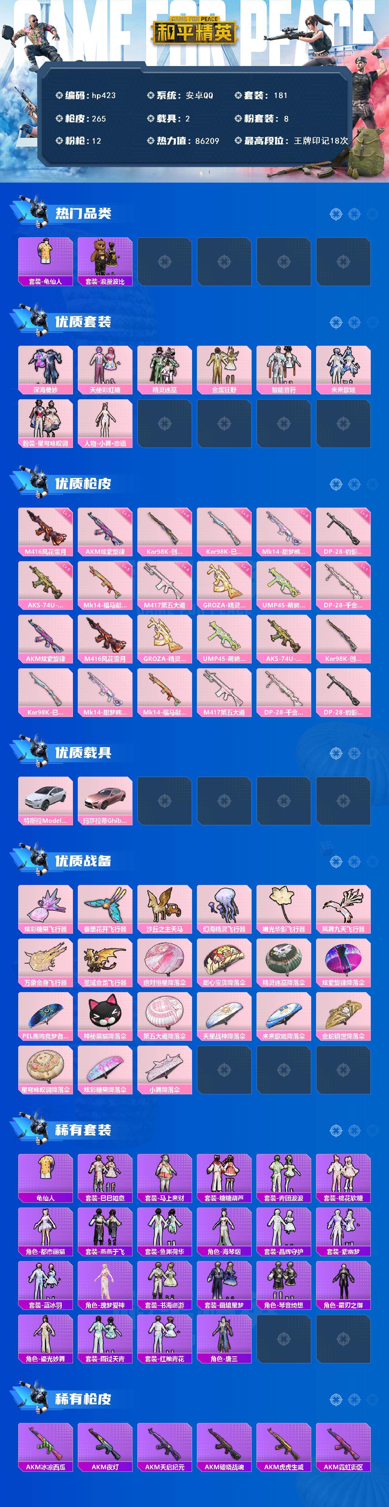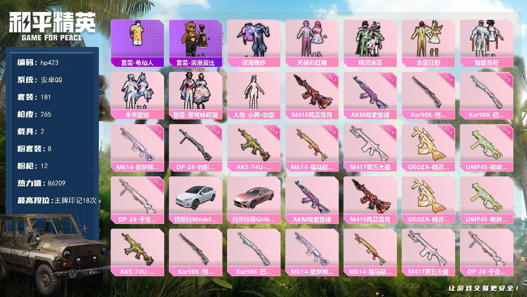 [17140020]安卓 手Q-8粉装-12特效枪-2载具-8粉色飞行器-86209热力值-18王牌印记-181套装-265枪皮 【热门品类】:套装-龟仙人,套装-浪漫波比 【粉色套装】:粉装-深海曼妙,粉装-天使彩虹糖,粉装-精灵迷巫,粉装-金属狂野,粉装-智能音符,粉装-未来歌姬,粉装-星穹咏叹调,人物-小舞·恋语 【粉色枪皮等级】:AKM-炫紫旋律(七级),M416-风花雪月(七级),GROZA-精灵之光(三级),UMP45-萌骑冒险(二级),AKS-74U-森灵之息(五级),Kar98K-创世·救赎(六级),Kar98K-巳巳如意(五级),Mk14-甜梦熊击(五级),Mk14-福马献瑞(五级),M417-第五大道(四级),DP-28-千金淑猫(一级),DP-28-豹影疾电(五级) 【粉色载具】:特斯拉Model X(珍珠白),玛莎拉蒂Ghibli(粉) 【粉色枪皮】:AKM-炫紫旋律,M416-风花雪月,GROZA-精灵之光,UMP45-萌骑冒险,AKS-74U-森灵之息,Kar98K-创世·救赎,Kar98K-巳巳如意,Mk14-甜梦熊击,Mk14-福马献瑞,M417-第五大道,DP-28-千金淑猫,DP-28-豹影疾电 【粉色飞行器】:炫彩糖果飞行器,春暖花开飞行器,沙丘之主天马,幻海精灵飞行器,曦光华影飞行器,凤舞九天飞行器,万象金身飞行器,圣域金龙飞行器 【粉色降落伞】:绝对恒星降落伞,甜心宝贝降落伞,精灵迷巫降落伞,炫紫旋律降落伞,PEL轰鸣竞梦者降落伞,神秘黑猫降落伞,第五大道降落伞,天星战神降落伞,未来歌姬降落伞,金蛇镇世降落伞,星穹咏叹调降落伞,炫彩糖果降落伞,小舞降落伞 【稀有套装】:套装-龟仙人,套装-巳巳如意,套装-炫彩糖果,套装-马上来财,套装-糖糖葫芦,套装-青团波波,套装-棉花软糖,角色-都市丽猫,套装-燕燕于飞,套装-鱼渊荷华,角色-海琴烟,套装-晶辉守护,套装-紫幽梦,套装-蓝冰羽,角色-瑰梦爱神,套装-书海巡游,套装-画境星梦,套装-琴音绮想,角色-霜刃之御,角色-鎏光妙舞,套装-雨过天青,套装-红釉青花,角色-唐三 【稀有枪皮】:AUG-冰晶雪宝,AKM-冰凉西瓜,AKM-夜灯,AKM-天启纪元,AKM-破晓战魂,AKM-虎虎生威,AKM-霓虹街区,AKM-龙的传人,M16A4-幻世战舞者,M16A4-生命誓言,M16A4-红色方程式,SC