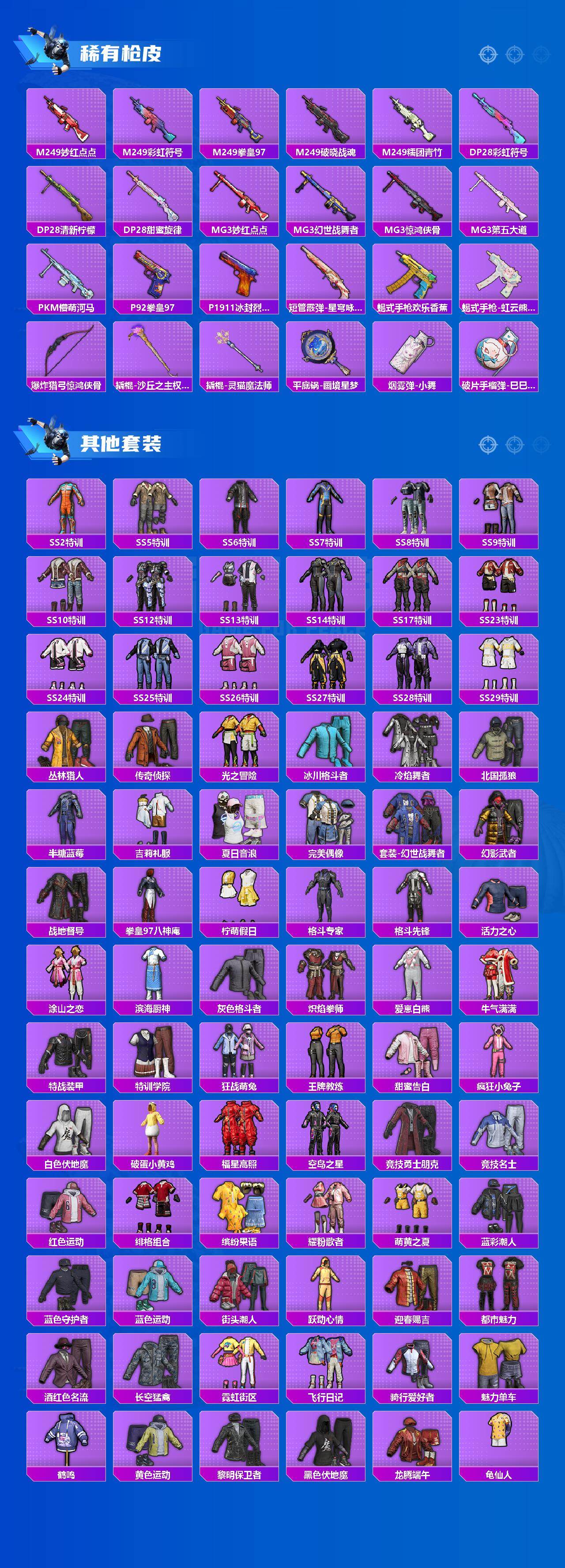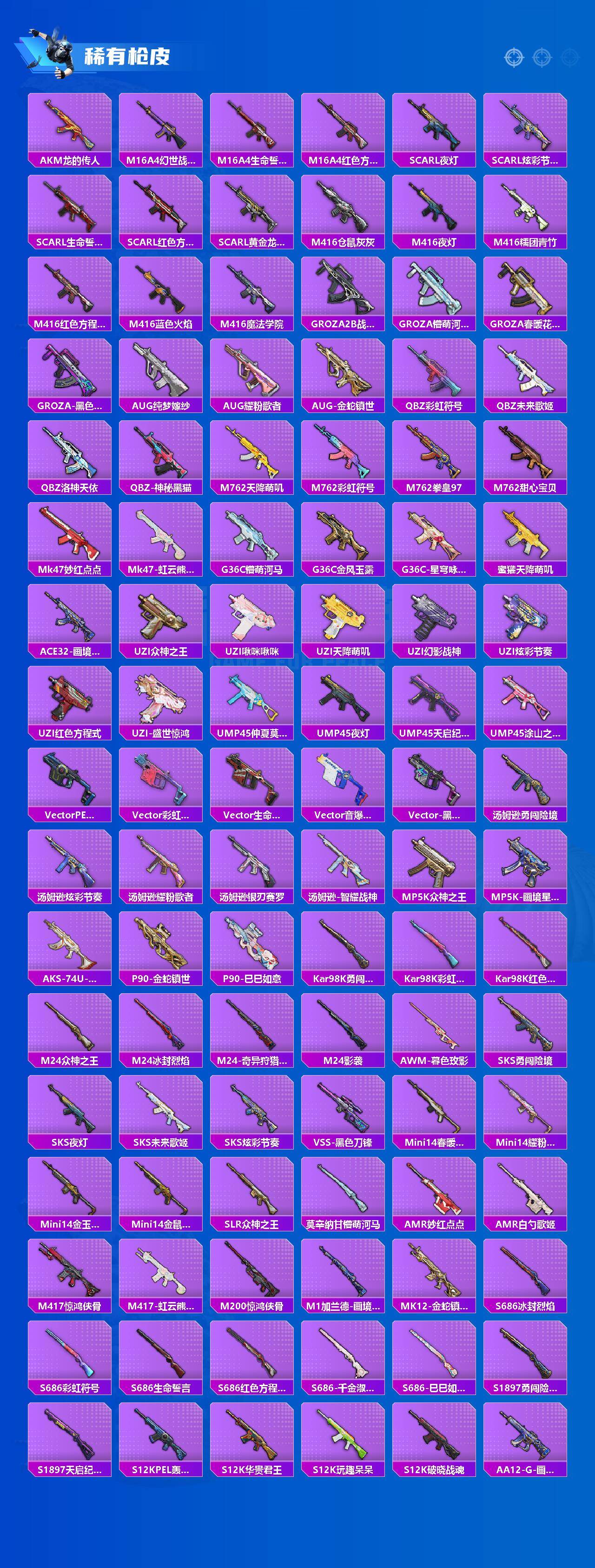【稀有枪皮】:AUG-冰晶雪宝,AKM-冰凉西瓜,AKM-夜灯,AKM-天启纪元,AKM-破晓战魂,AKM-虎虎生威,AKM-霓虹街区,AKM-龙的传人,M16A4-幻世战舞者,M16A4-生命誓言,M16A4-红色方程式,SC